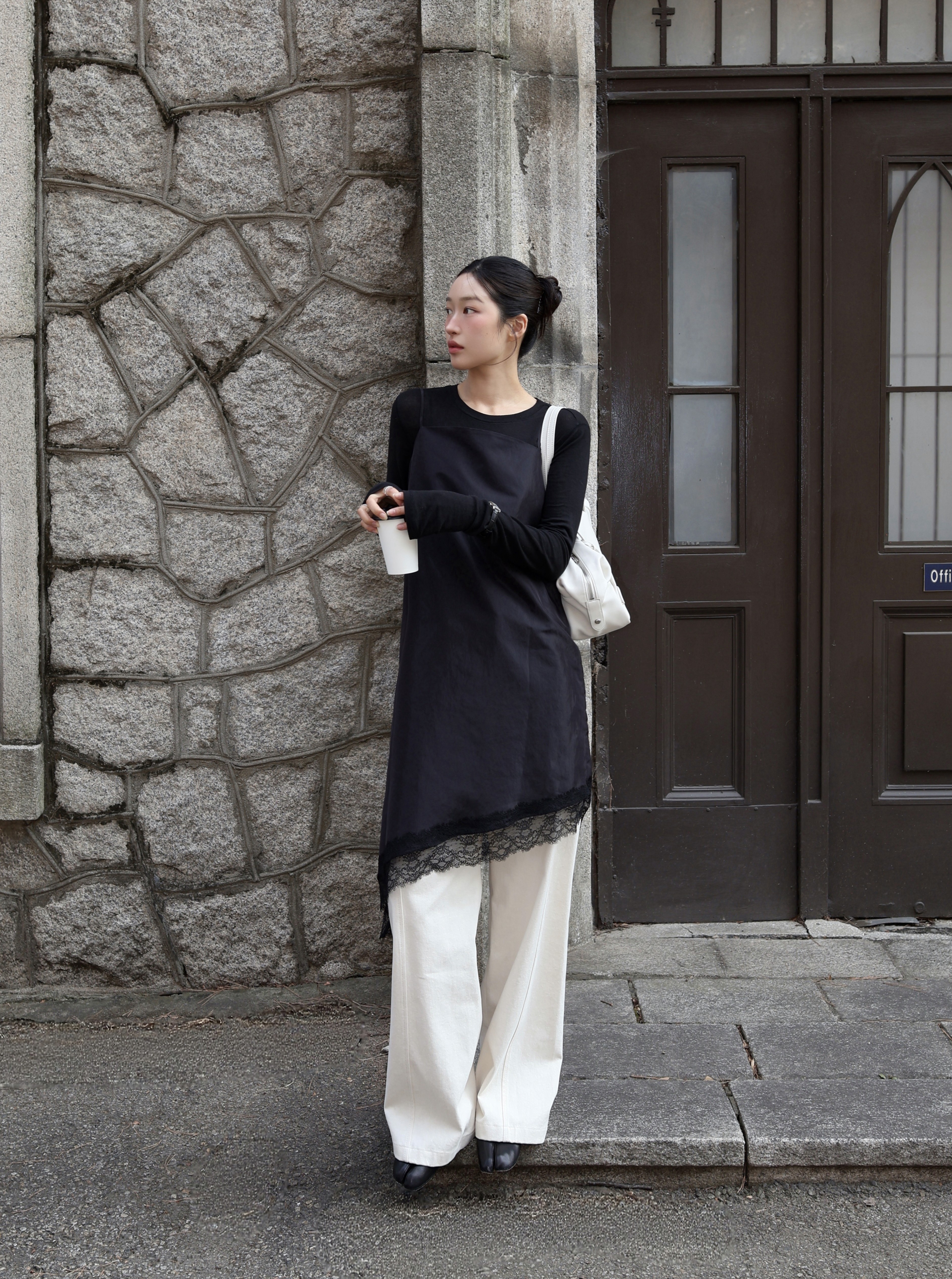 트랜디함과 세련미 가득한 레이어드 아이템, 비대칭 디자인과 밑단 레이스 디테일이 섬세한 무드를 자랑하는 슬리브리스 원피스입니다.