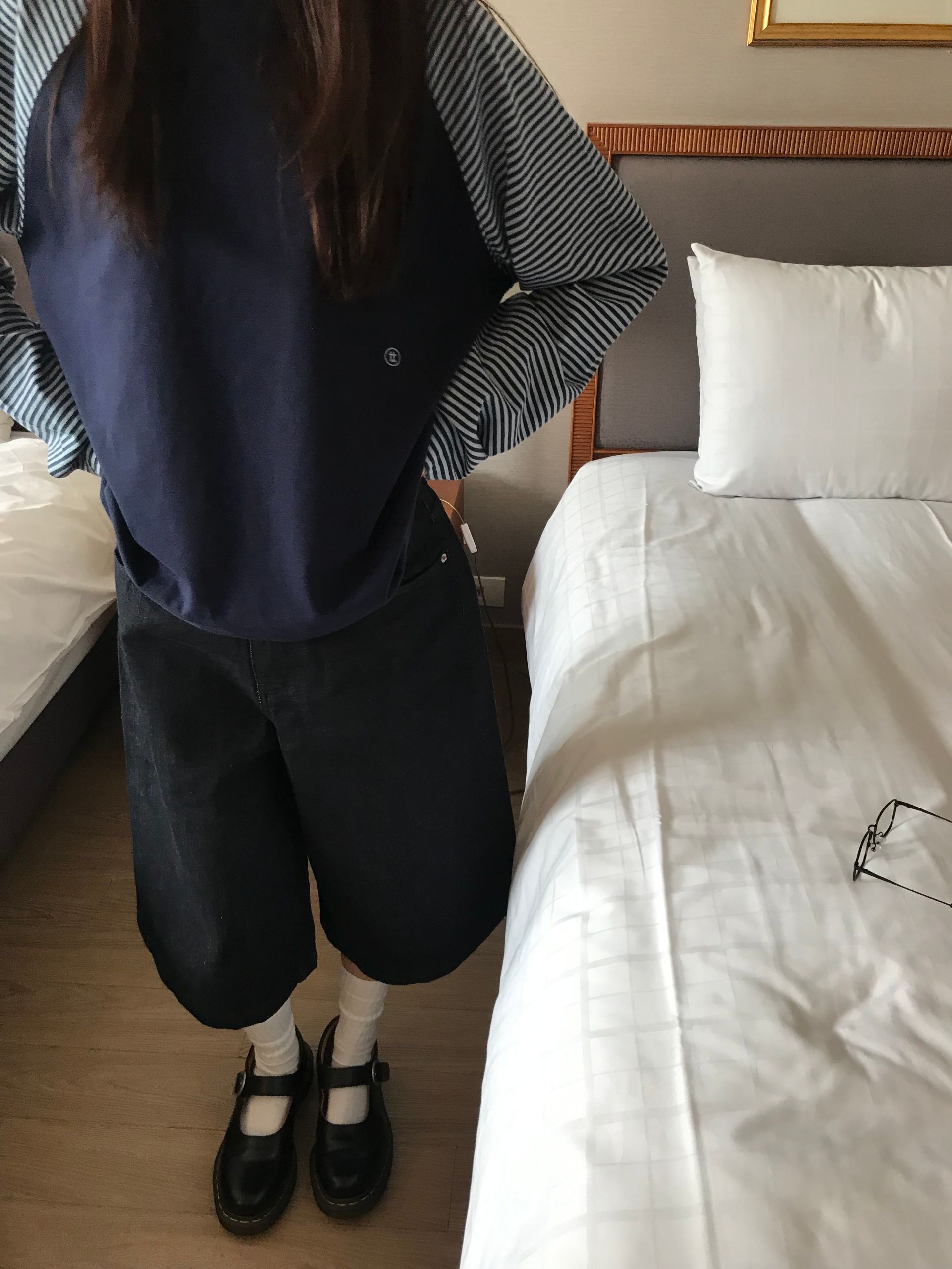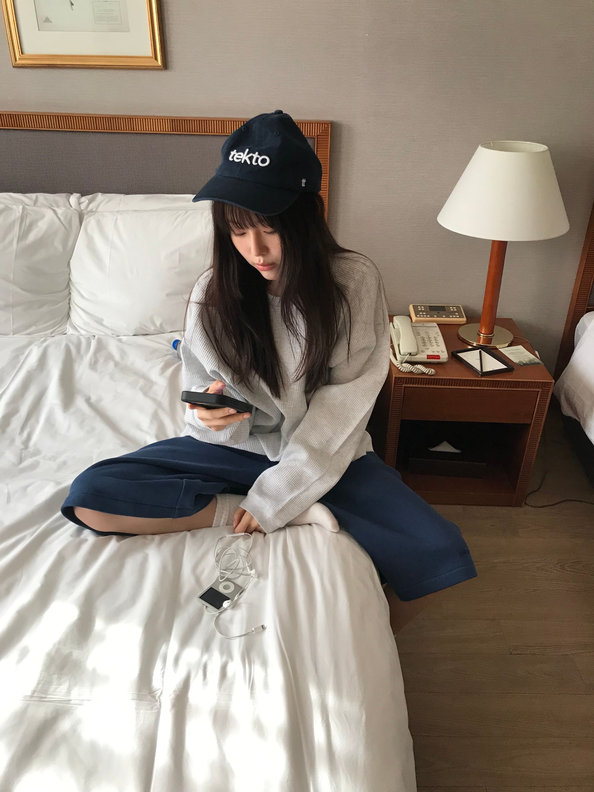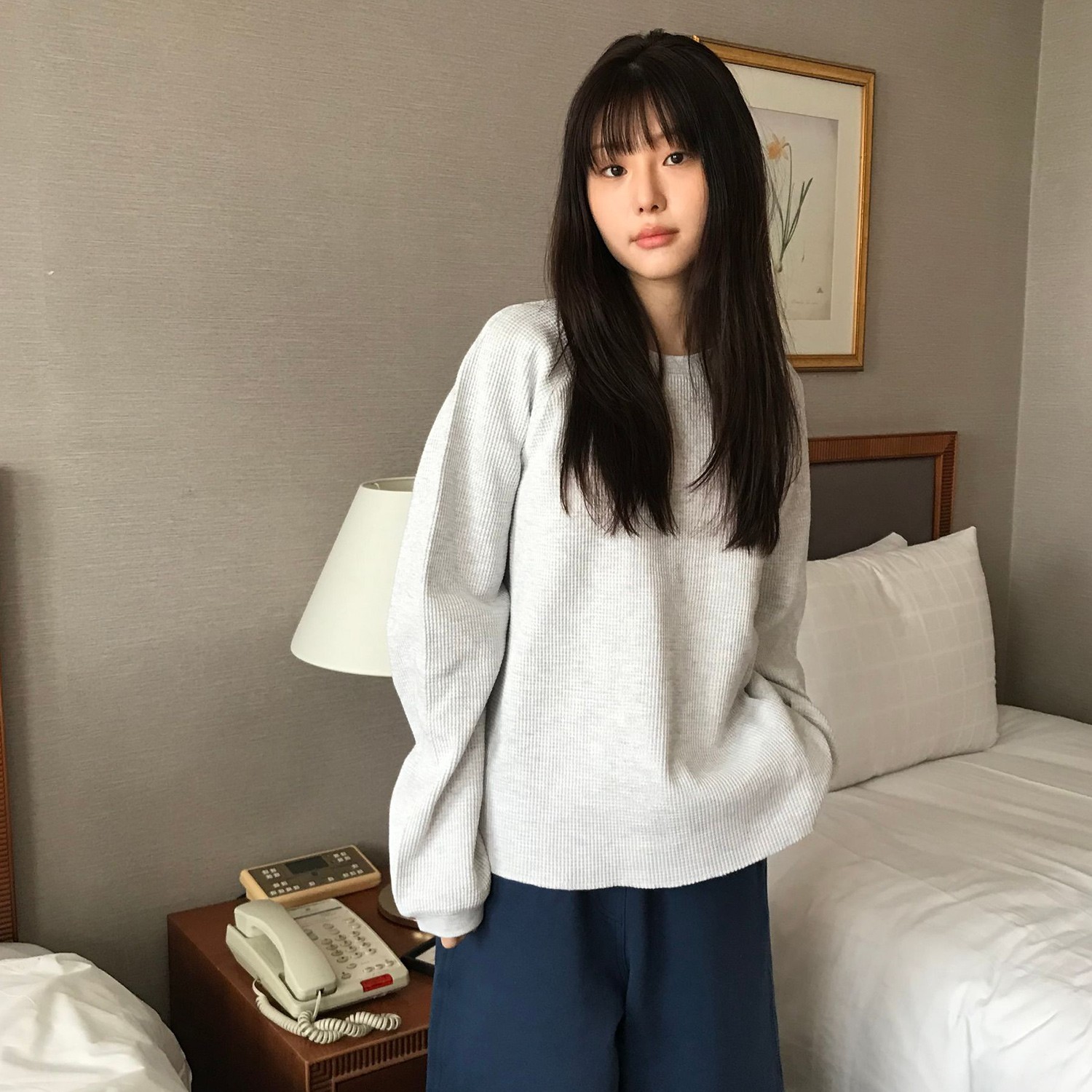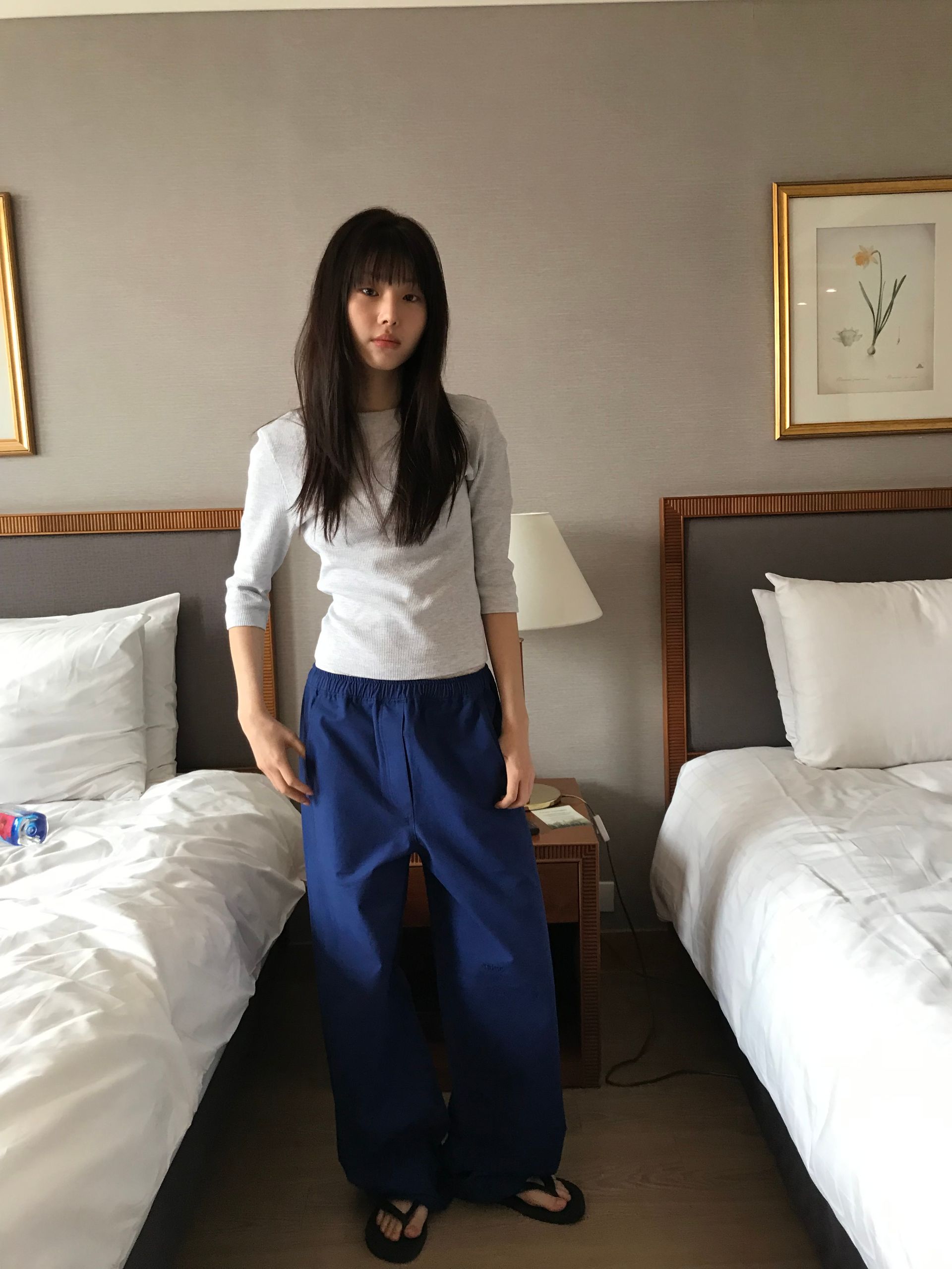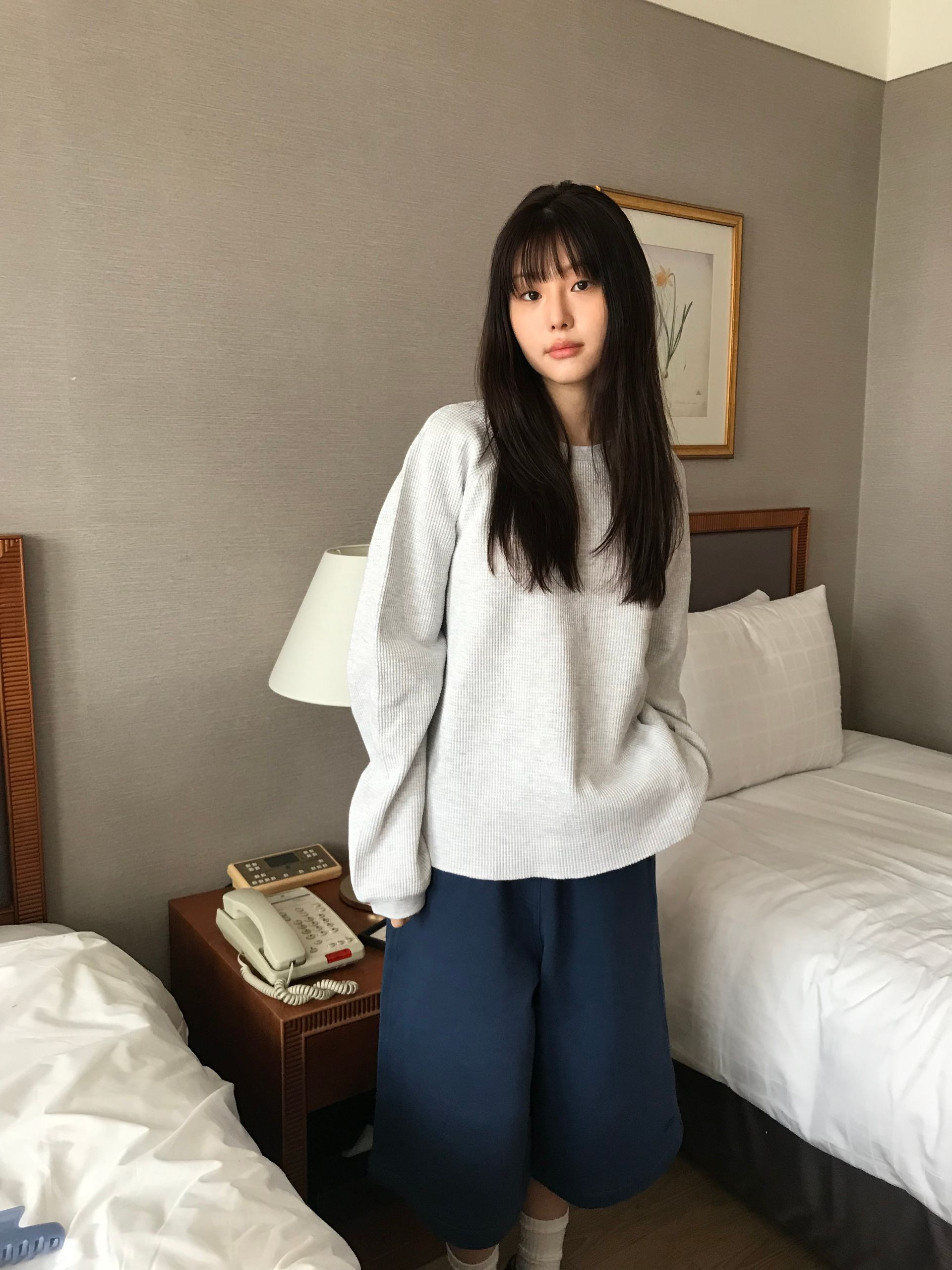 와플 소재의 7부티와 여유로운 핏의 코튼 밴딩 팬츠를 매치하여 캐주얼한 무드를 완성했습니다.