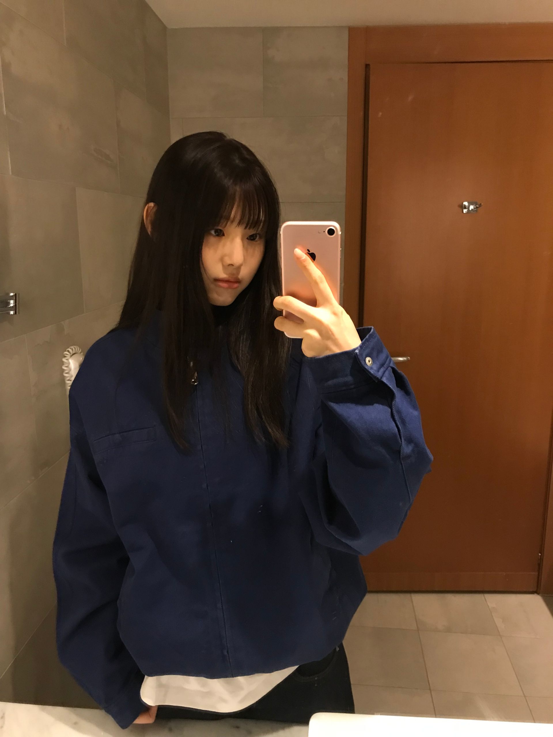 클래식한 빈티지 워싱 색감이 매력적인 코튼 블루종 자켓와 커브드한 실루엣의 데님 팬츠 코디입니다.