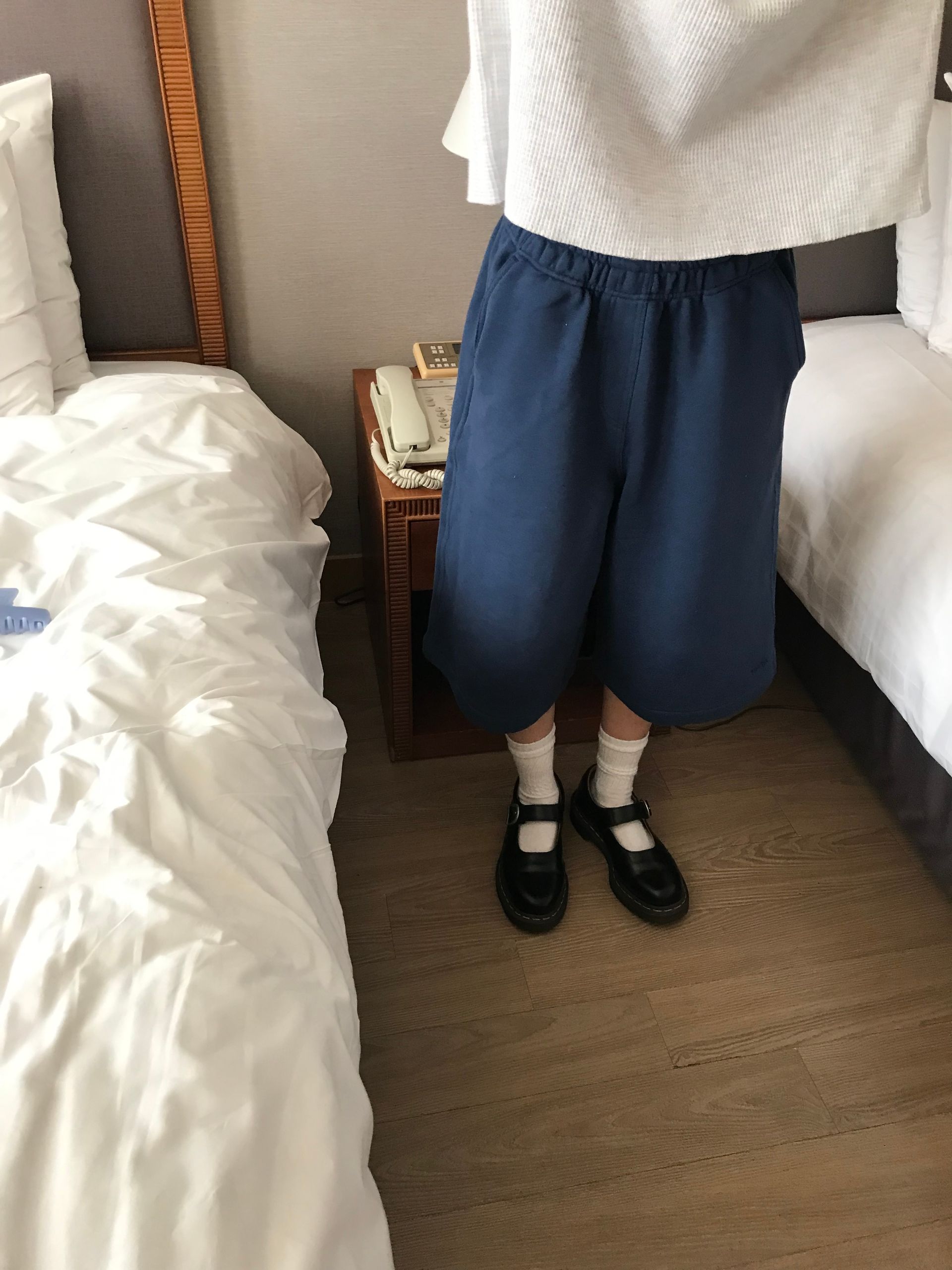 여유로운 실루엣의 와플 티셔츠와 스웻 하프 쇼츠로 데일리 룩을 완성했습니다.