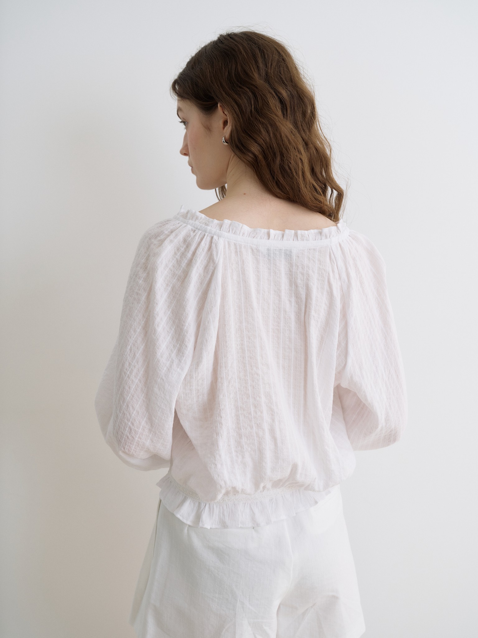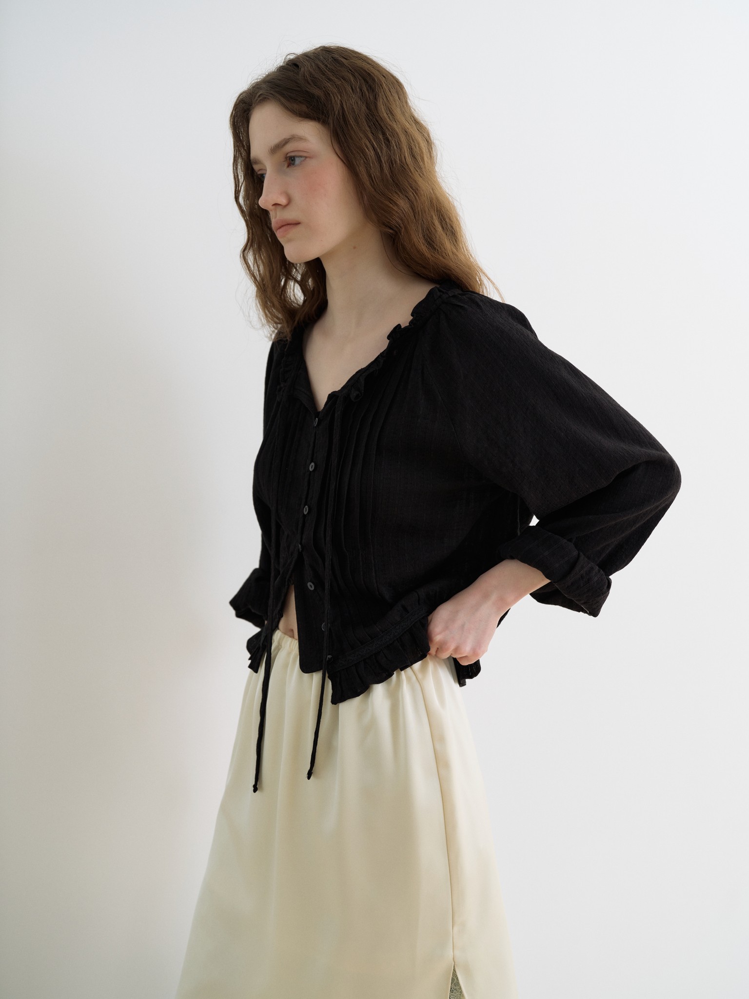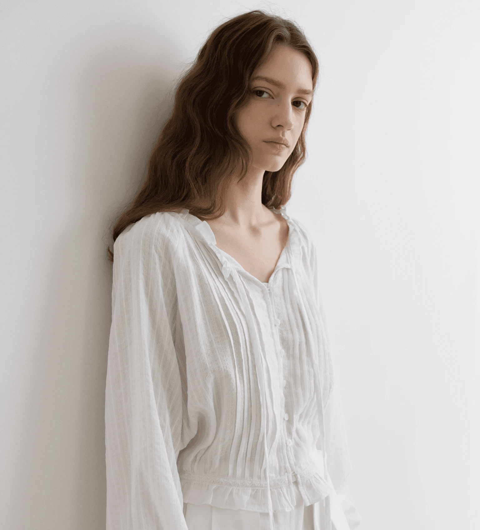 은은한 자수 원단이 돋보이는 핀턱 블라우스입니다. 넥과 밑단에 프릴 디테일과 셔링 디테일로 볼륨감 있는 실루엣이 연출됩니다.