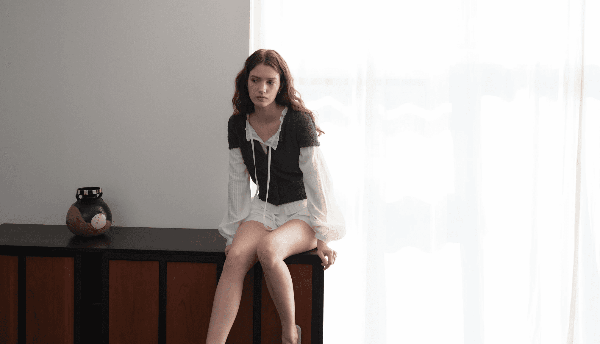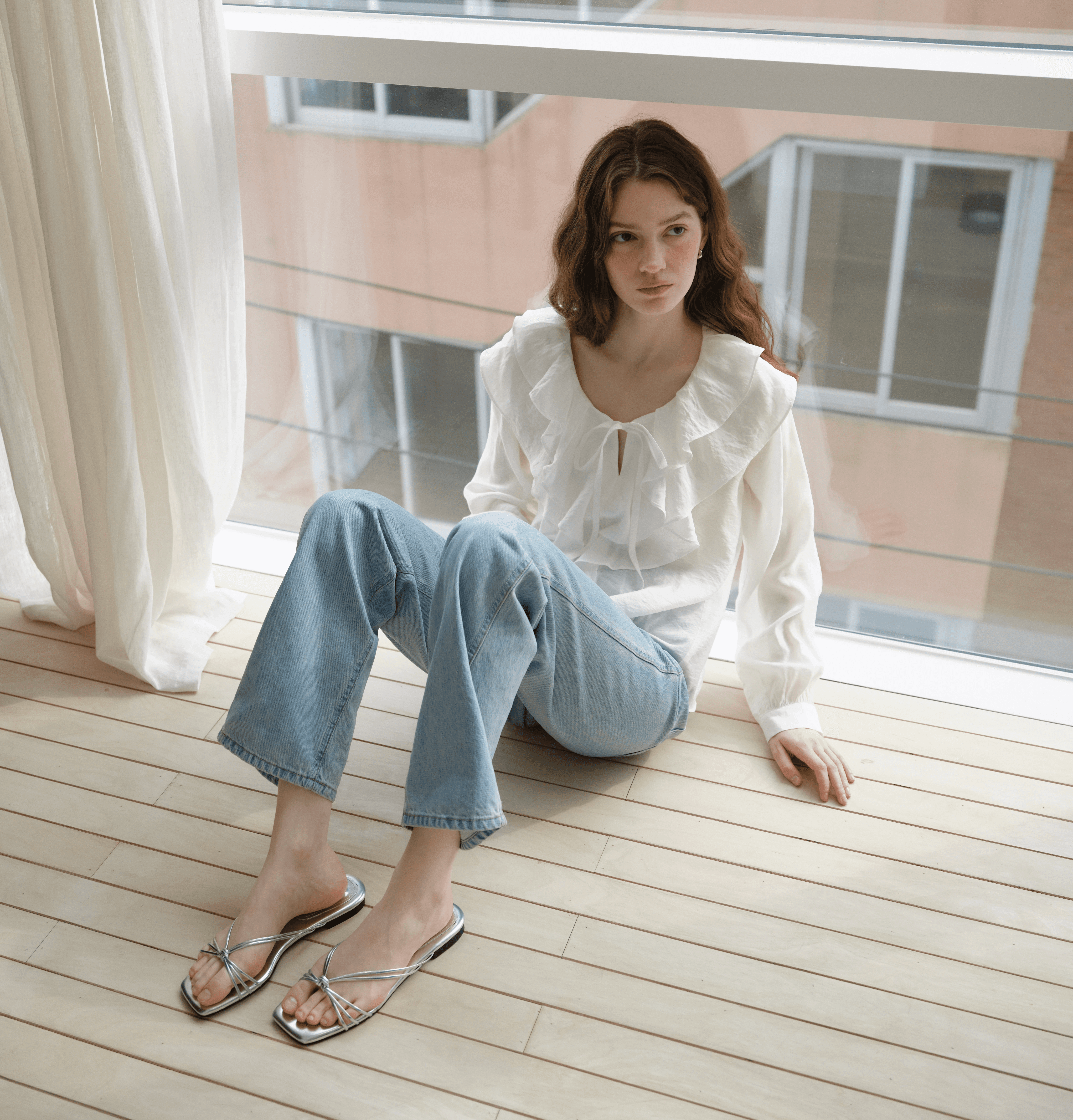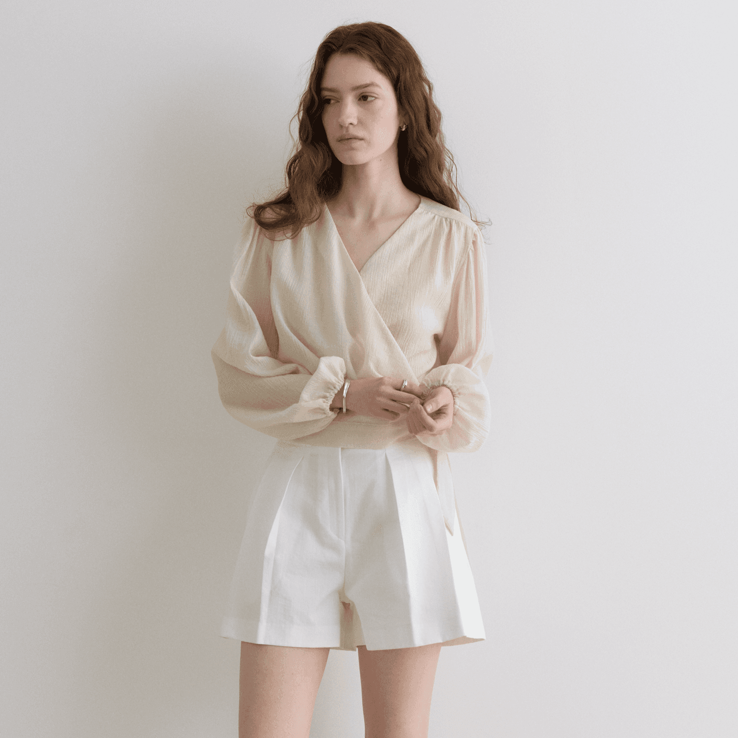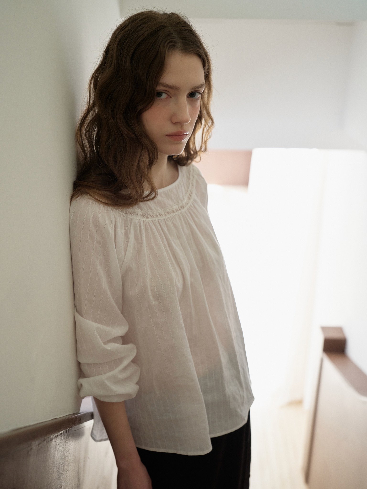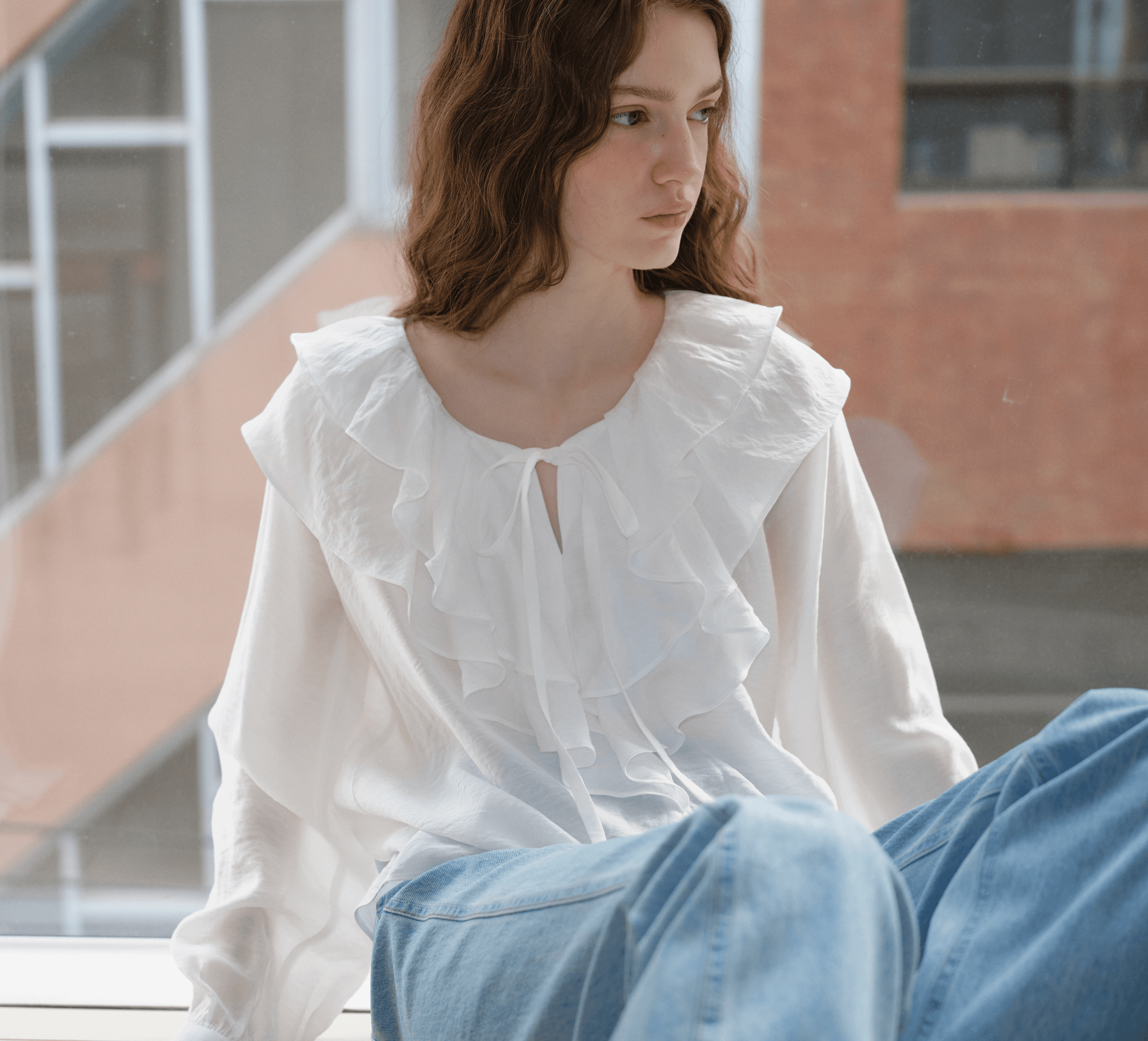 은은한 결감이 느껴지는 소재로 자연스럽게 흐르는 러플 블라우스입니다. 나일론사가 함유되어 내구성이 우수하고 구김이 적습니다.