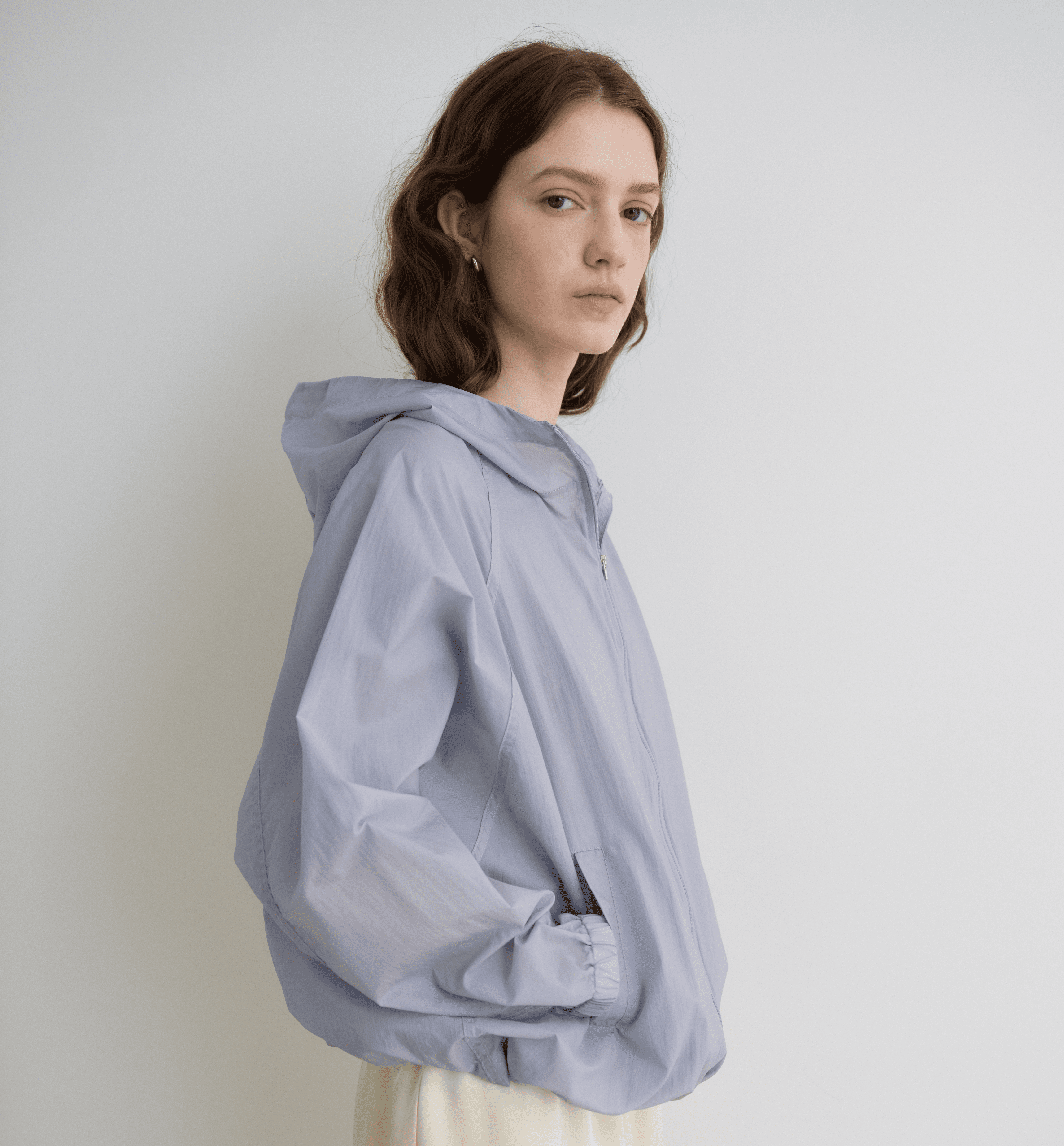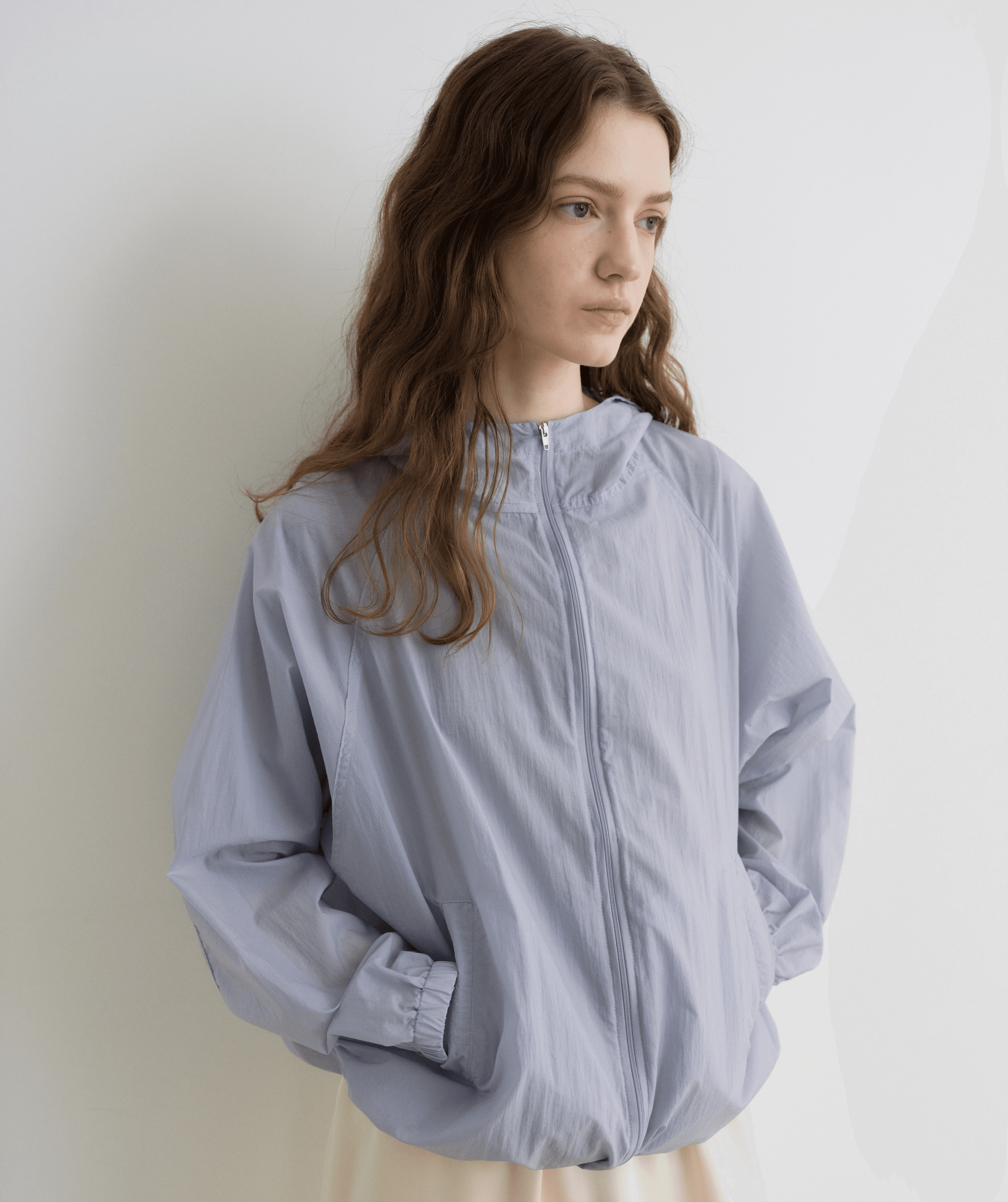 은은한 비침이 있는 소재로 제작한 셔링 후디 윈드브레이커입니다. 생활 방수가 가능하여 한여름까지 가볍게 걸치기 좋은 아이템입니다.