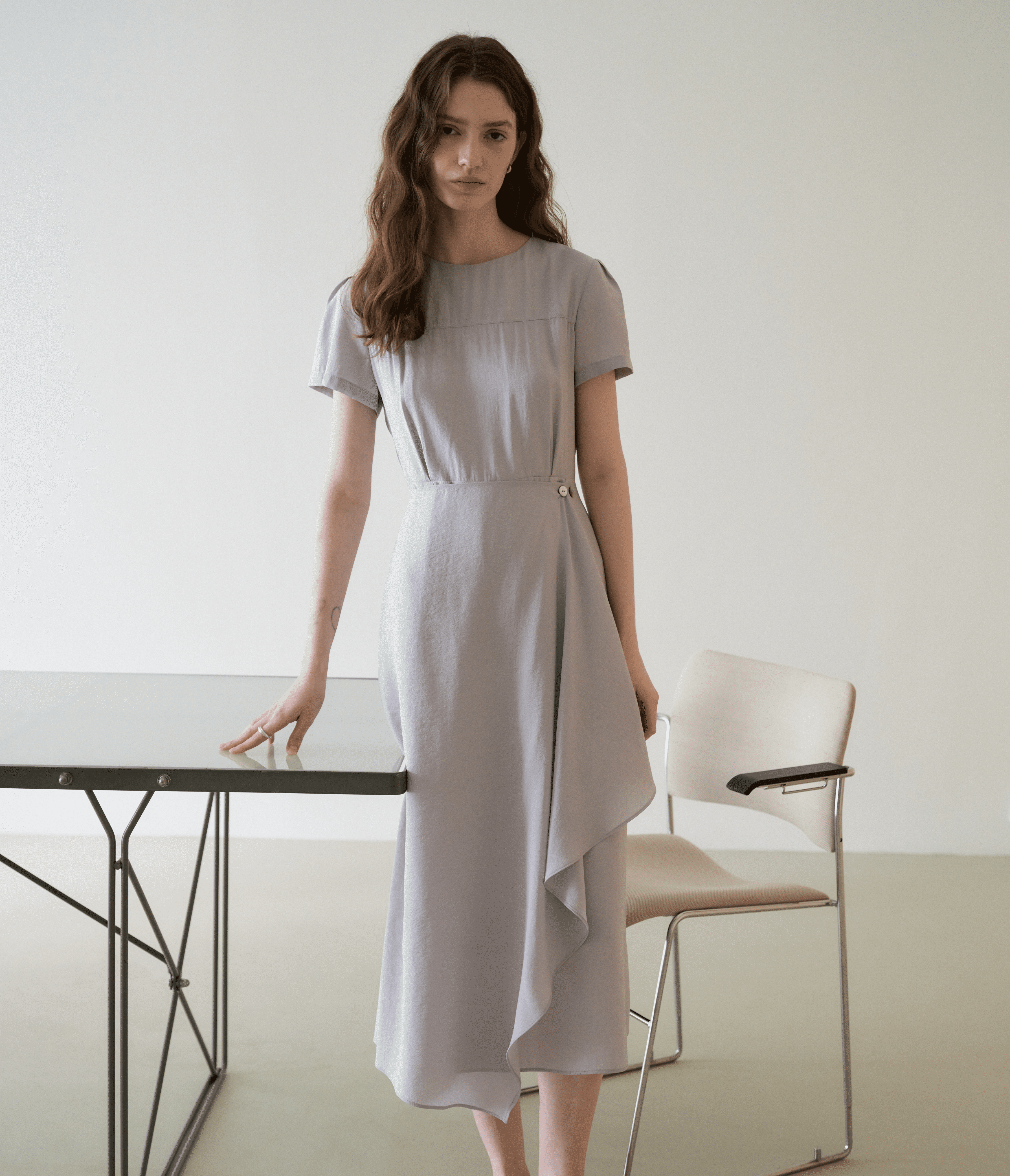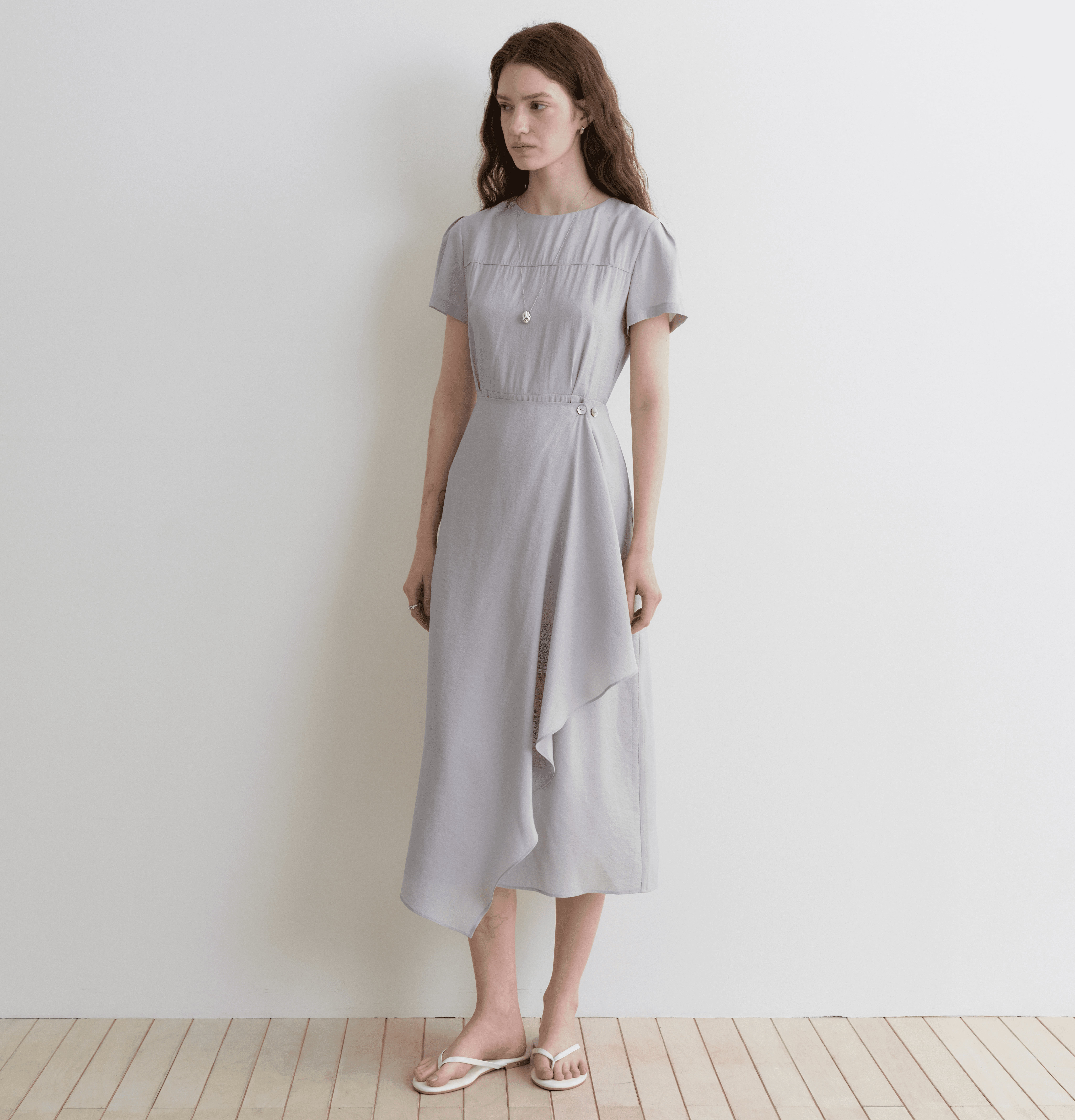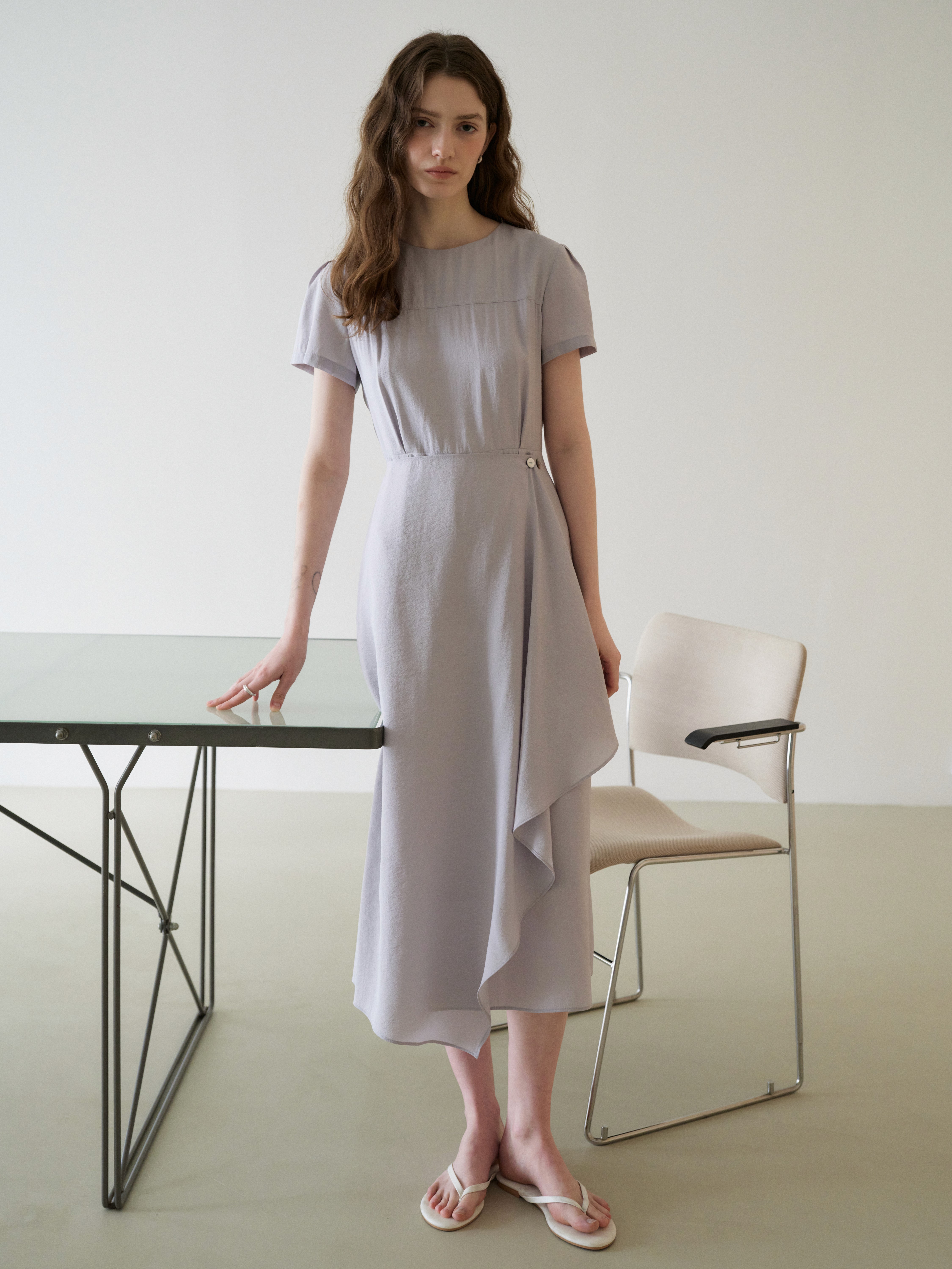 부드럽게 떨어지는 슬림한 실루엣이 돋보이는 드레스입니다. 허리 라인에 버튼 디테일로 미세한 사이즈 조절이 가능하며, 포인트가 되어줍니다.