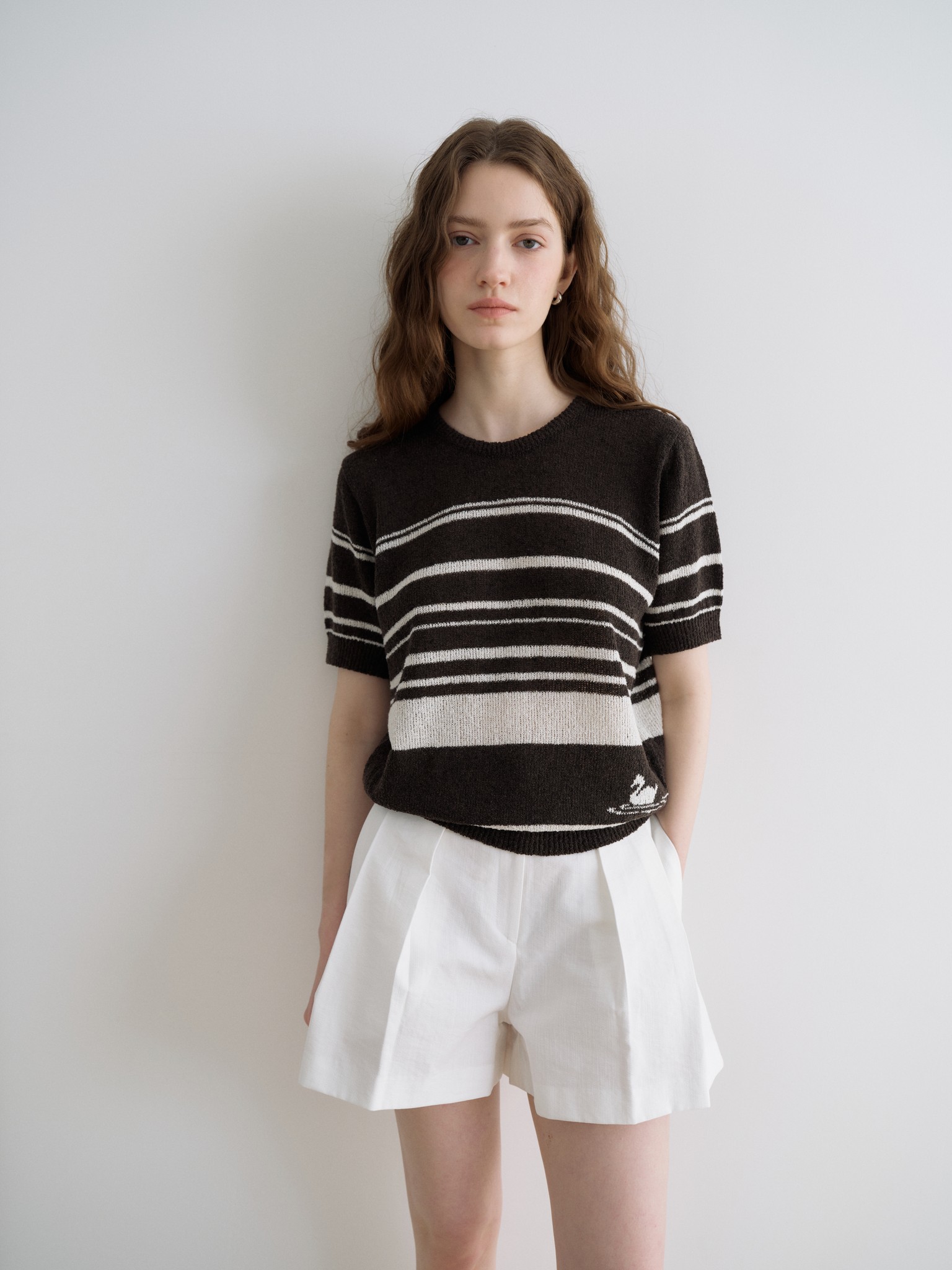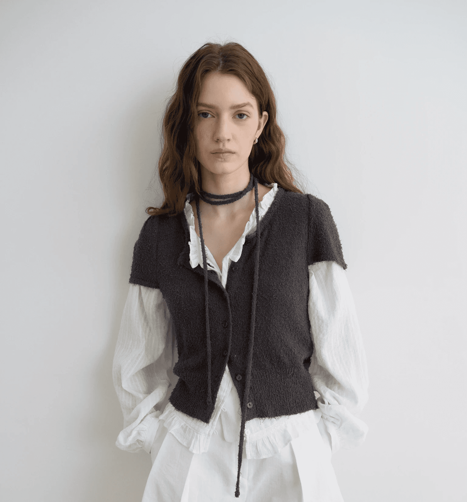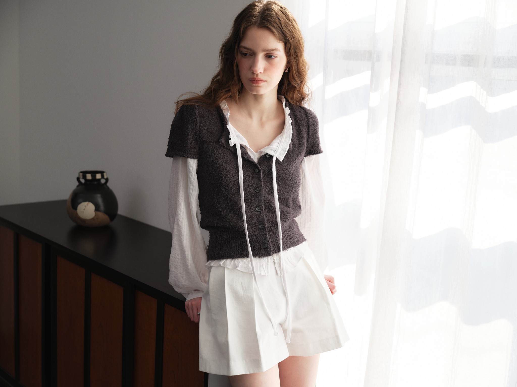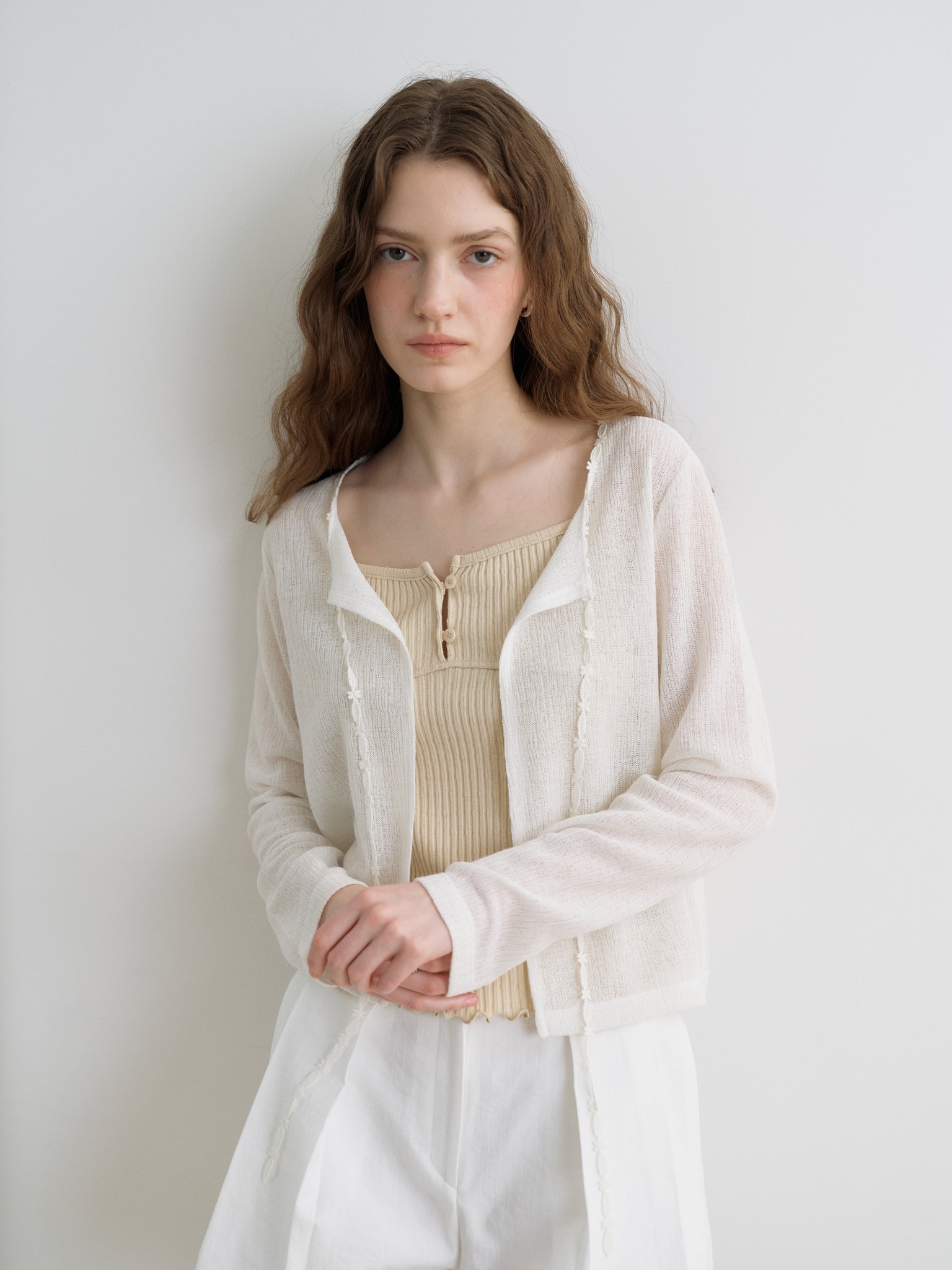 얇은 꼬리사 원사를 사용한 캡소매 반팔 가디건입니다. 얇은 스카프로 미니멀한 디자인에 페미닌한 포인트가 되어줍니다.