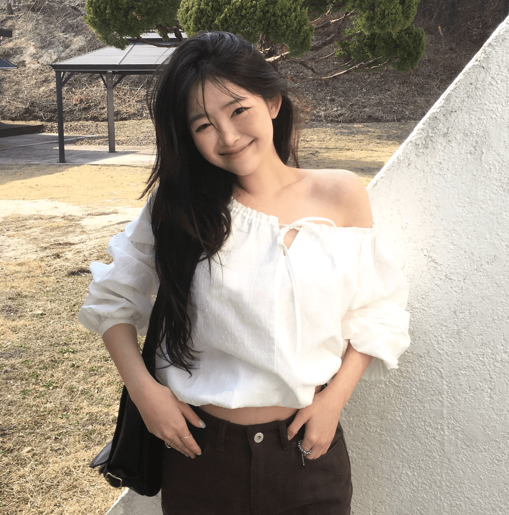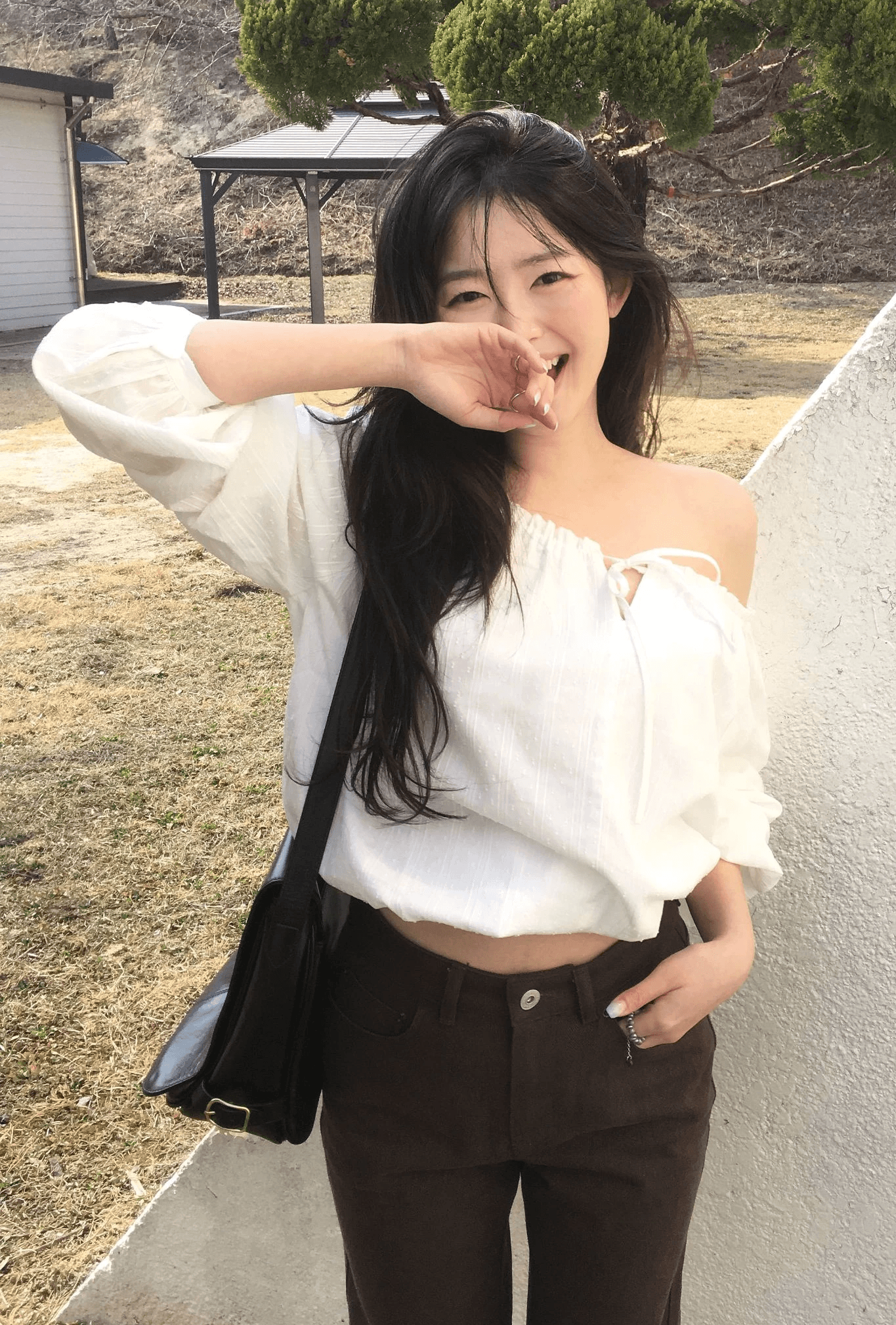 스트링으로 셔링을 만들어 착용할 수 있는 블라우스. 원단의 무늬가 귀여운 느낌을 주며 밑단 밴딩으로 아방한 스타일이 완성됩니다.