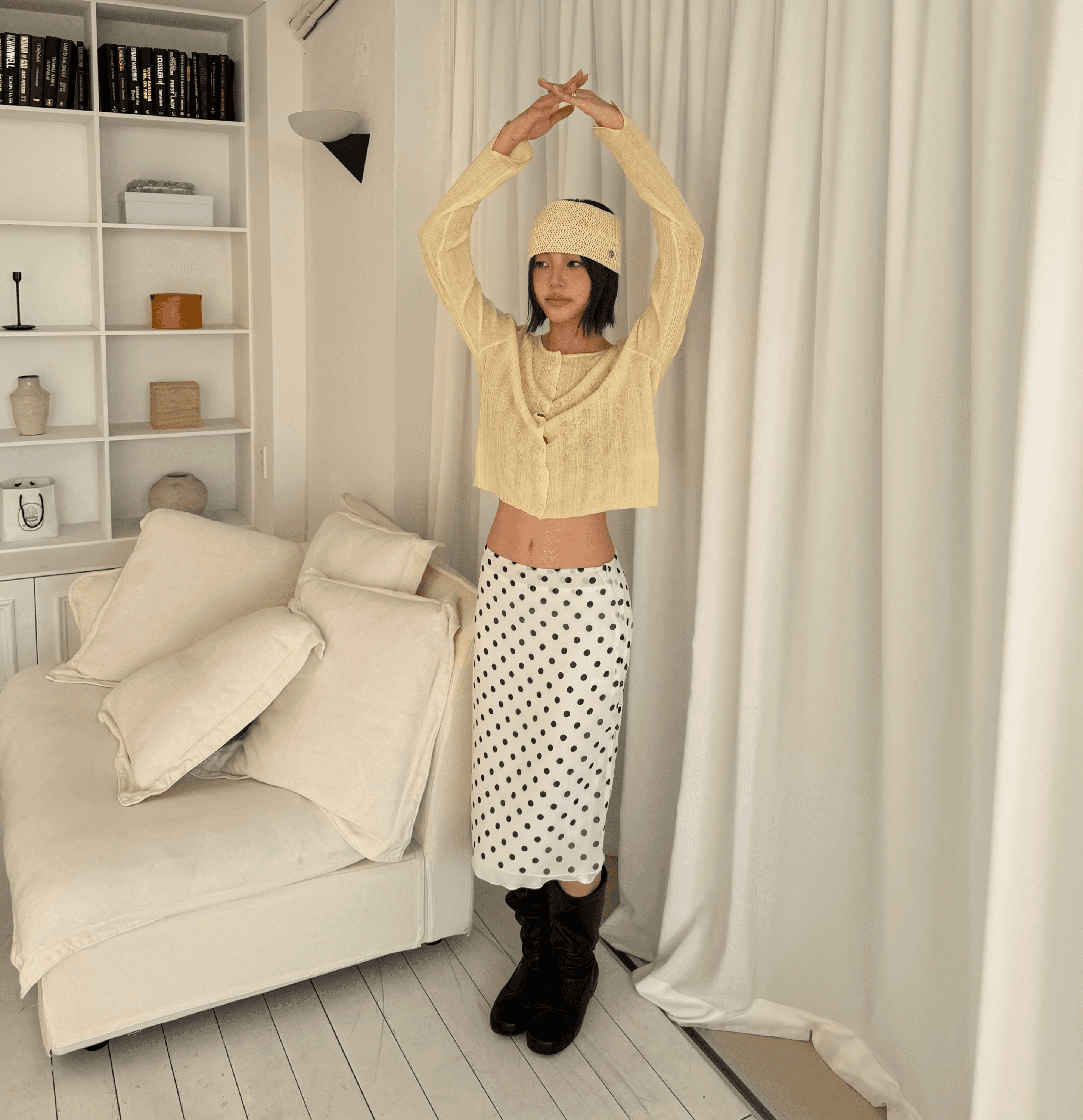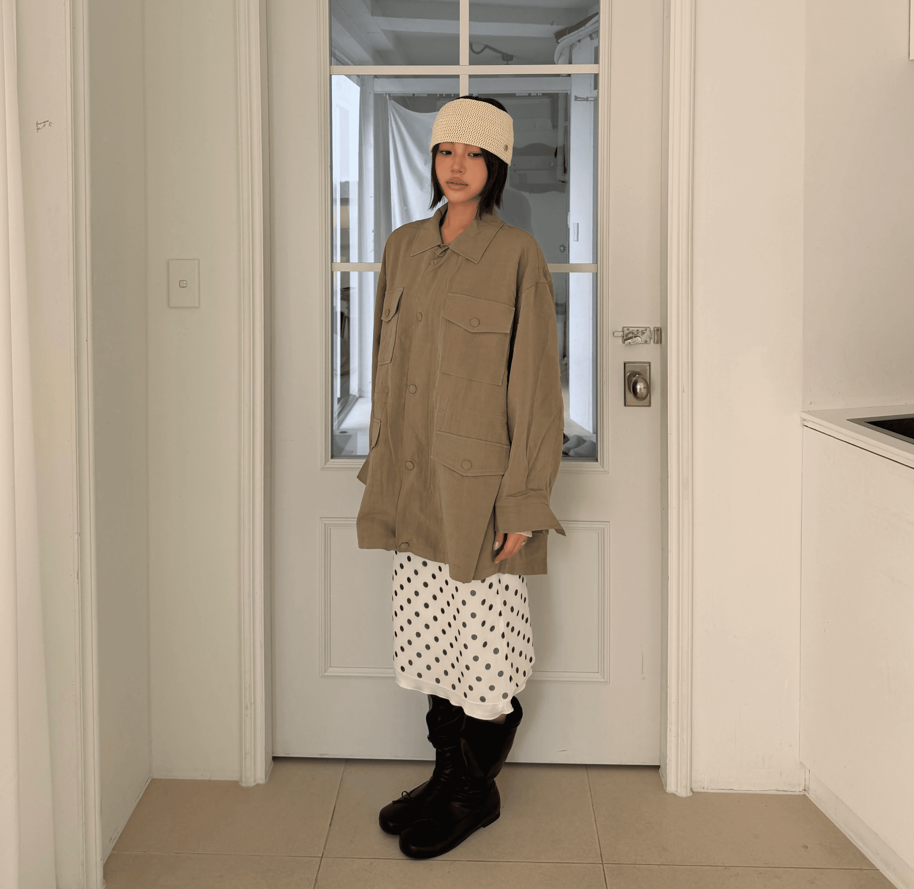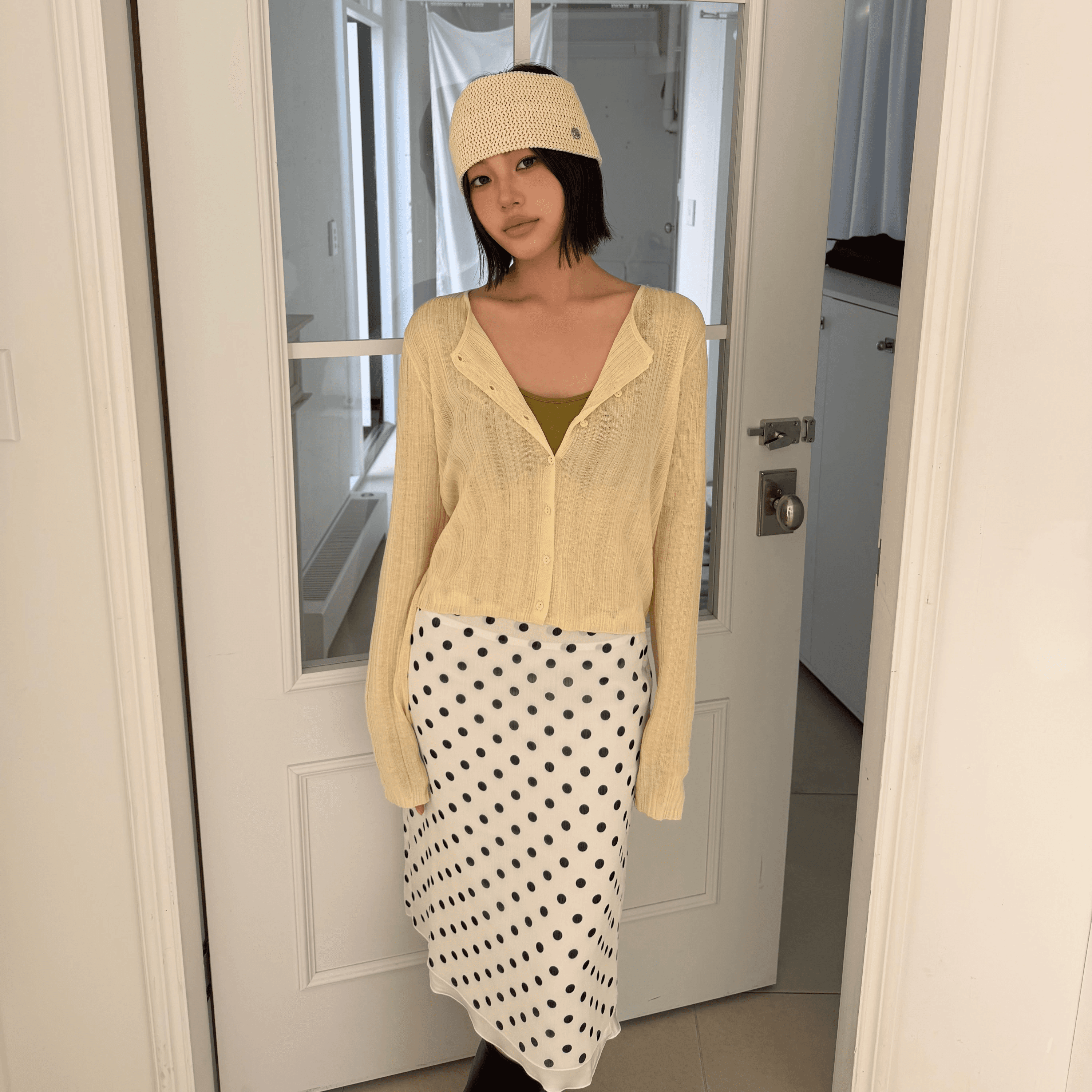 잔잔한 도트 패턴이 룩에 은은한 포인트를 더해주며 걸을 때마다 자연스럽게 흐르는 실루엣이 매력을 더해줍니다.