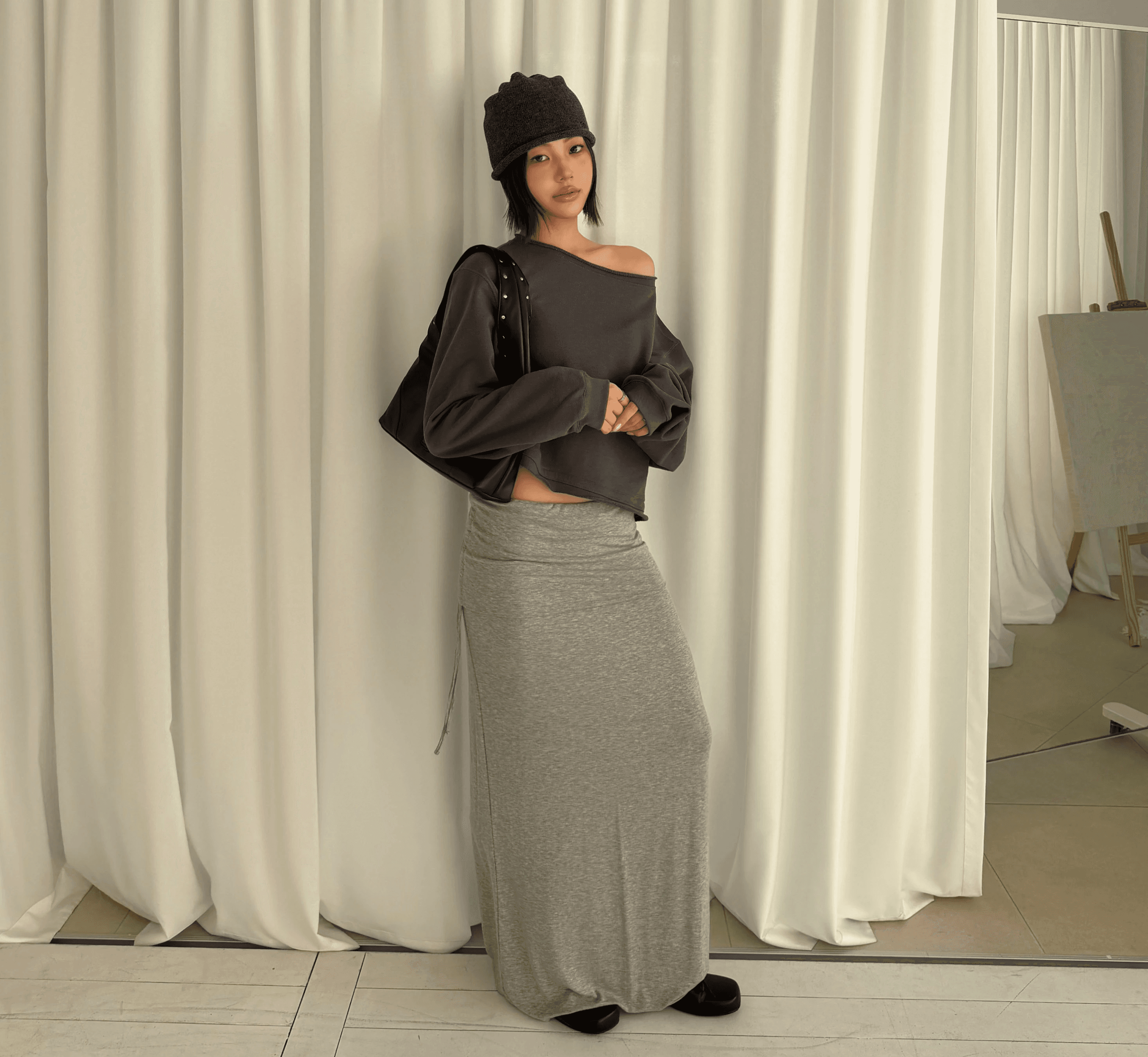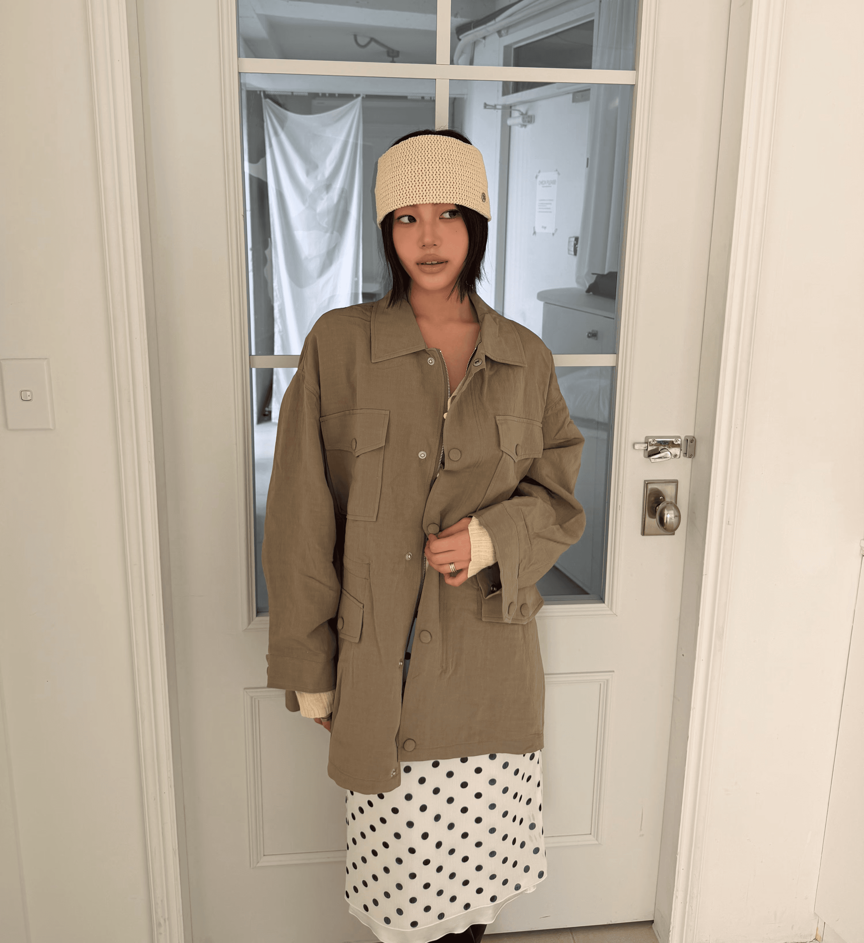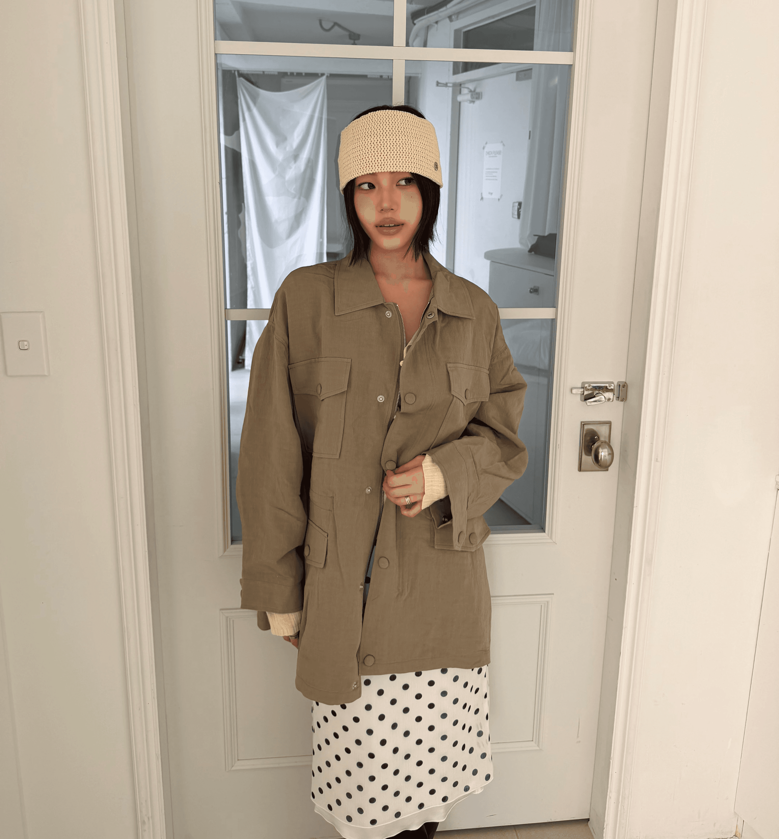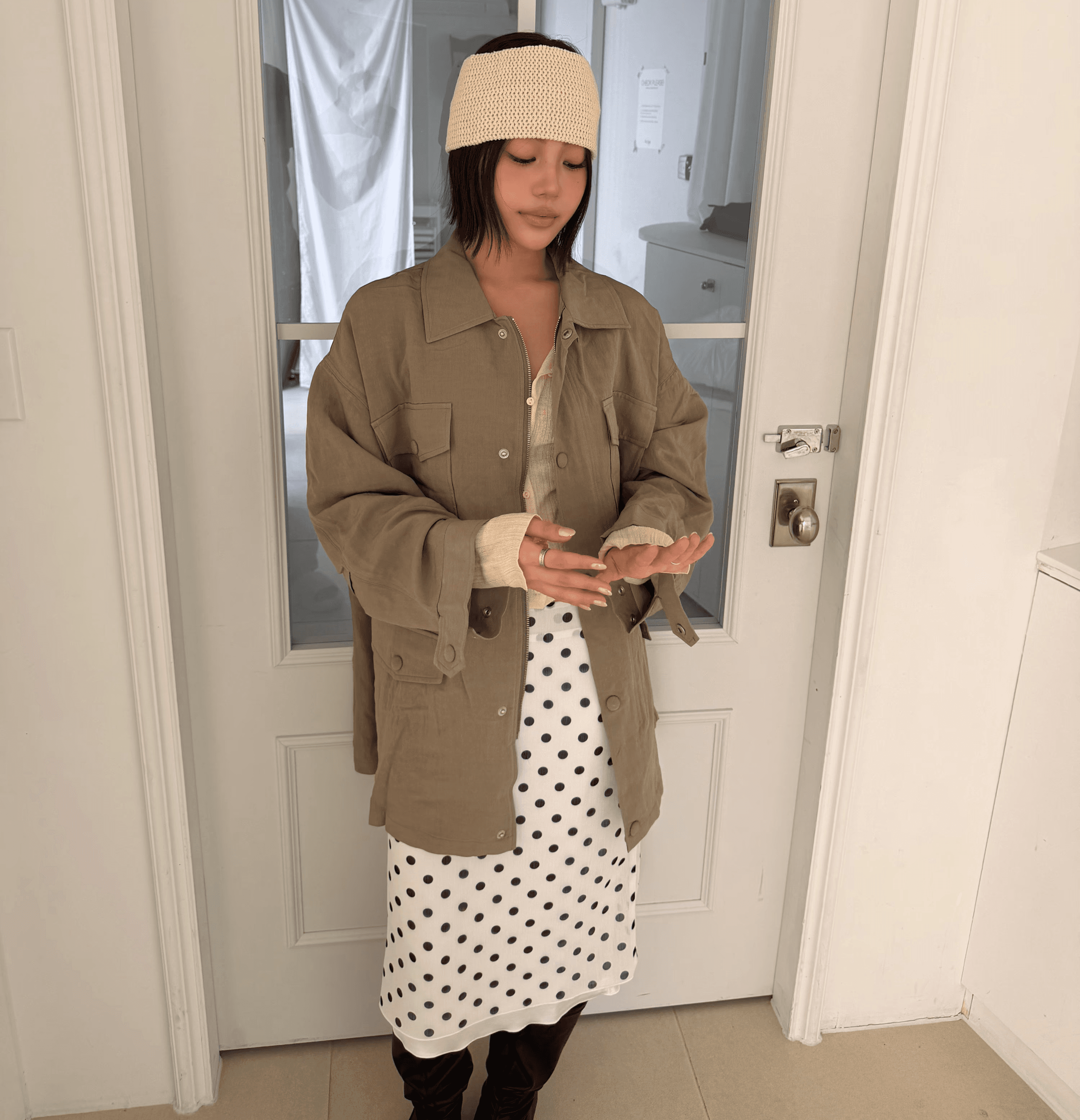 잔잔한 도트 패턴이 룩에 은은한 포인트를 더해주며 걸을 때마다 자연스럽게 흐르는 실루엣이 매력을 더해줍니다.