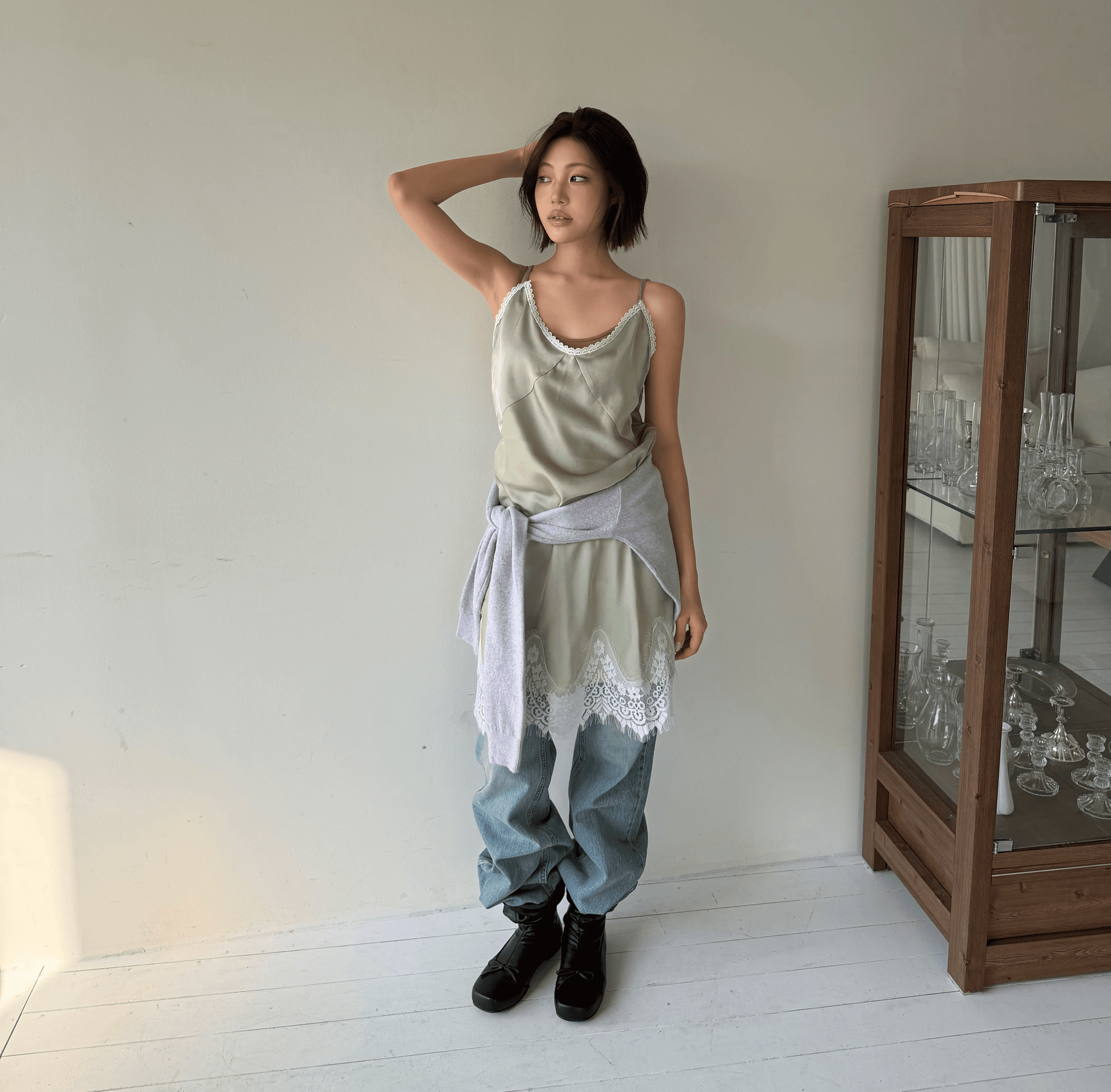 부드럽게 흐르는 드레이프가 몸선을 자연스럽게 감싸며, 은은한 광택감으로 봄을 표현한 사틴 원피스입니다.