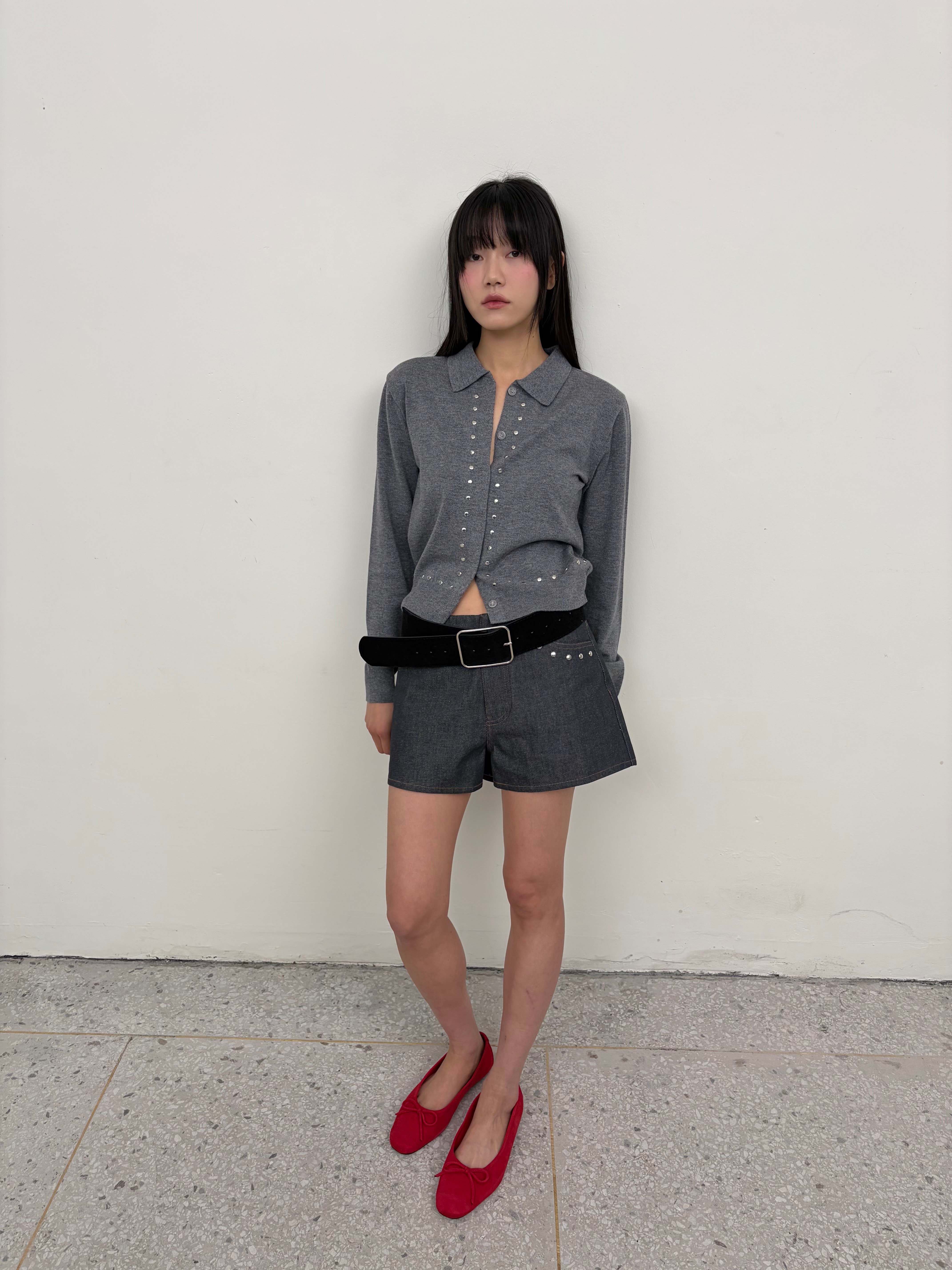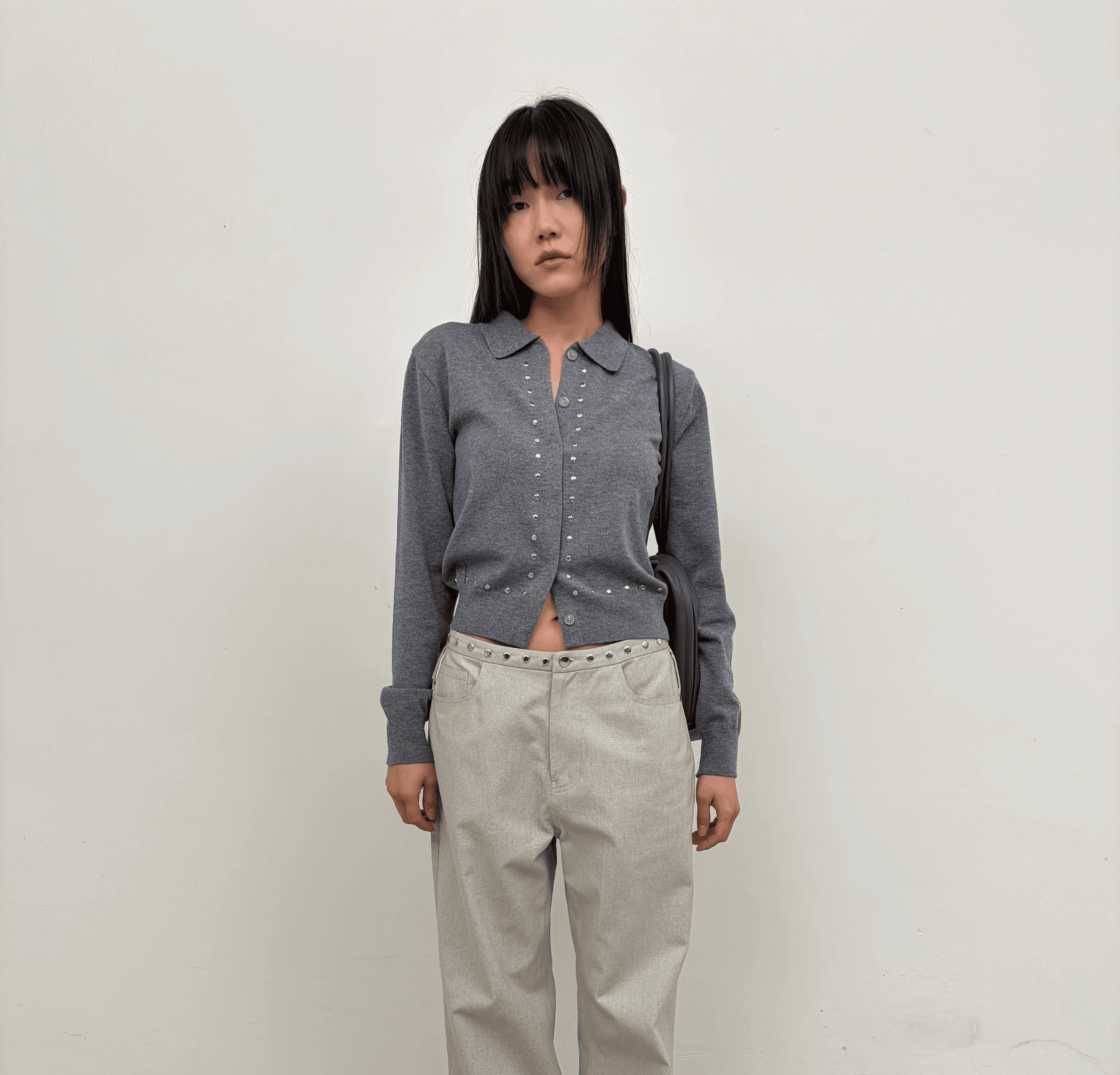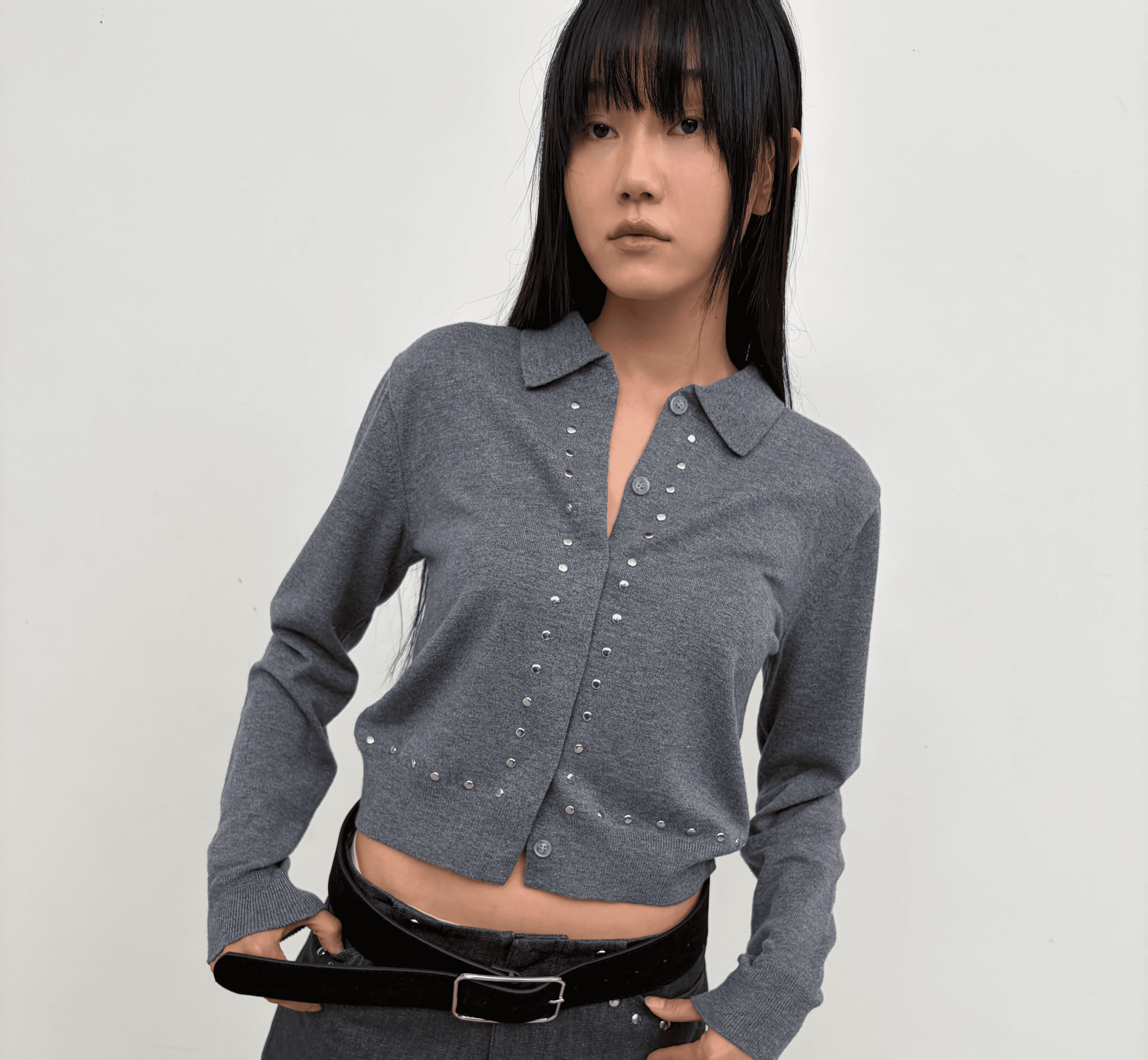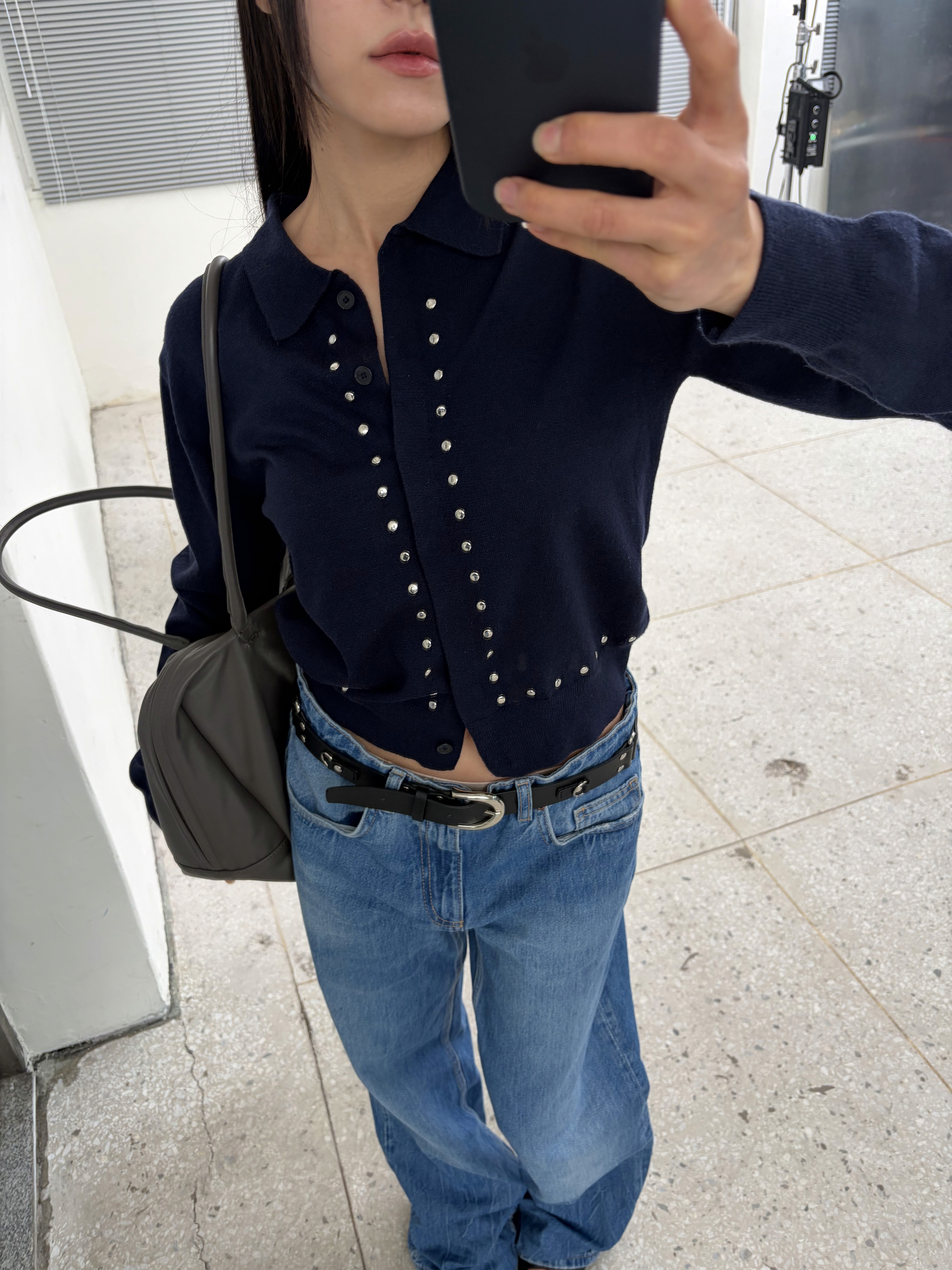 스터드 디테일의 카라 카디건으로 간절기에 착용하기 좋은 제품입니다.