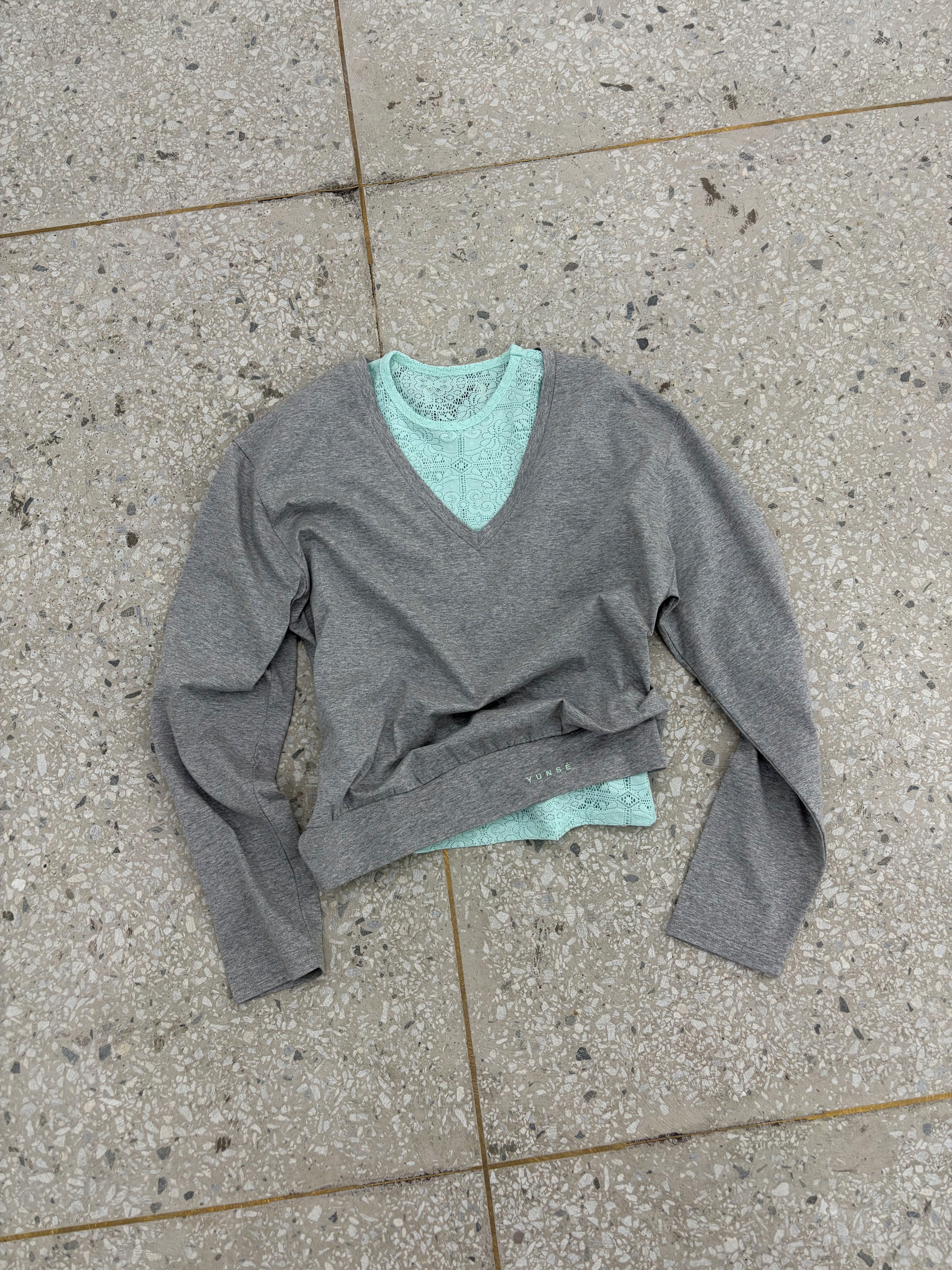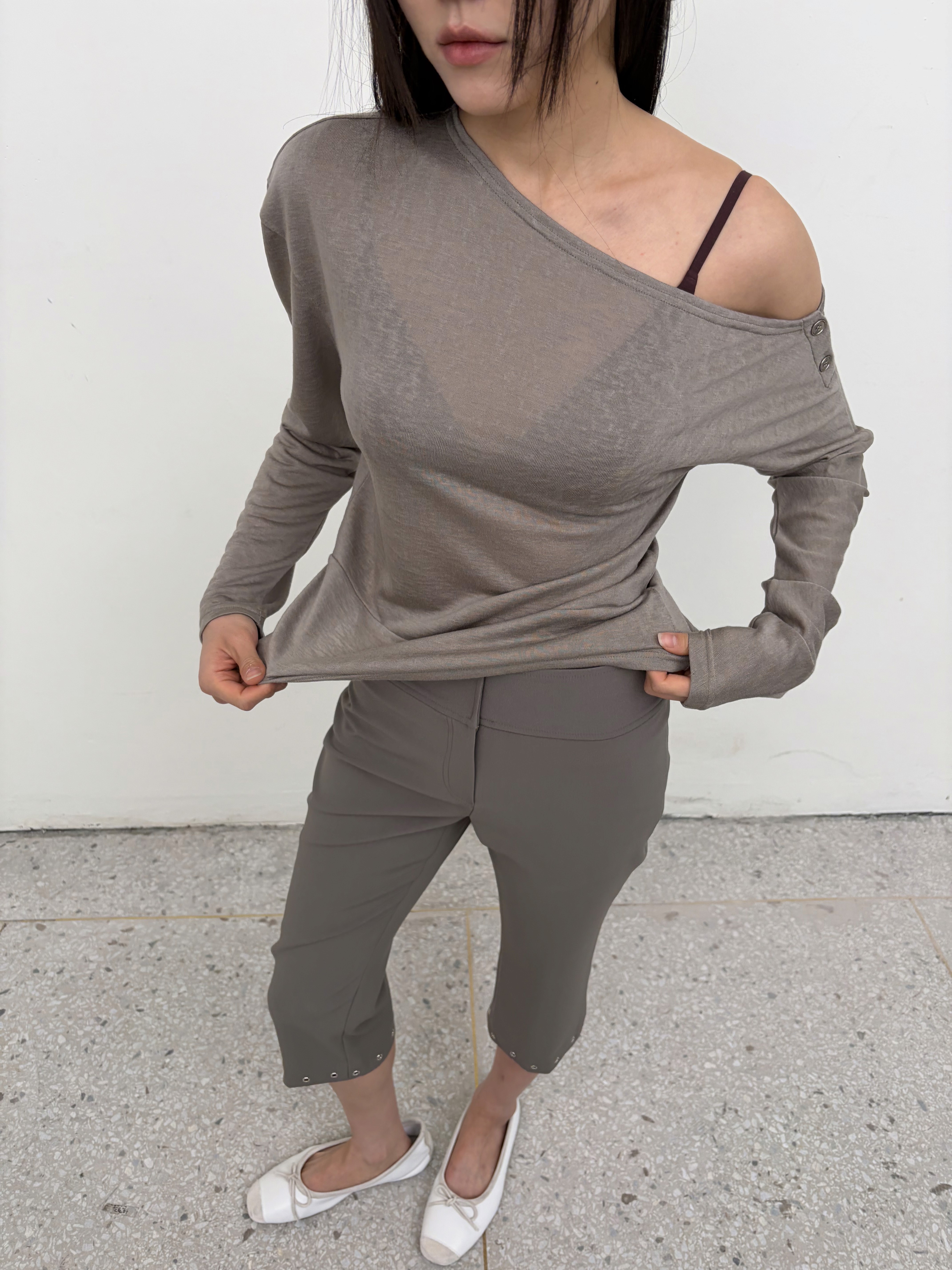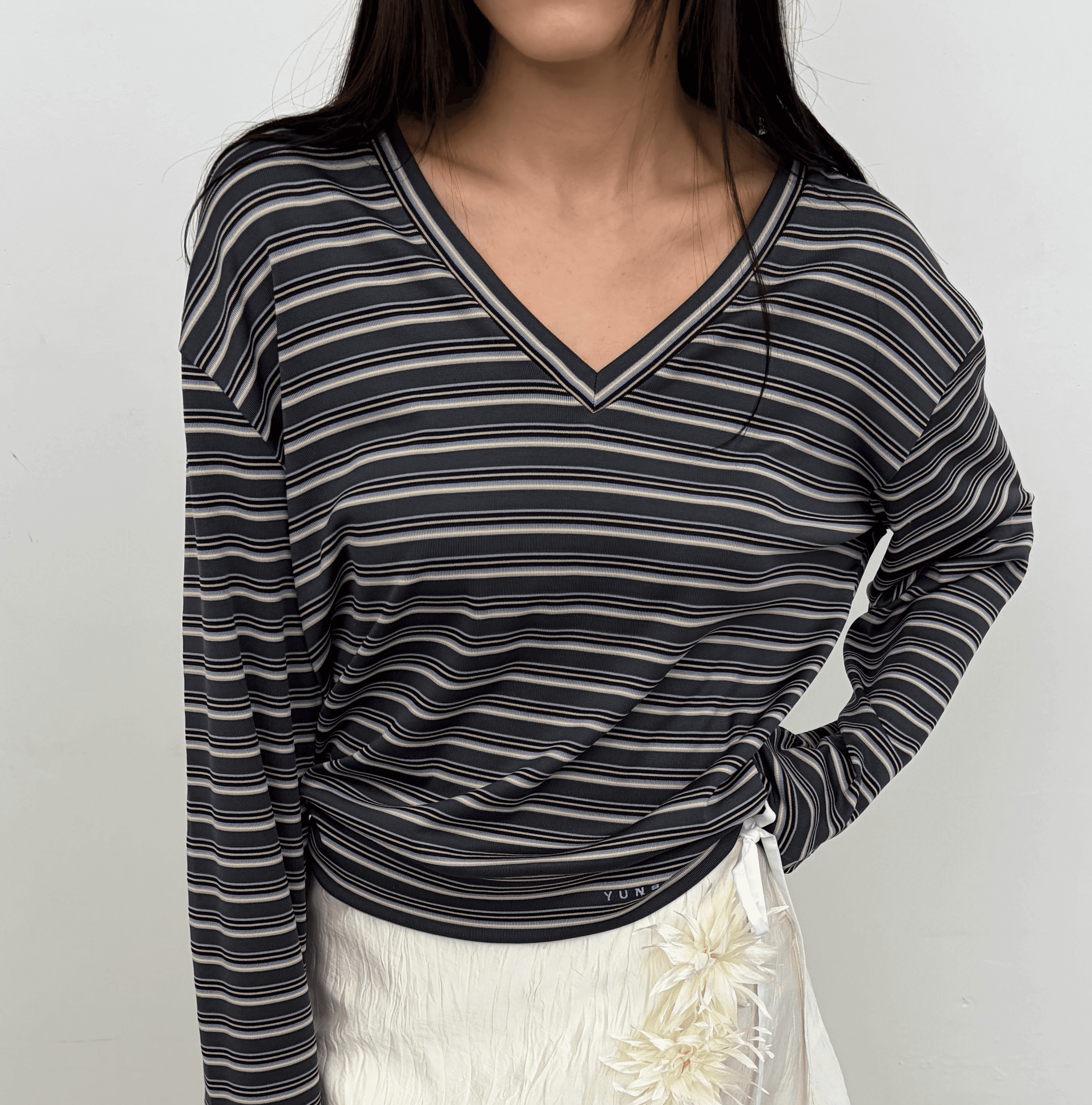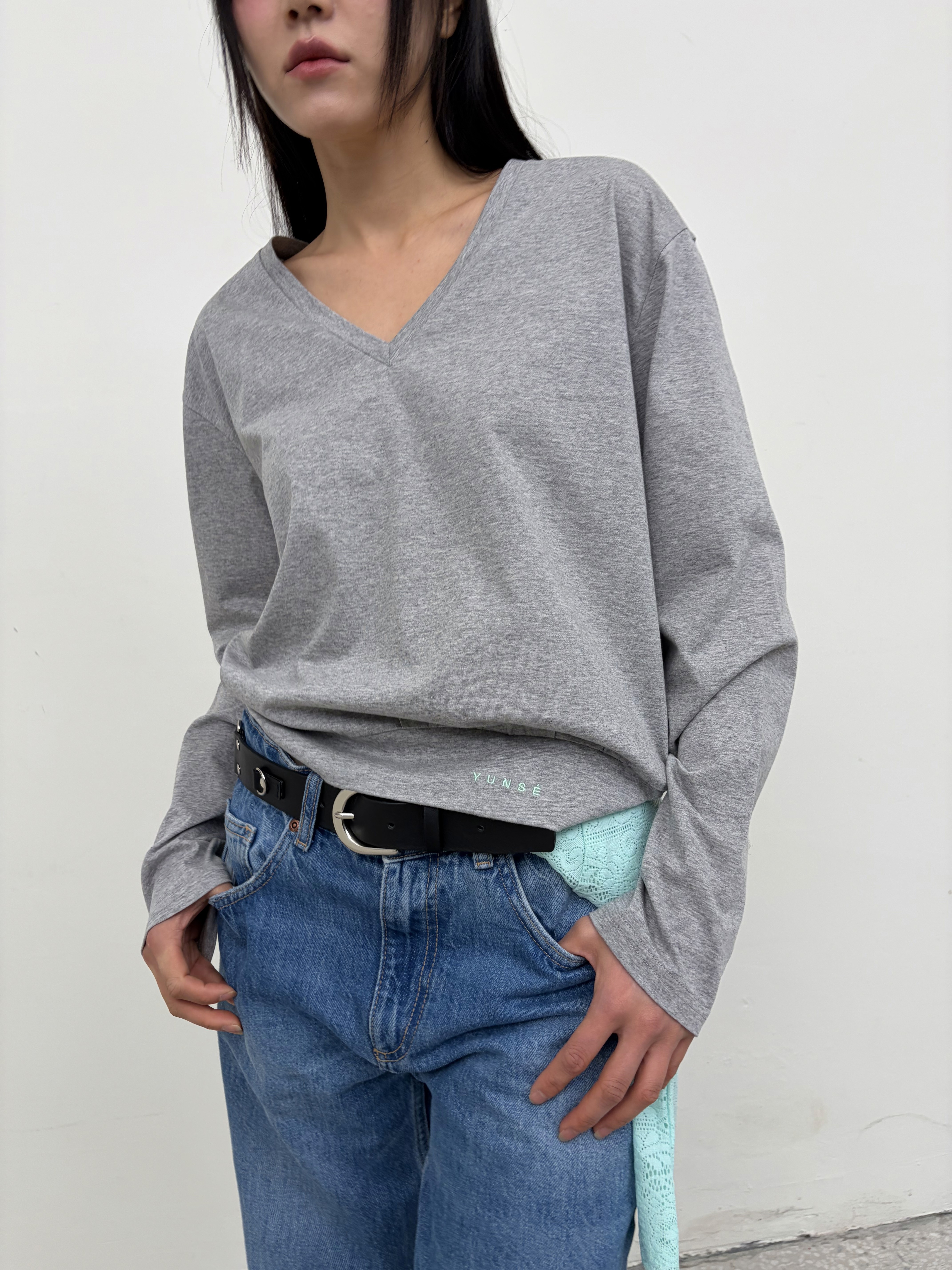 깊게 파인 넥 라인이 특징인 롱 슬리브리스 티셔츠로 레이어드하여 착용하기 좋은 제품입니다.