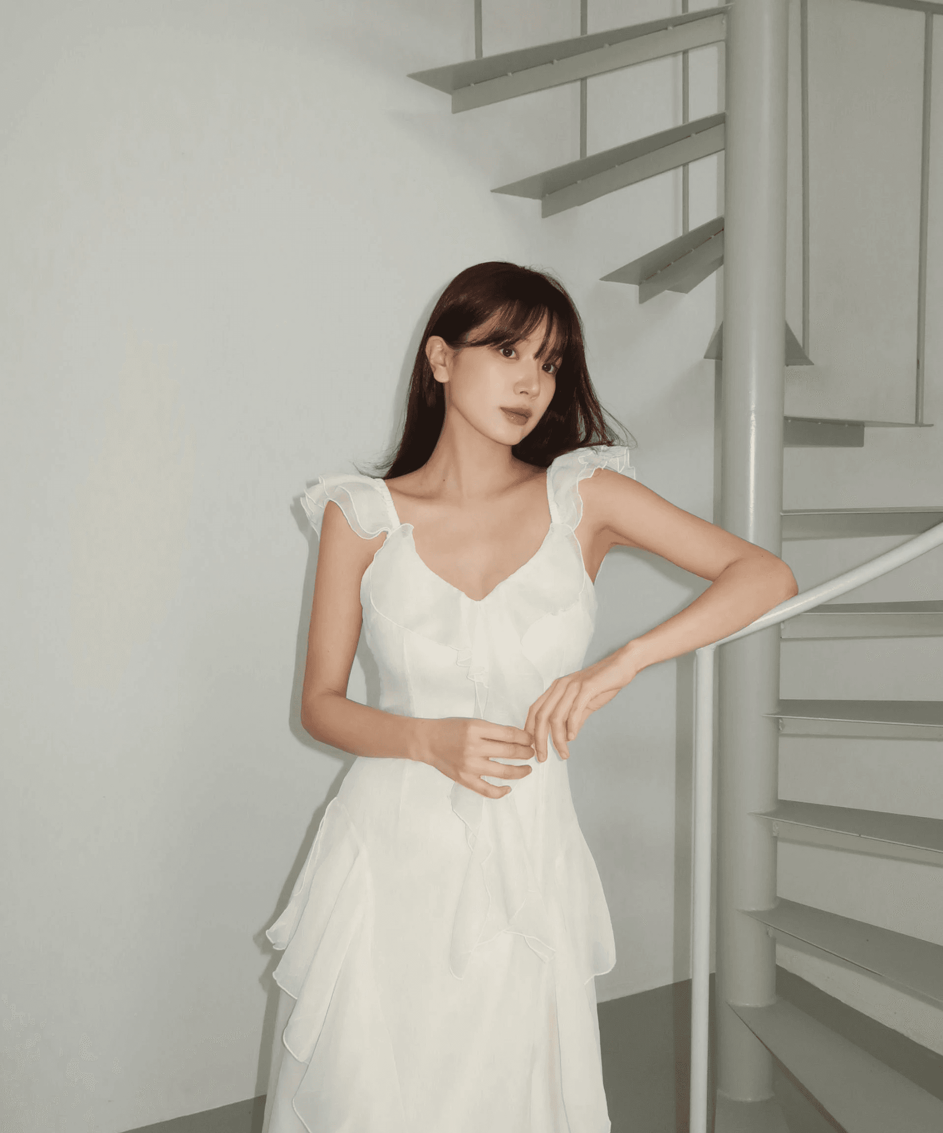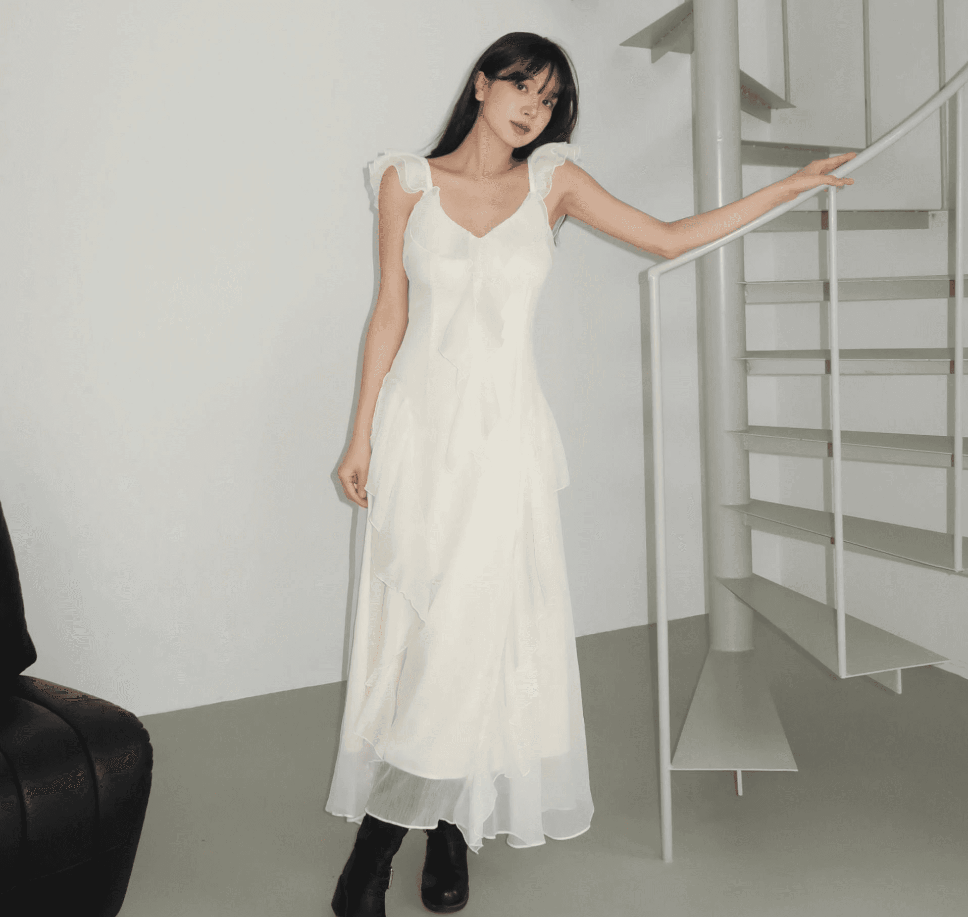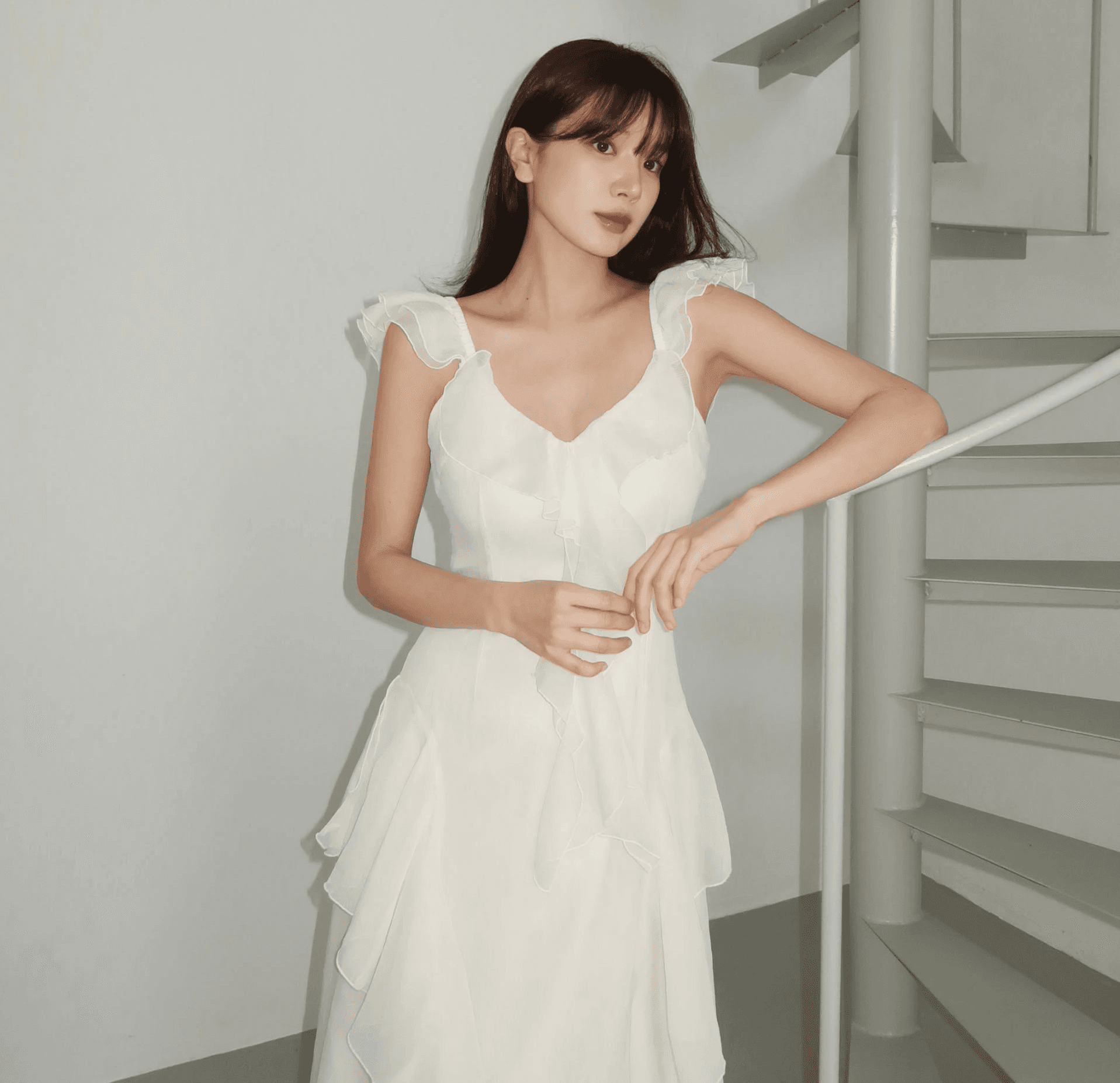 웨딩 촬영 드레스로 추천하는 원피스. 부드러운 바닐라 컬러의 하늘하늘한 원단에 섬세한 프릴과 러플 디테일이 더해져, 실루엣을 더욱 아름답게 살려주는 드레스입니다.