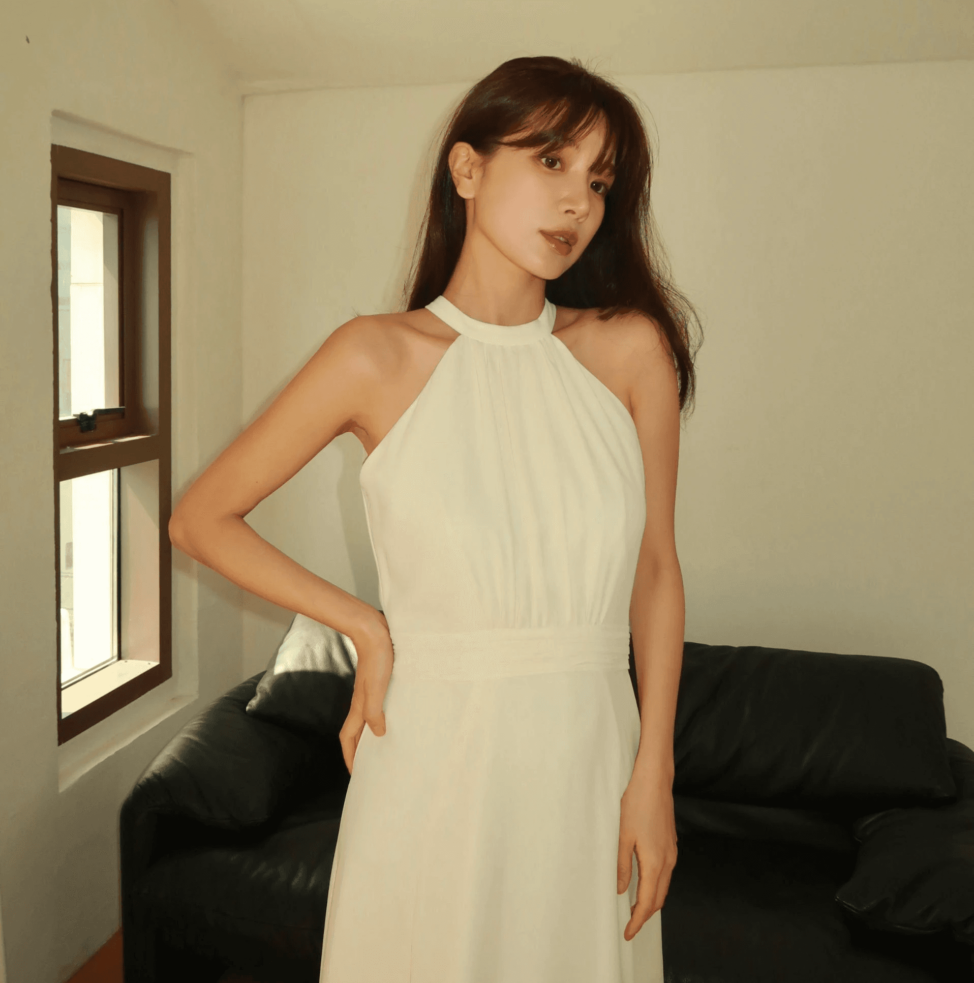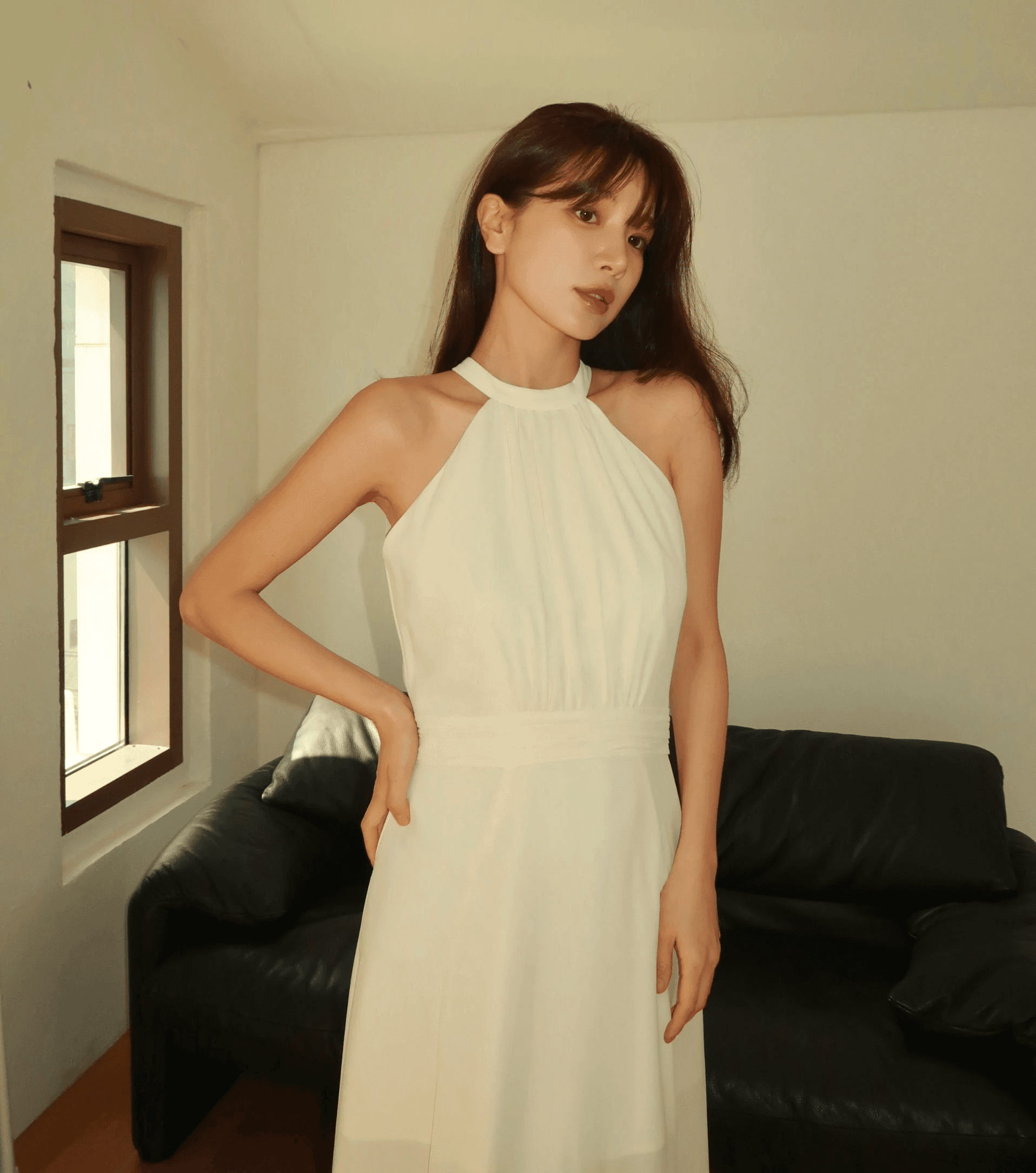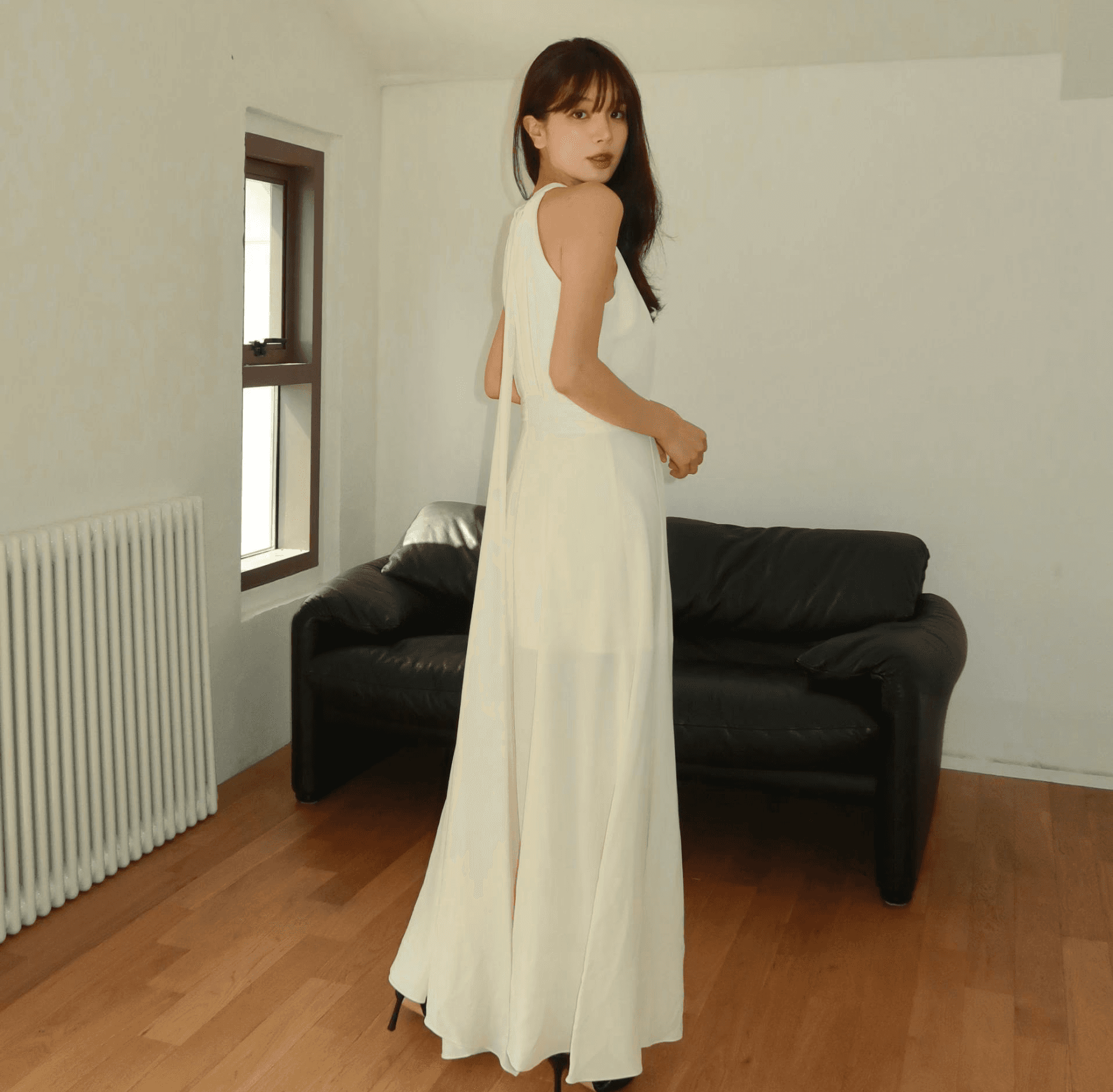 웨딩 촬영 드레스로 추천하는 원피스. 부드러운 바닐라 컬러의 하늘하늘한 원단에 섬세한 프릴과 러플 디테일이 더해져, 실루엣을 더욱 아름답게 살려주는 드레스입니다.