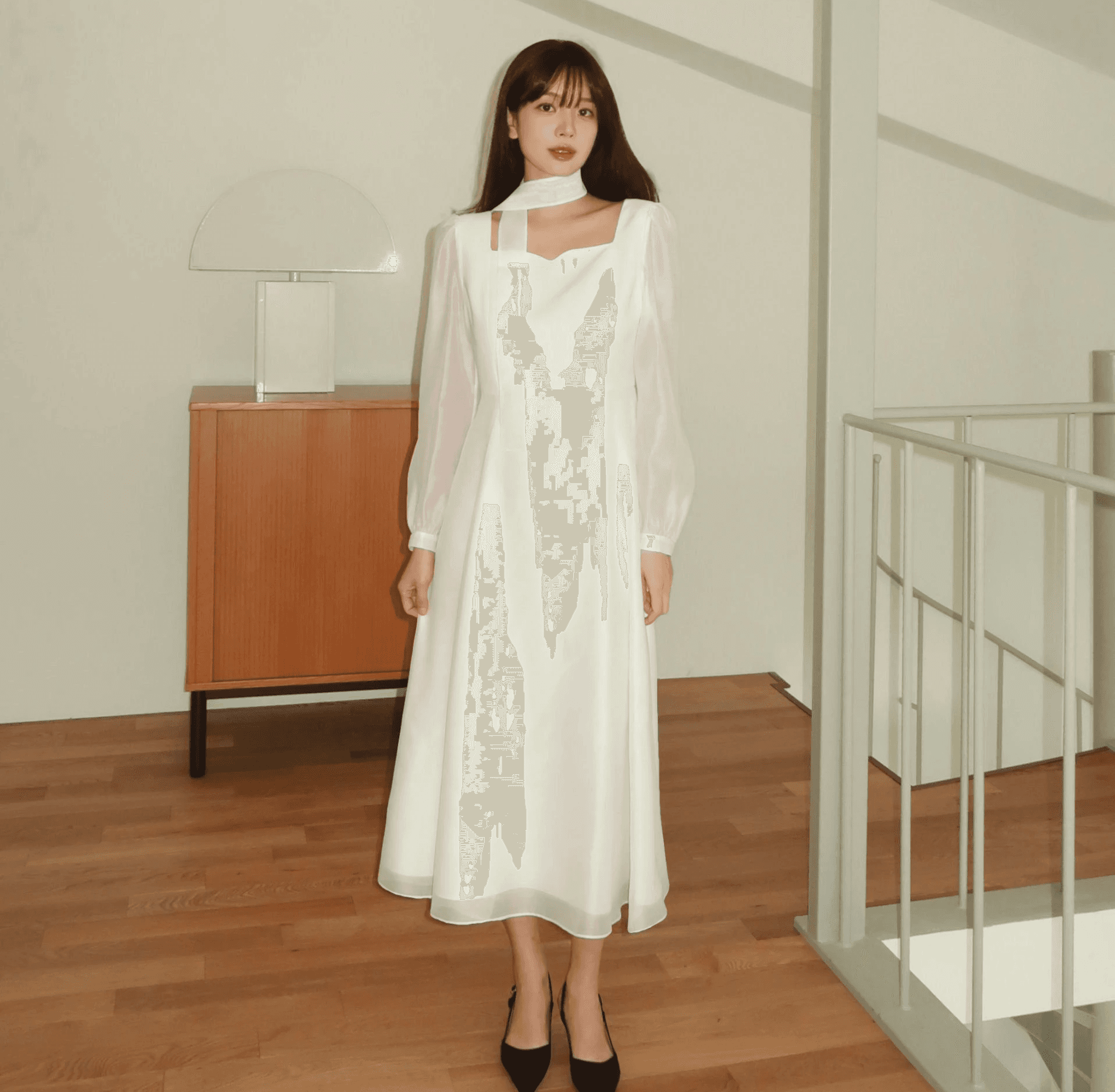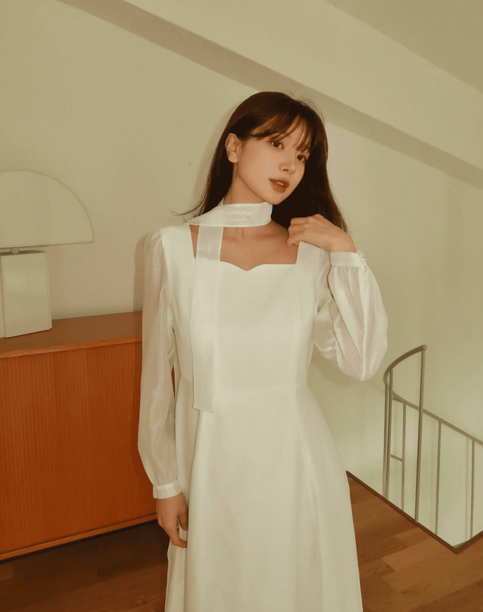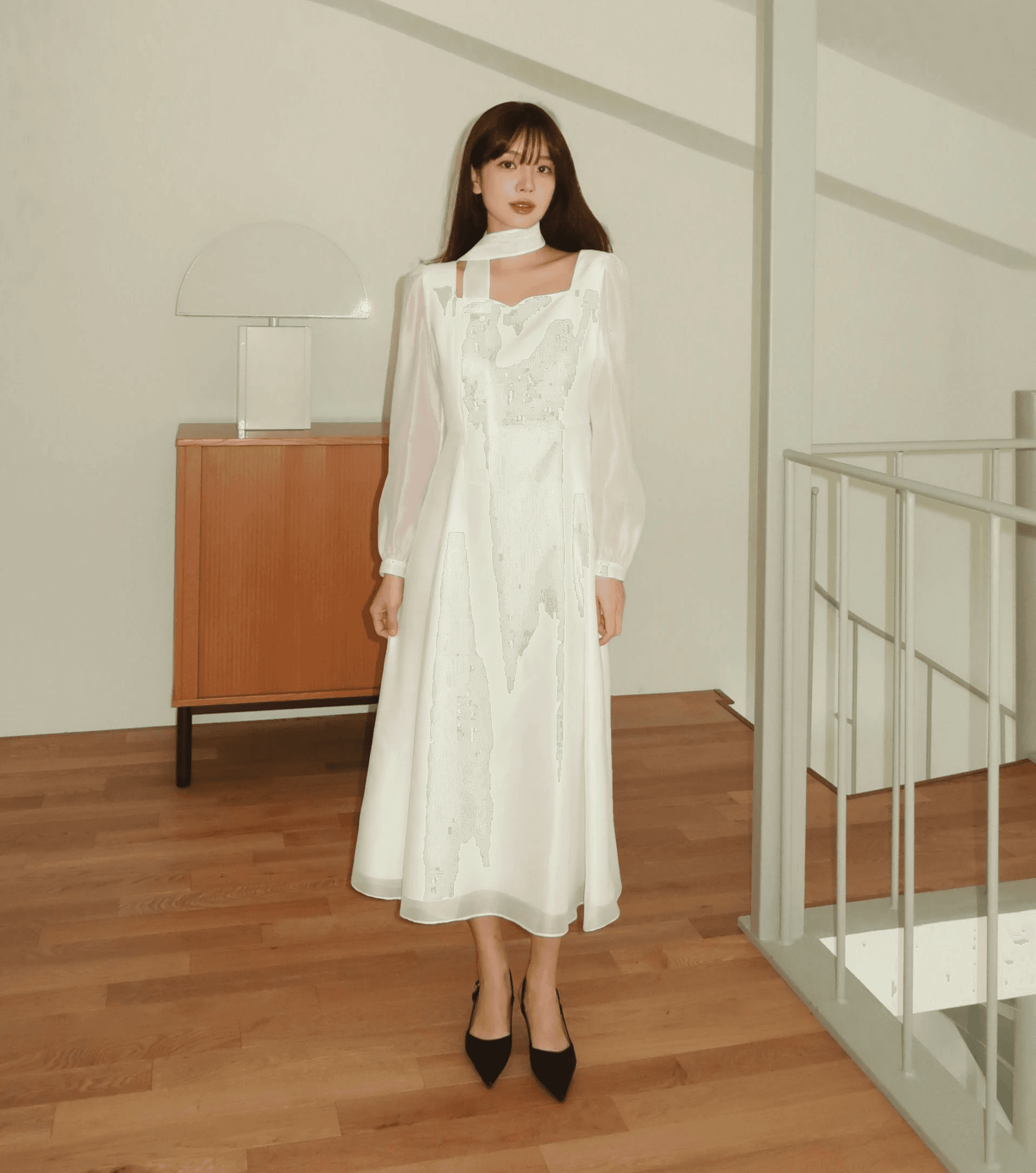 브라이덜 샤워 파티 때 입기 좋은 원피스. 오간자 배색과 스퀘어 넥라인, 타이 리본 디테일로 우아하면서도 세련된 무드를 완성하는 원피스입니다.