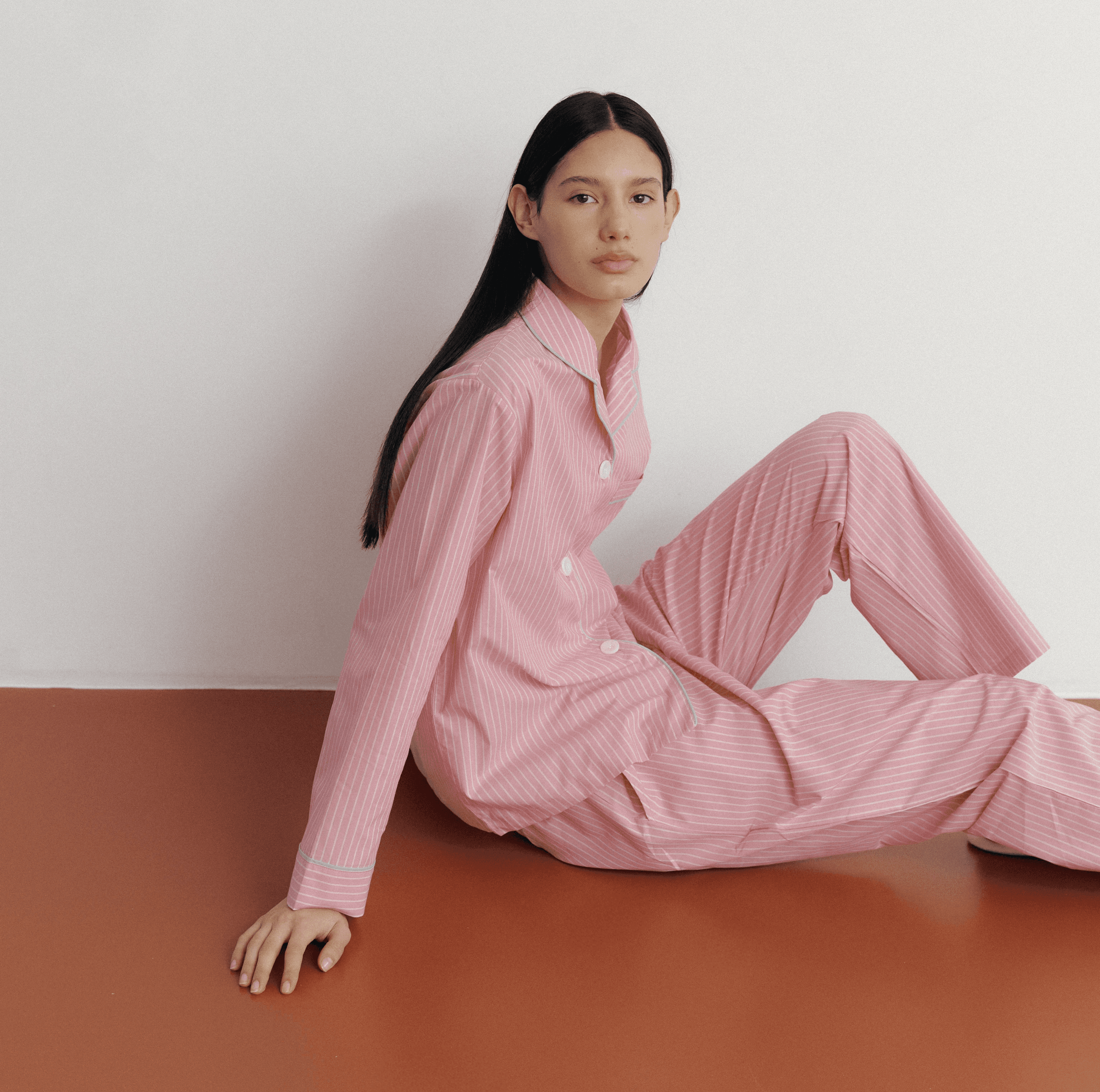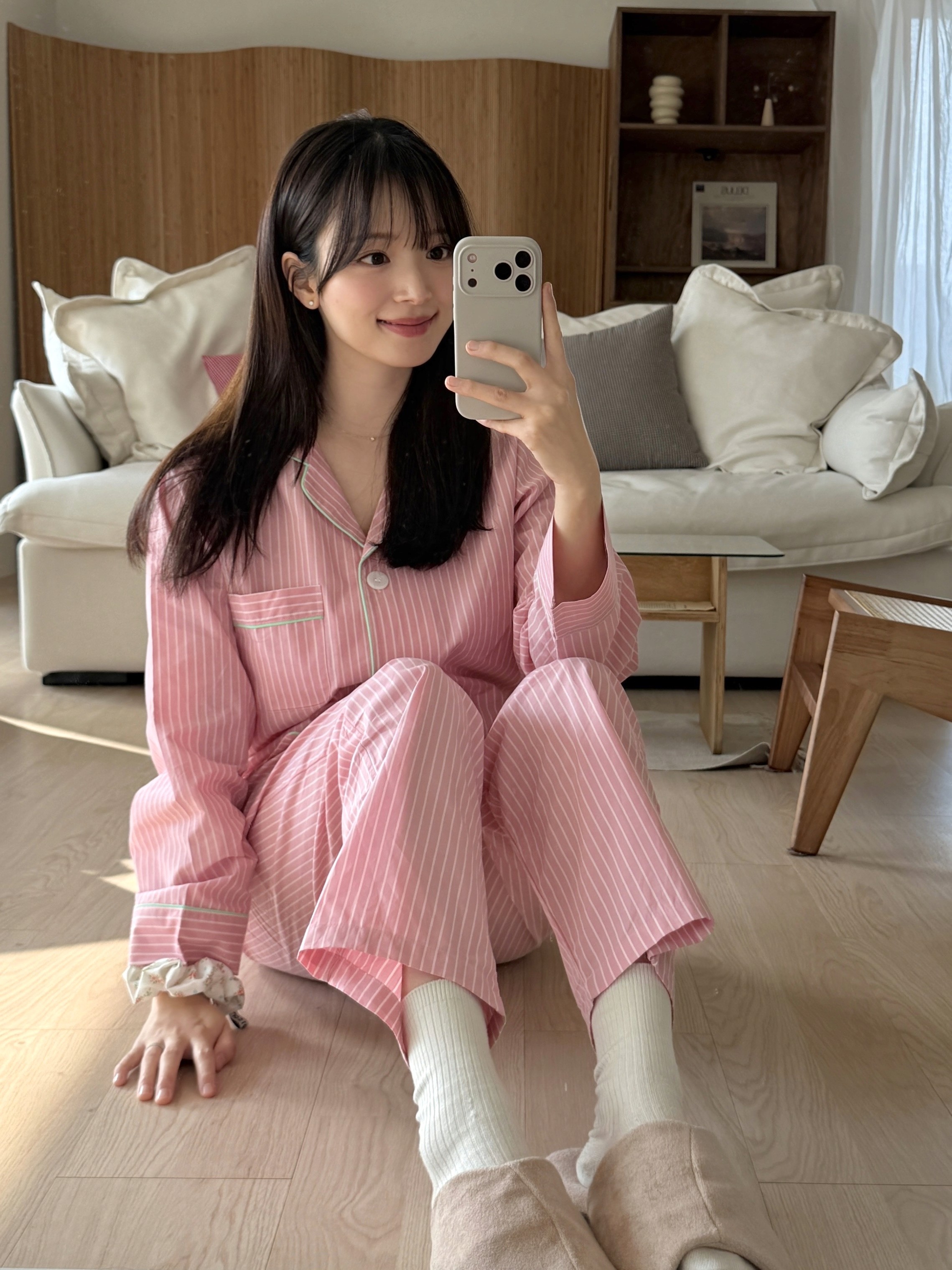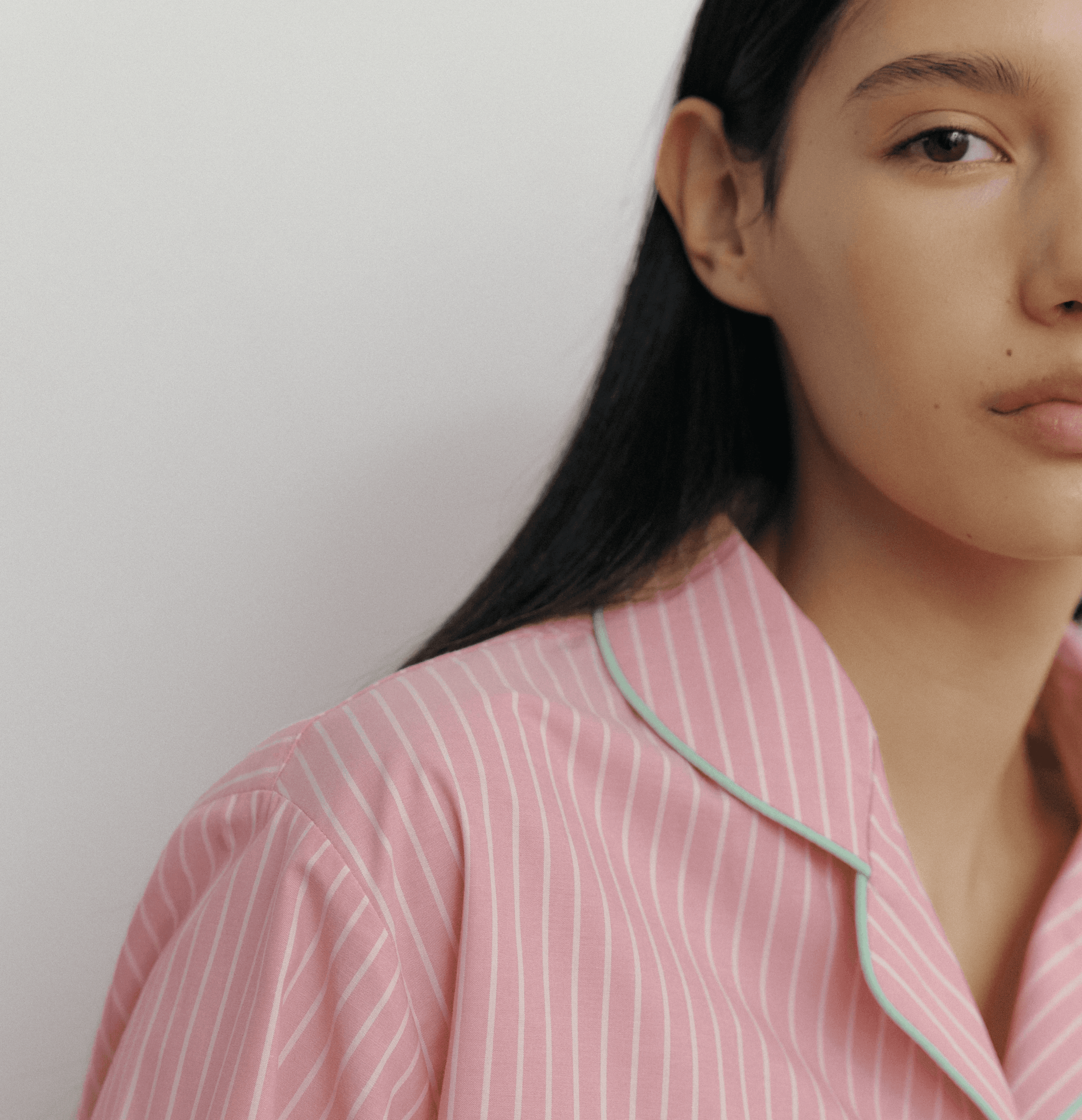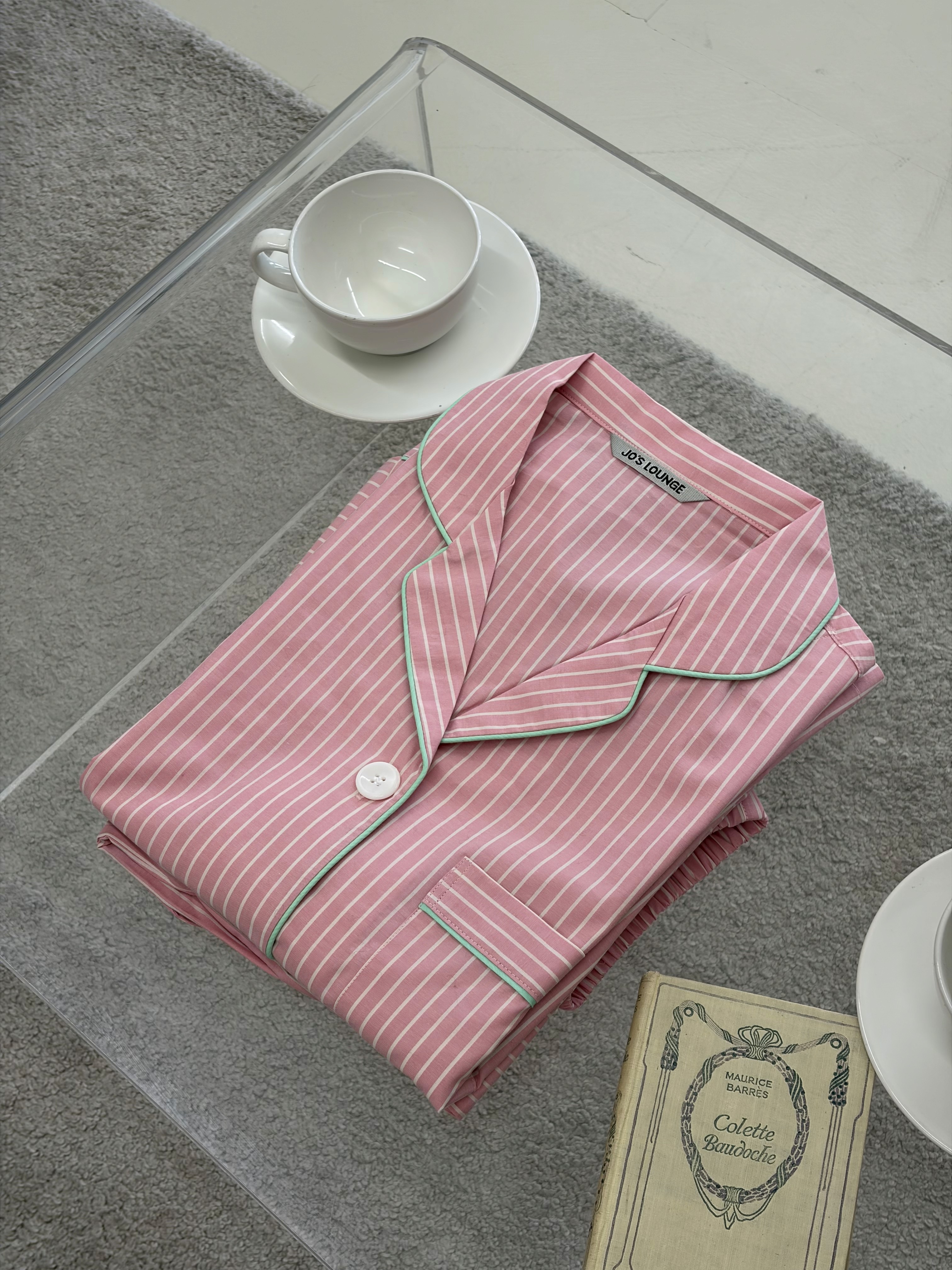 가벼운 면 원사로 딸기우유 빛의 스트라이프 패턴을 직조한 스트로베리 3버튼 긴소매 파자마 세트입니다. 카라와 앞섶, 소매와 가슴 주머니에 그린 파이핑 장식. 허리에 엘라스틱 밴드. 넉넉한 스탠다드 핏. 면 100%