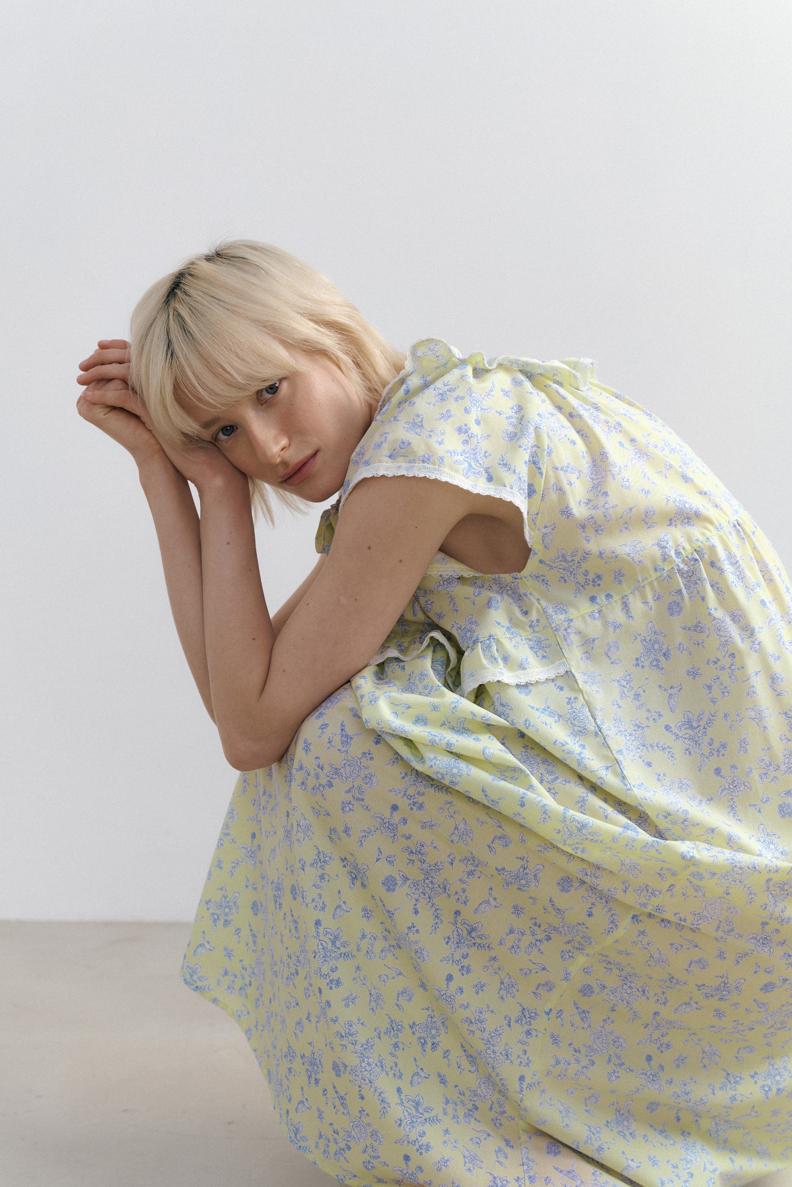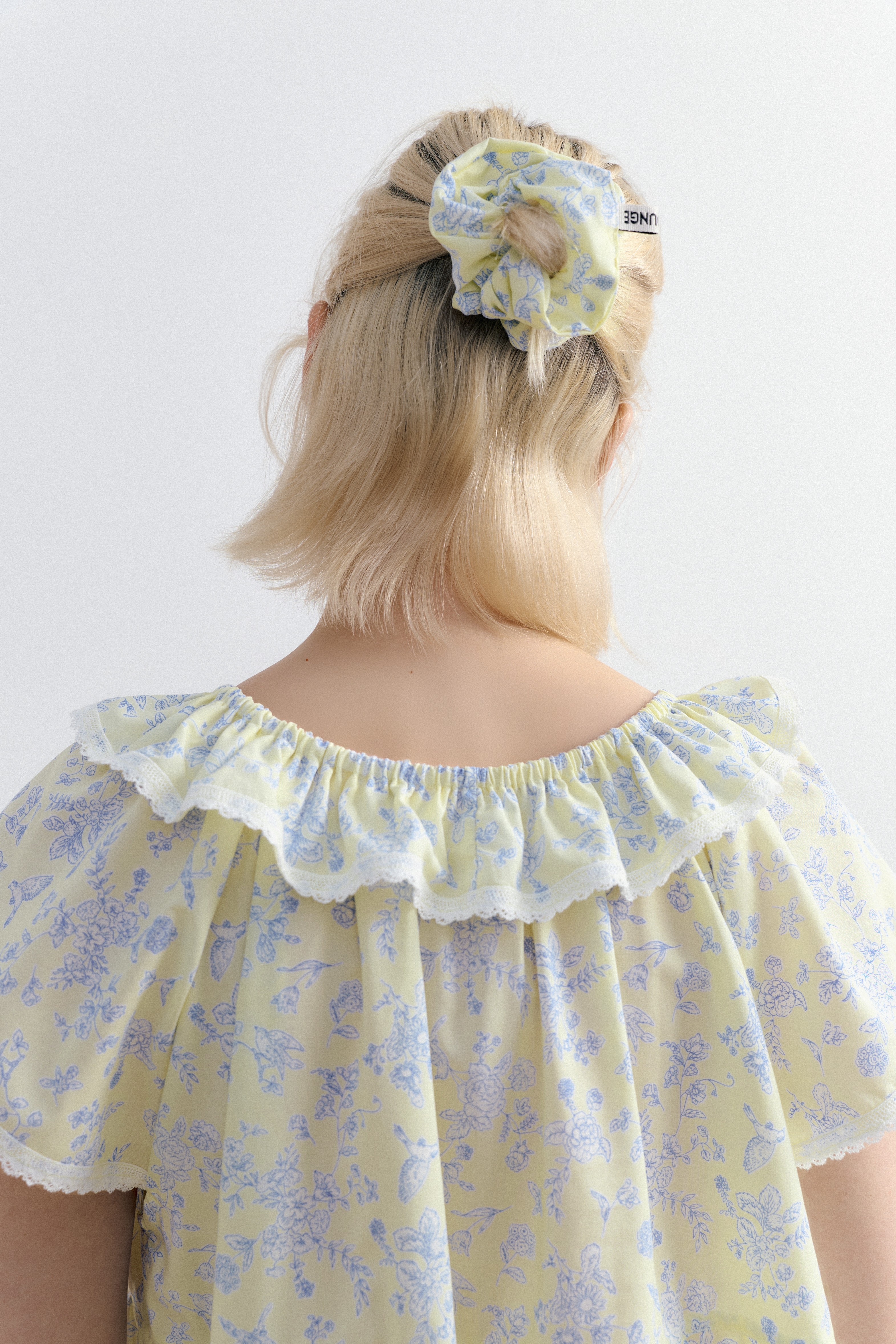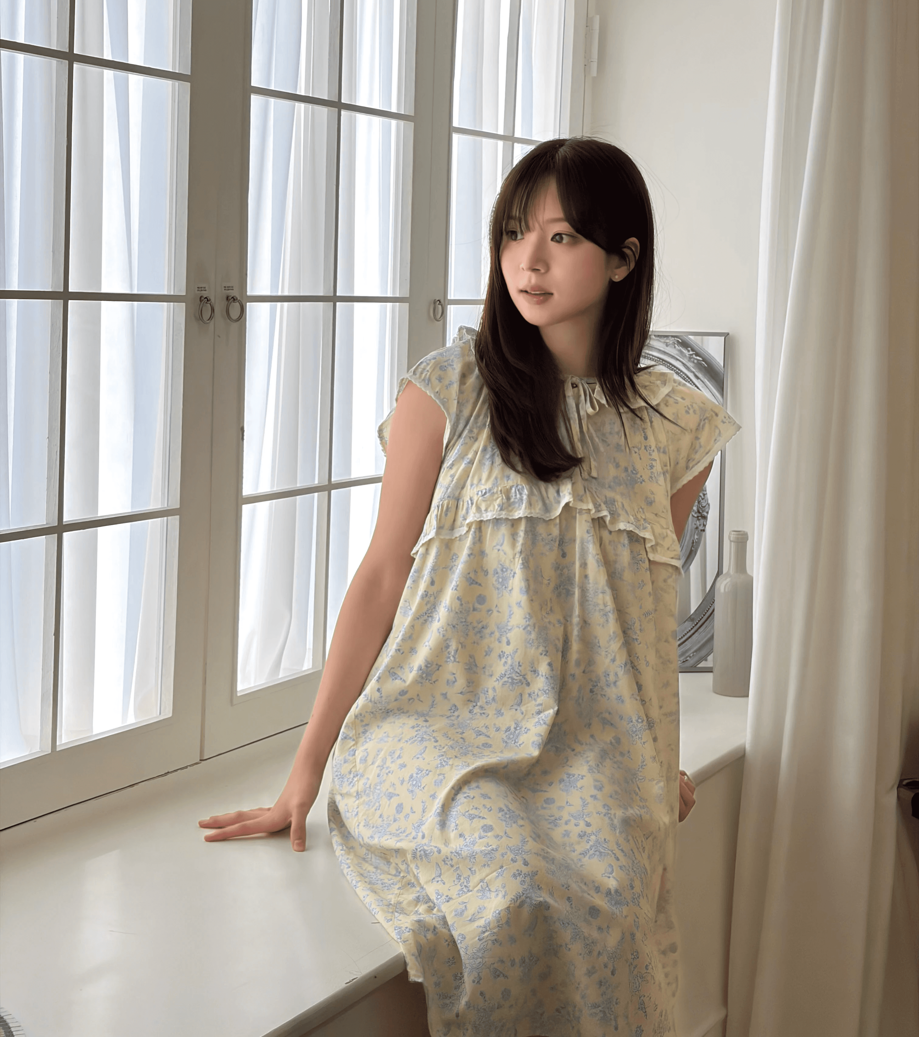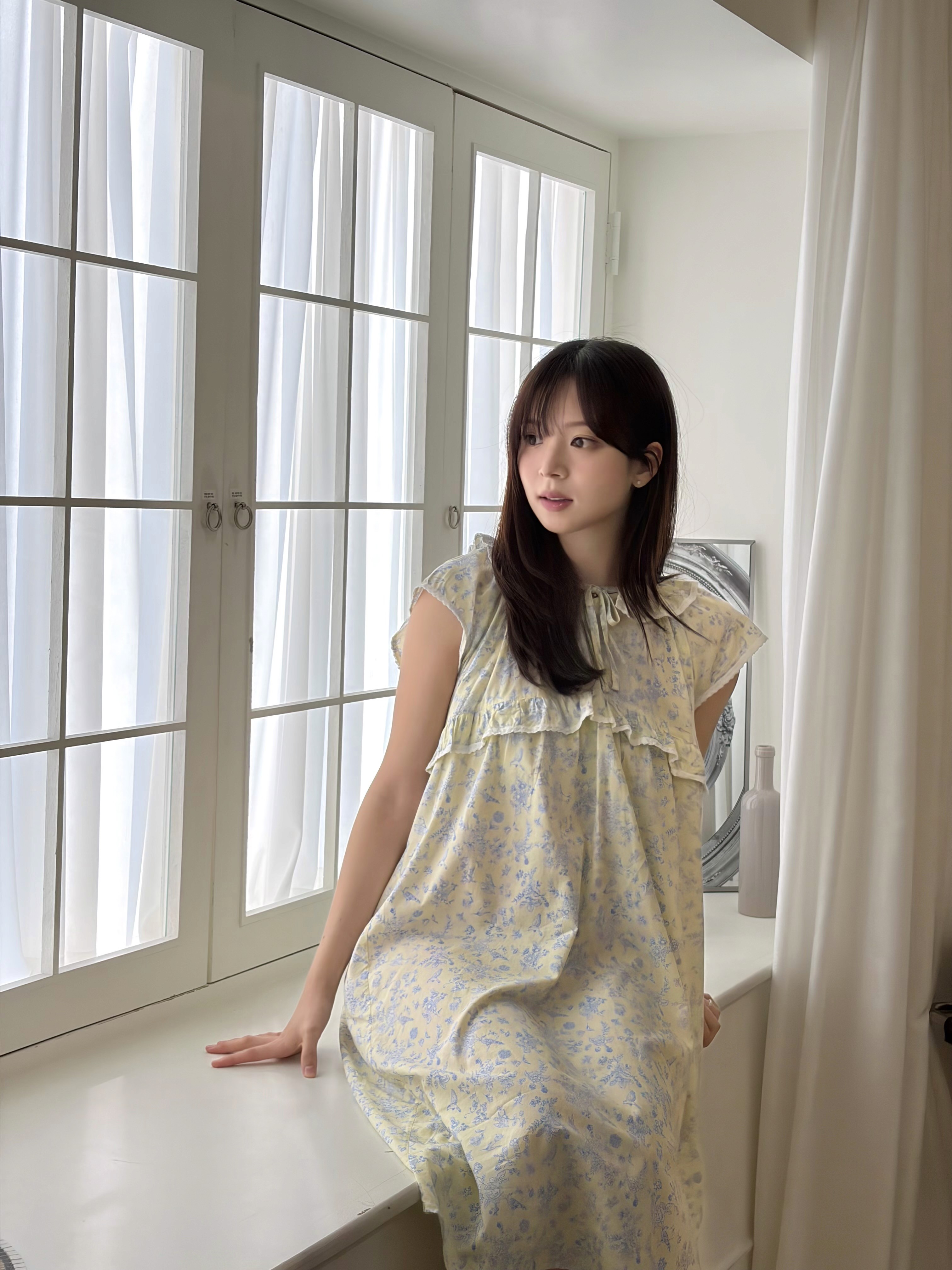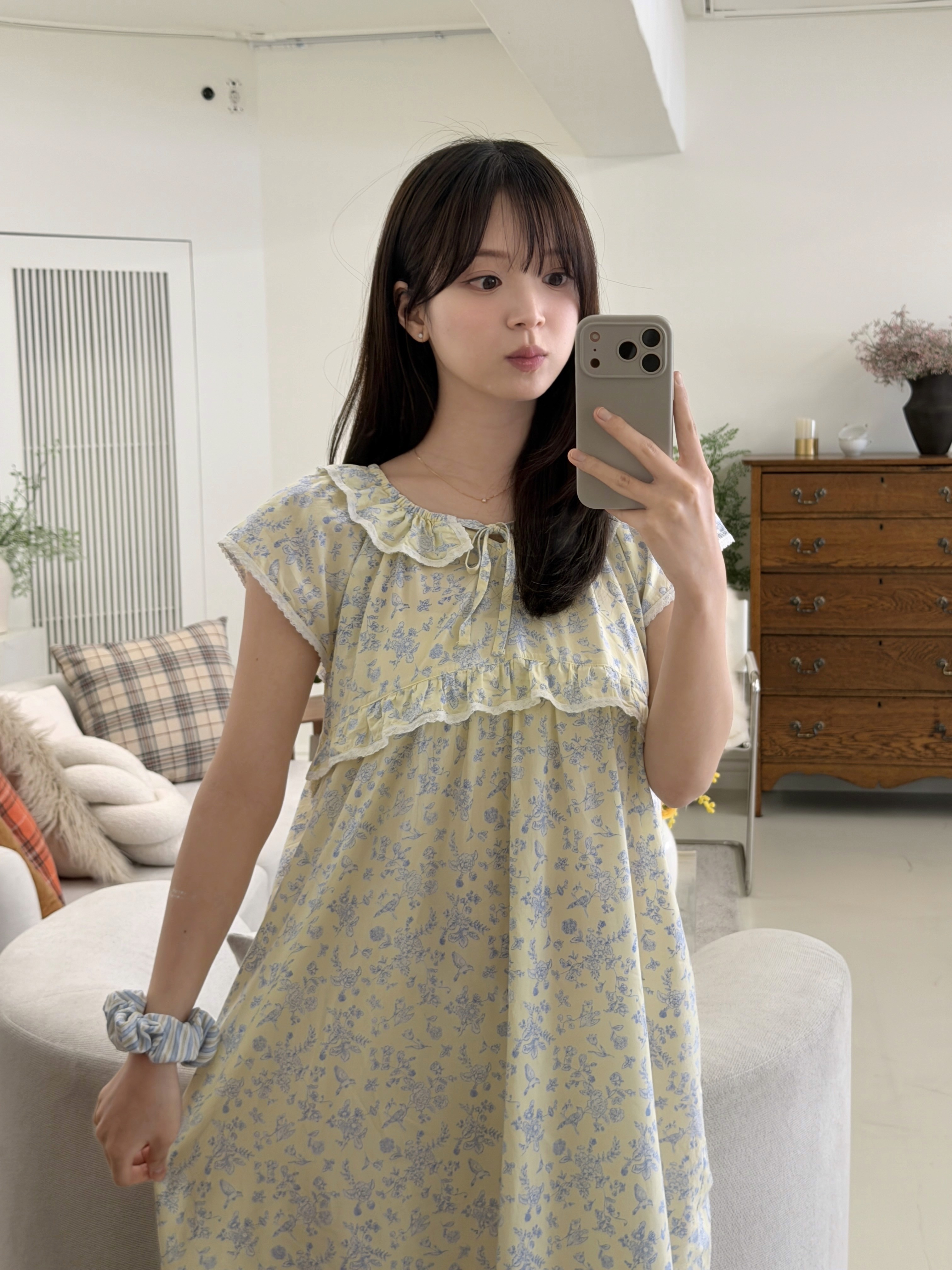 밝은 노랑 색감의 부드럽고 가벼운 모달면 혼방 원단에 새와 꽃 패턴이 프린트된 마야 캡슬리브 원피스입니다. 레이스와 러플 장식과 넥라인에 스트링과 엘라스틱 밴드가 돋보이며 편안한 릴렉스드 핏을 경험해요