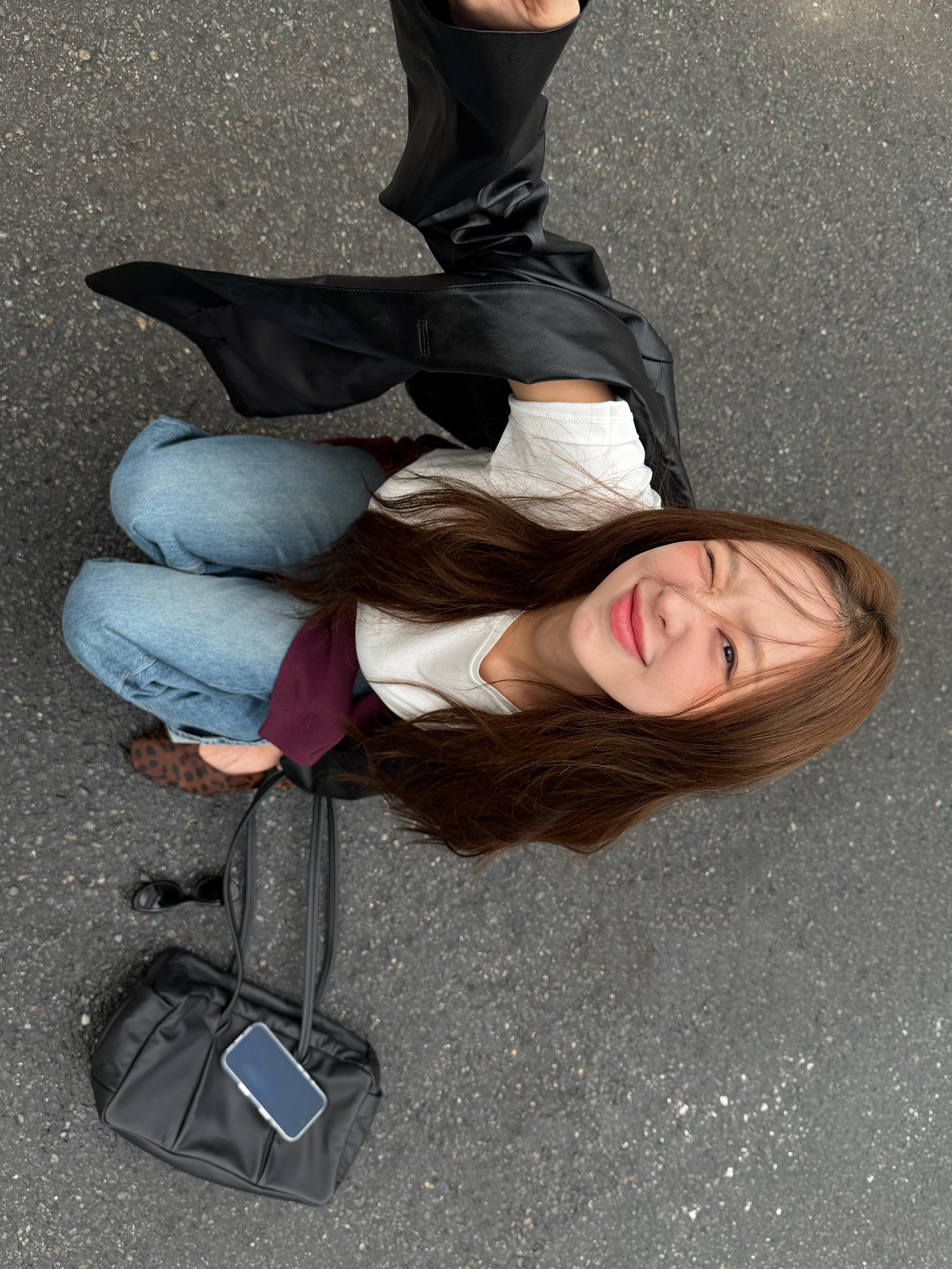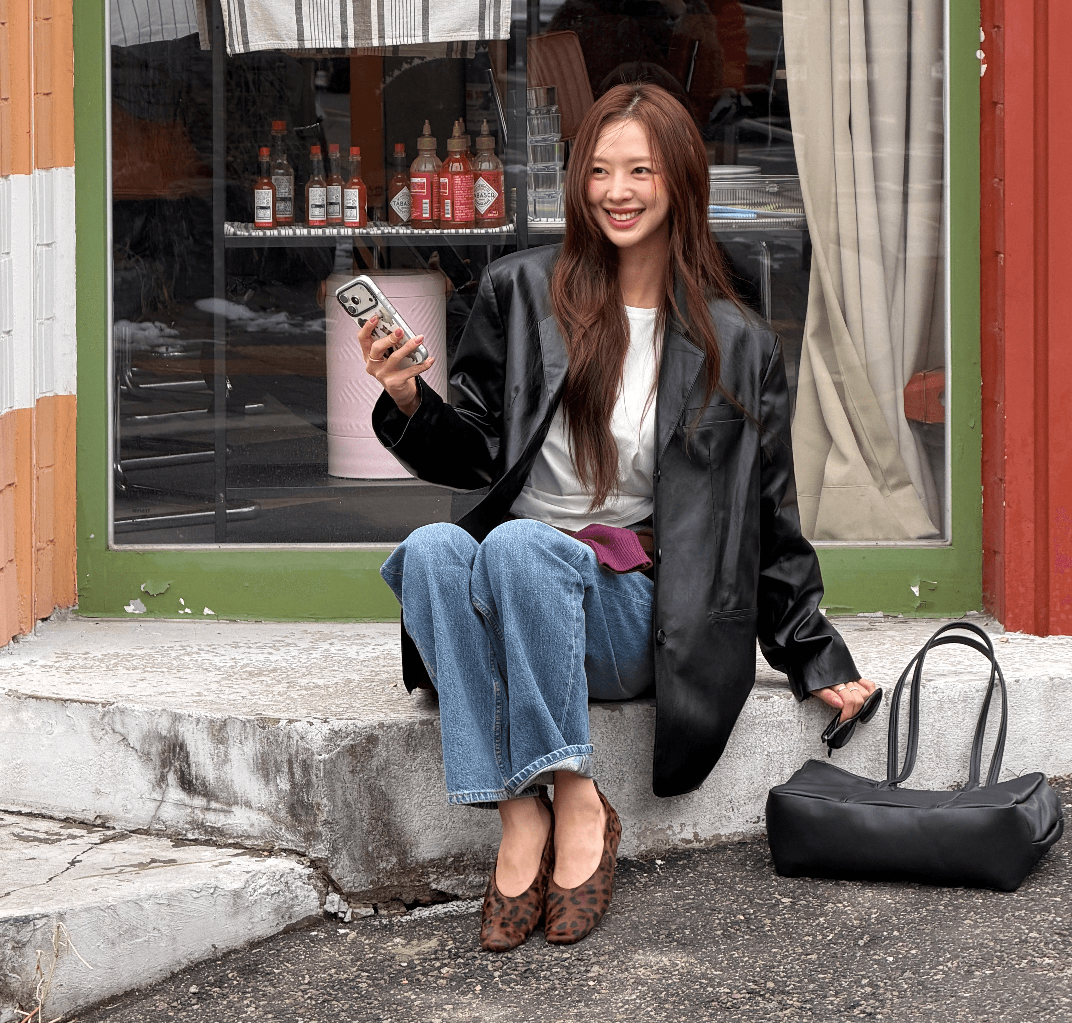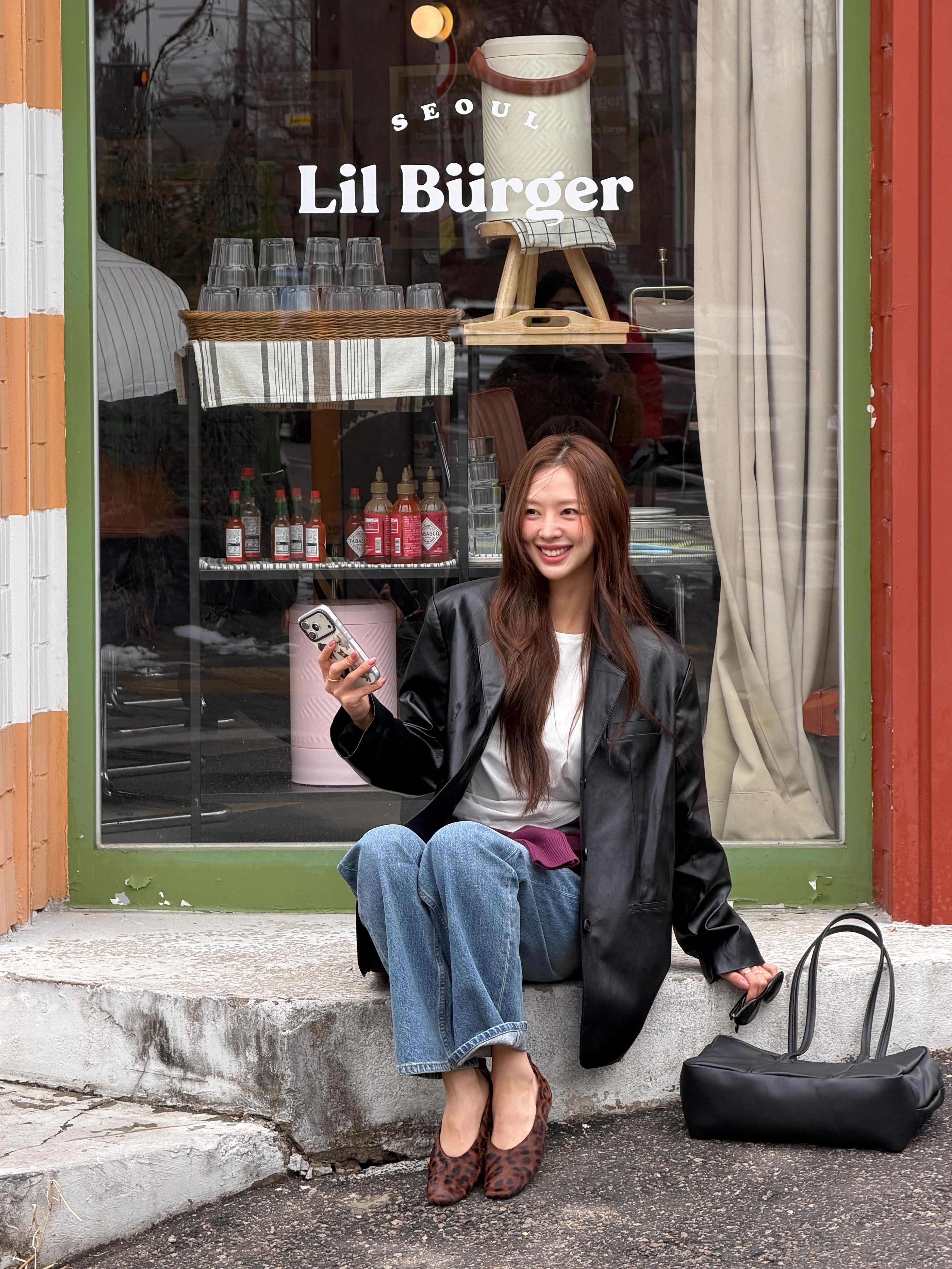 루즈핏 페이크 레더 자켓과 스트레이트 데님을 매치해 세련된 실루엣을 완성하고 은은한 광택감과 워싱 디테일이 어우러져 데일리부터 세미 캐주얼까지 활용도 높은 스타일