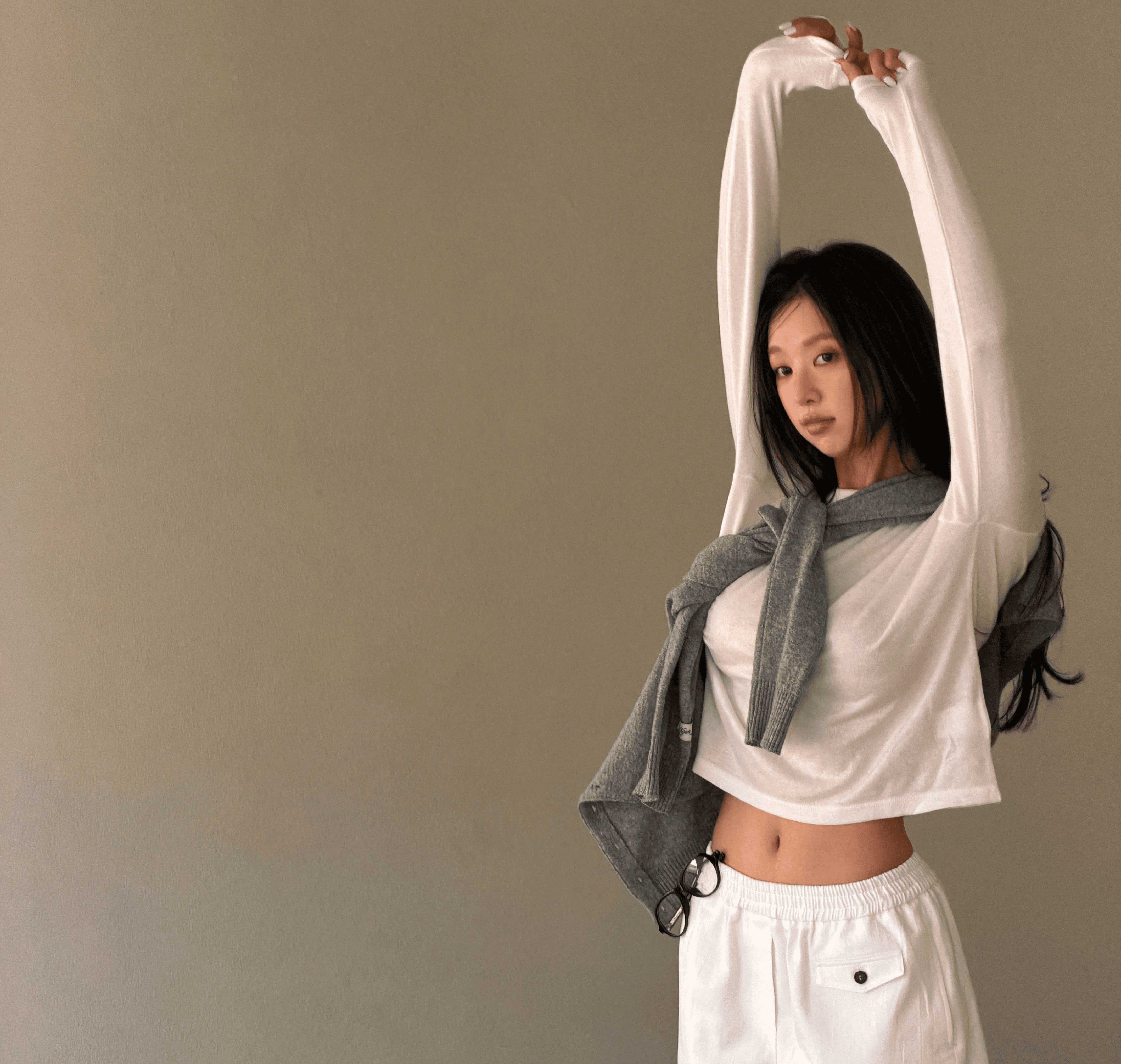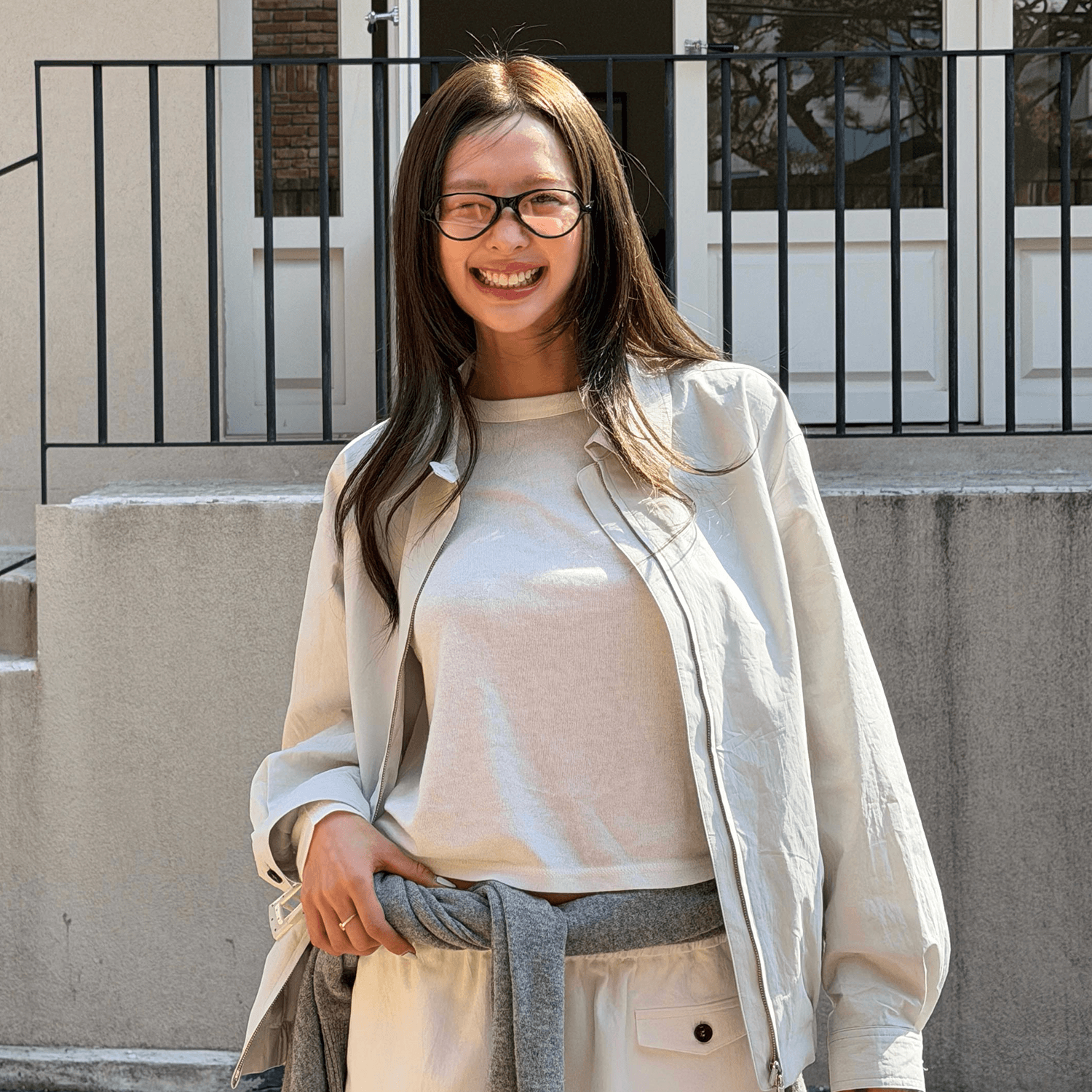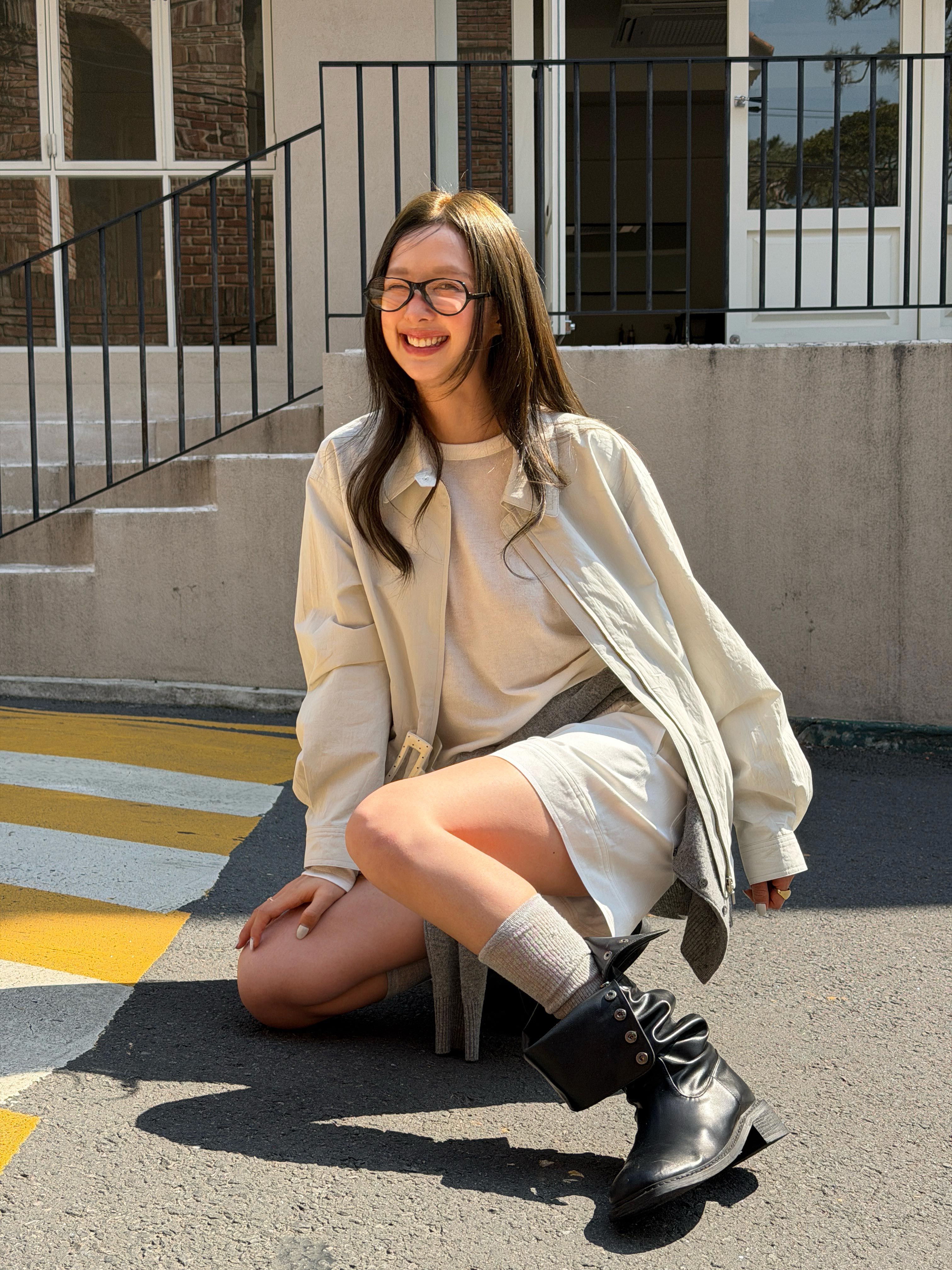오버사이즈 점퍼와 밴딩 쇼츠로 여유로운 실루엣을 연출하고 크롭 티로 포인트를 더해 편안하면서도 감각적인 밸런스를 완성한 부드러운 컬러감의 데일리 캐주얼 스타일