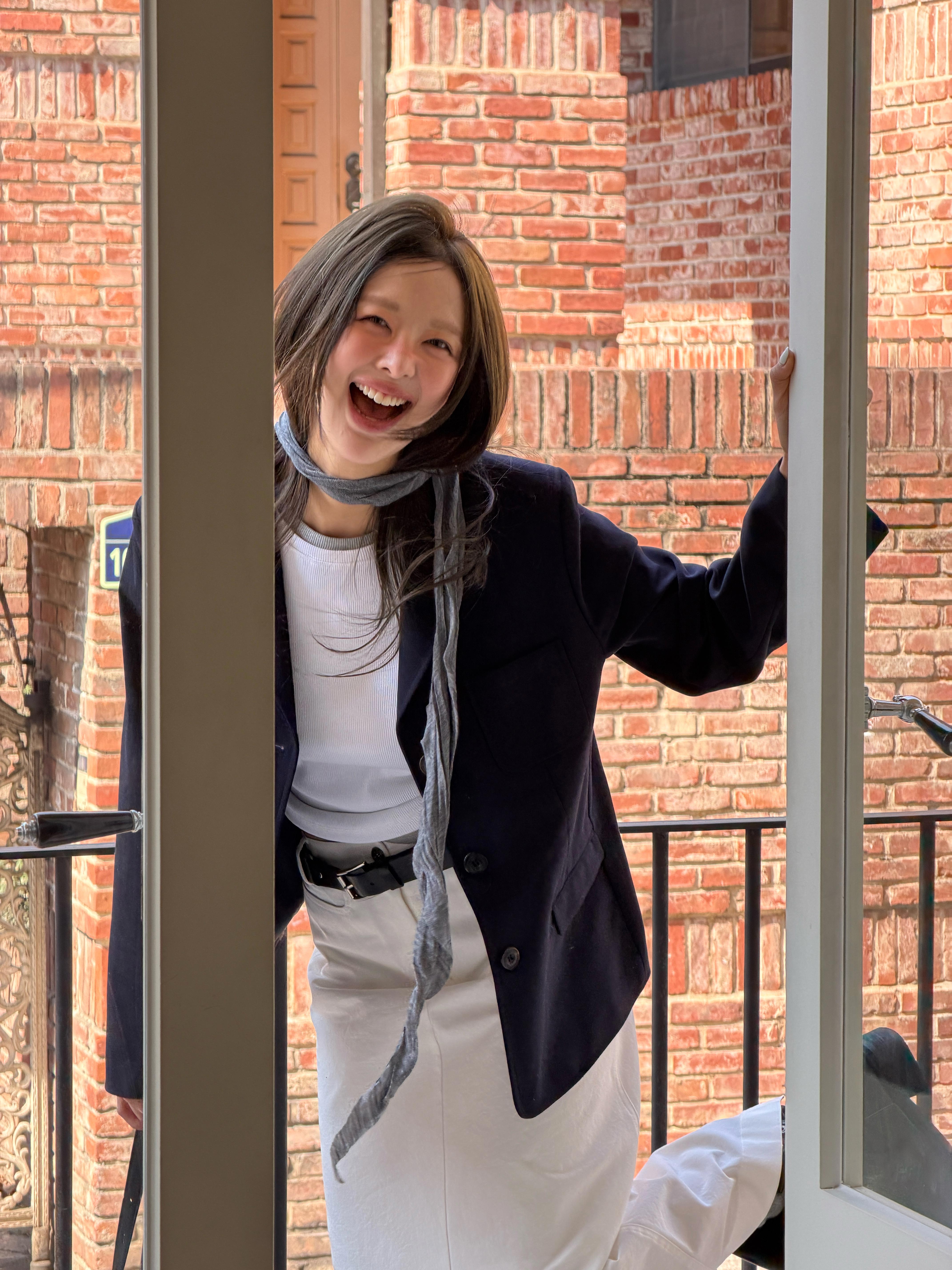 네이비 싱글 재킷으로 단정한 실루엣을 완성하고 슬림한 화이트 티셔츠와 코튼 스커트를 더해 산뜻한 무드를 살린 데일리 클래식 스타일로 일상과 격식 모두에 자연스럽게 어울리는 룩