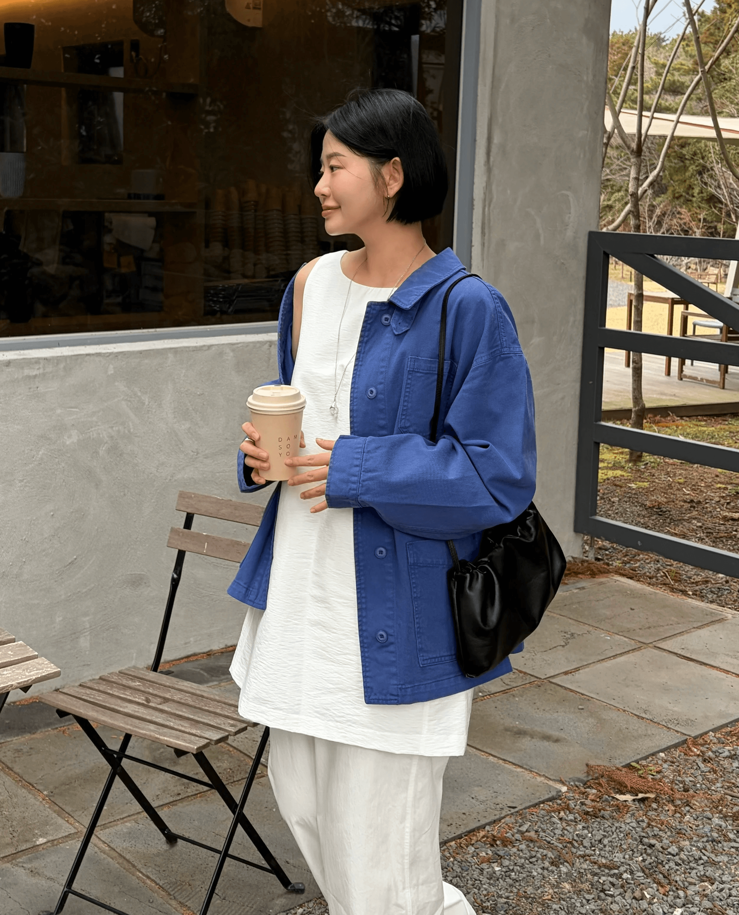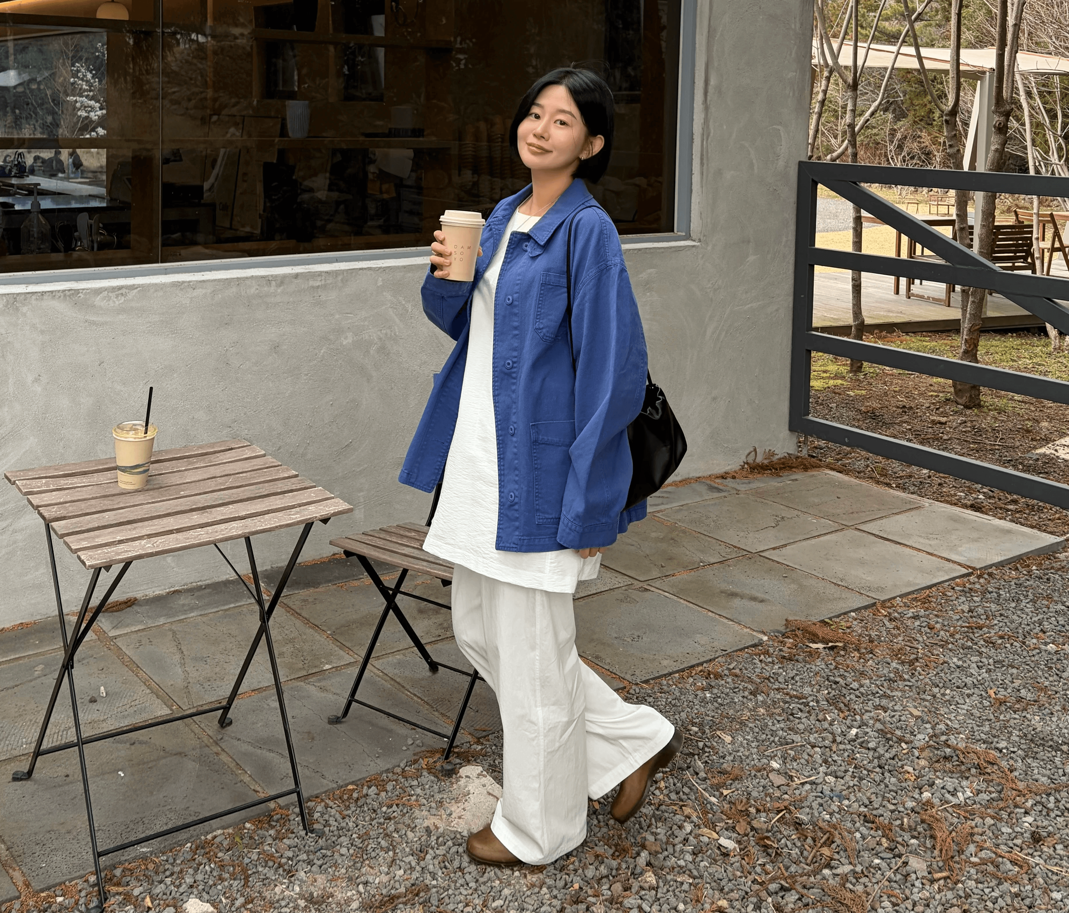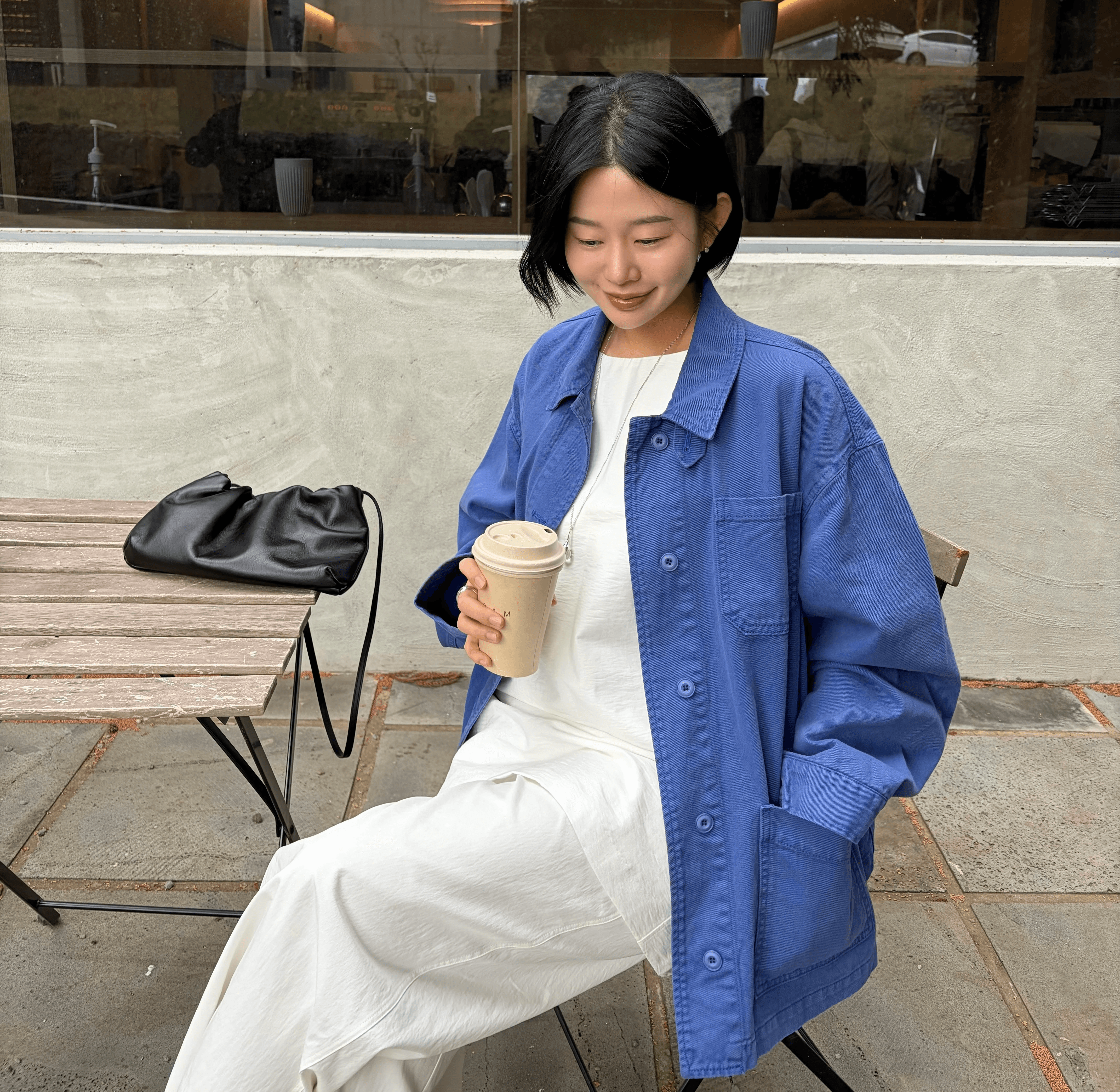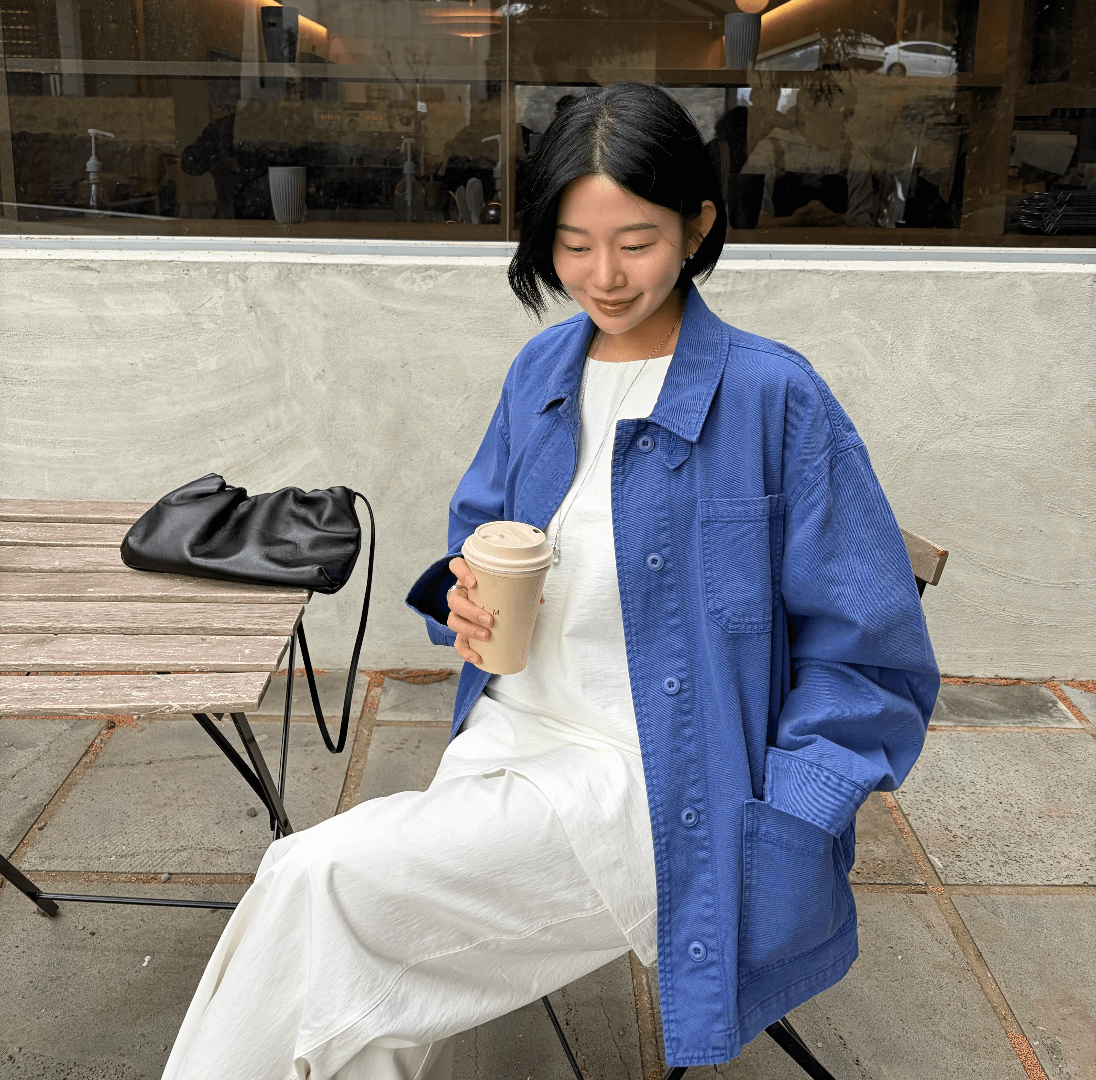 깔끔한 화이트 이너와 매력적인 블루 컬러의 데님 재킷을 매치하여 감각적이고 편안한 데일리룩을 완성했어요. 아우터 컬러 포인트의 위트있는 스타일링을 참고해보세요.