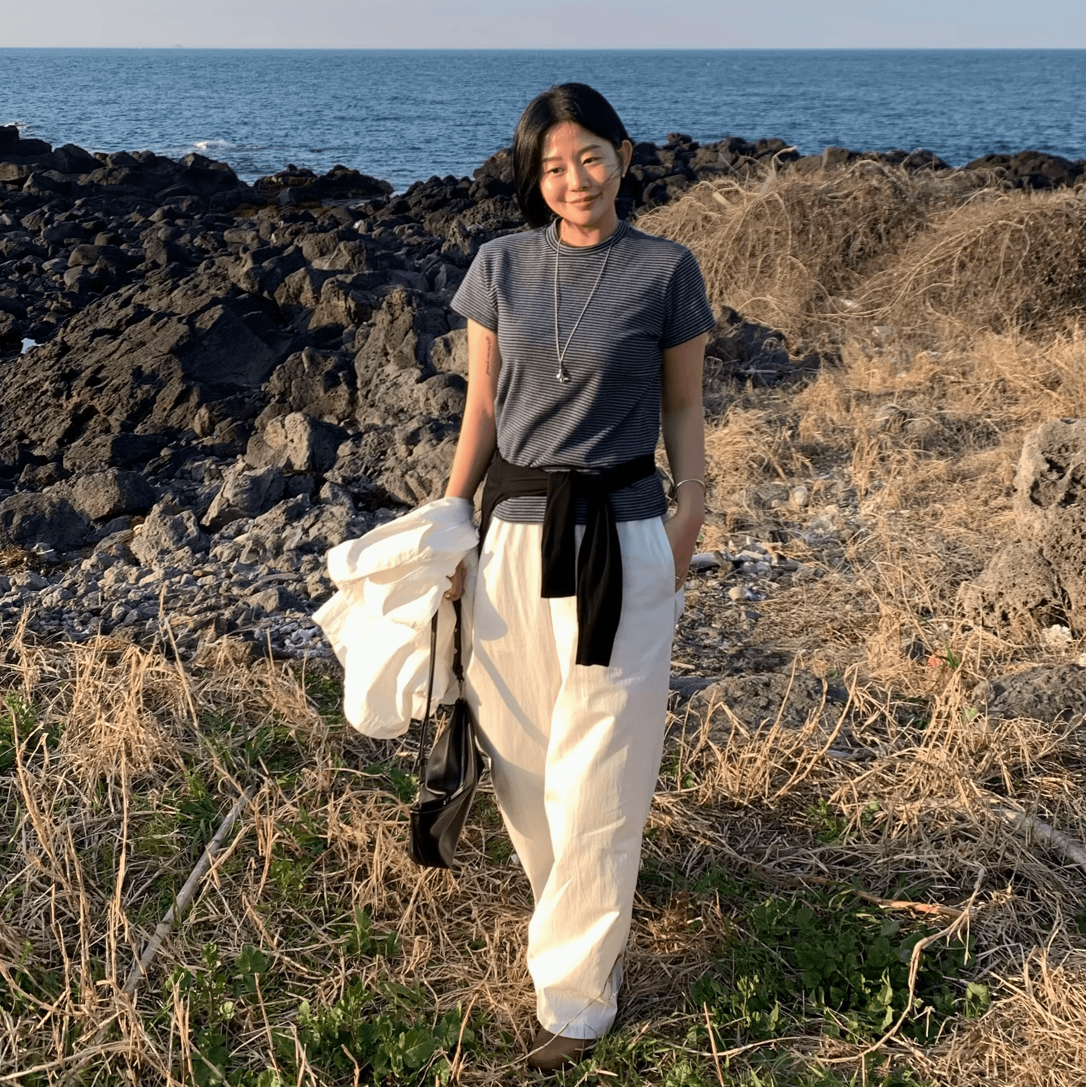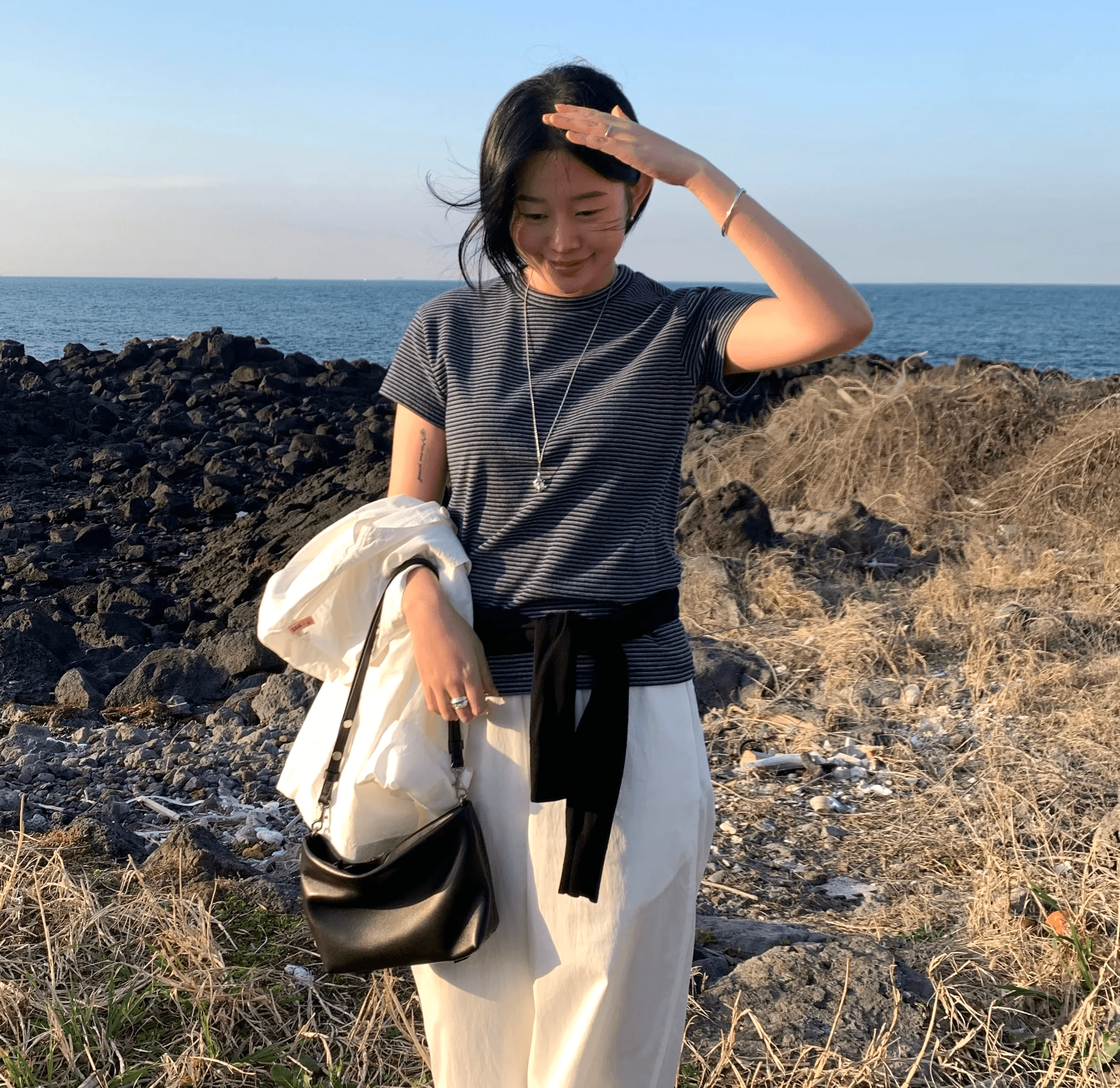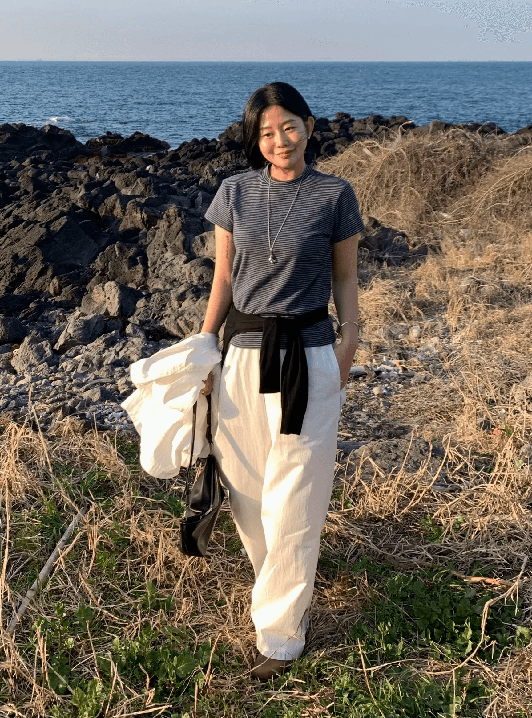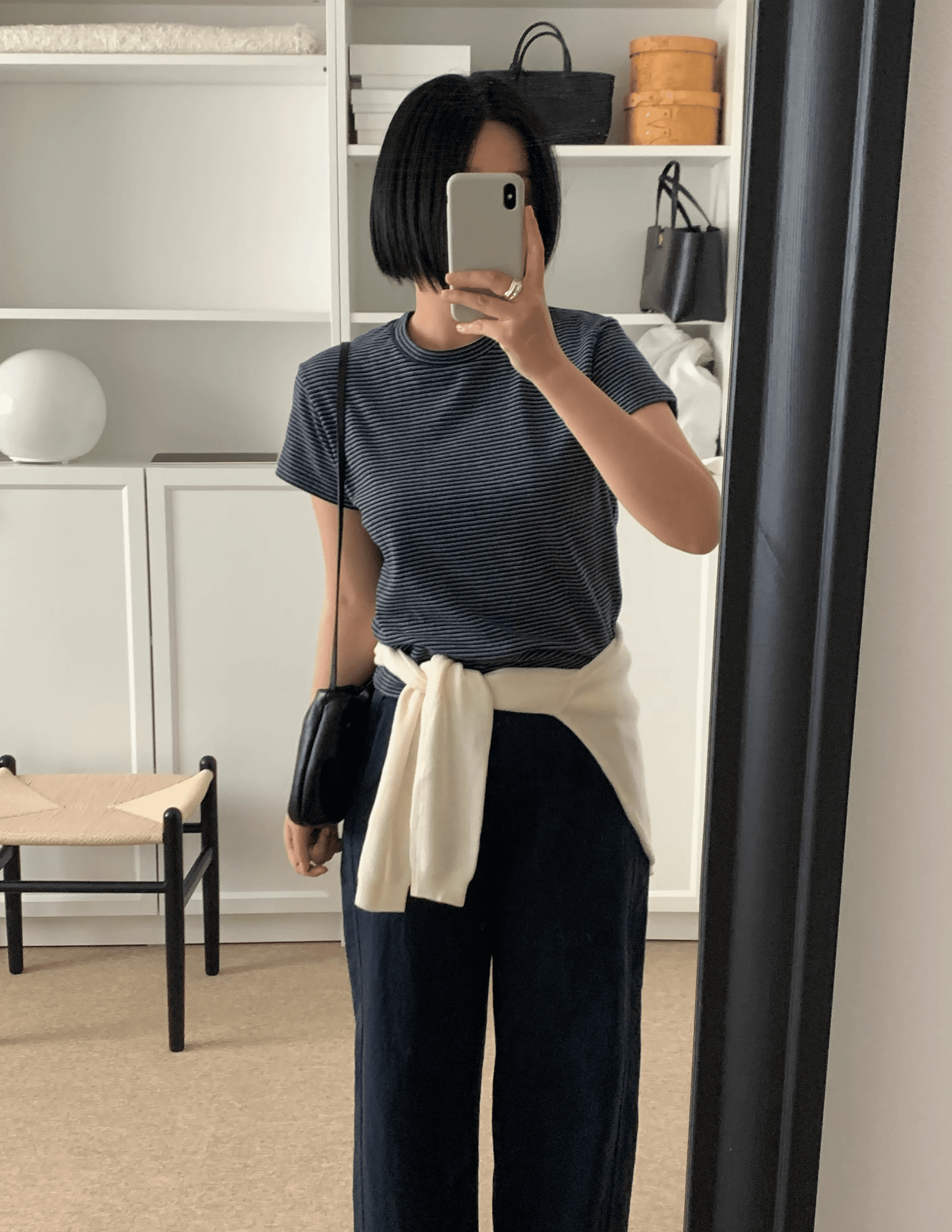 네이비 컬러의 스트라이프 티셔츠에 매치한 와이드 팬츠로 깔끔하고 편안한 캐주얼룩을 선보였어요. 편안하면서도 센스 있는 데일리룩을 완성했어요.