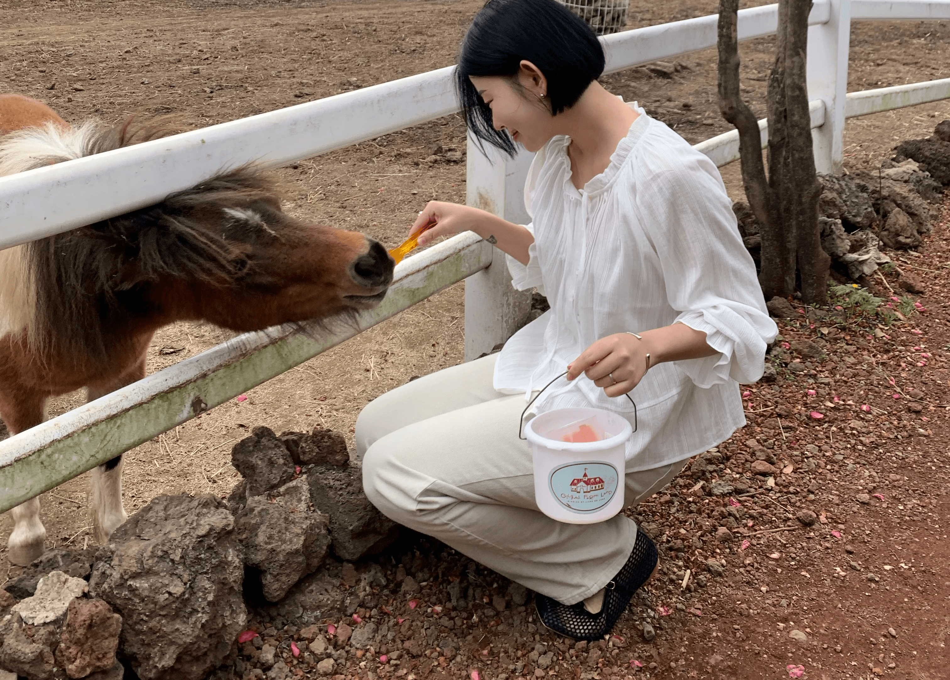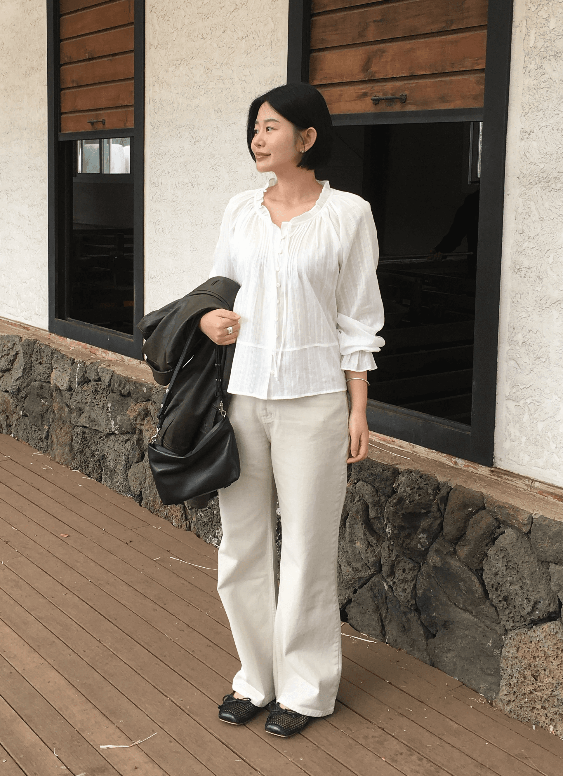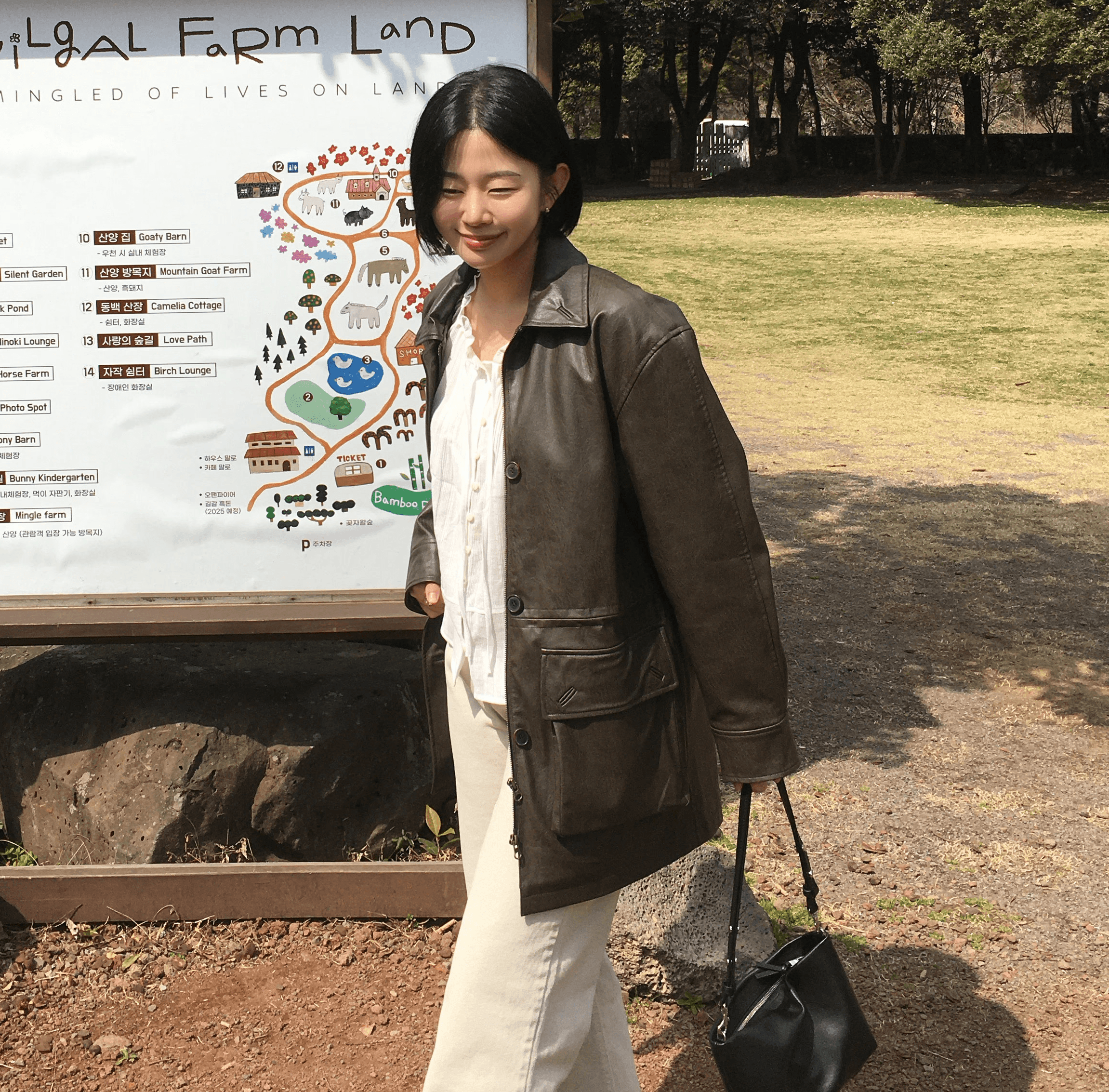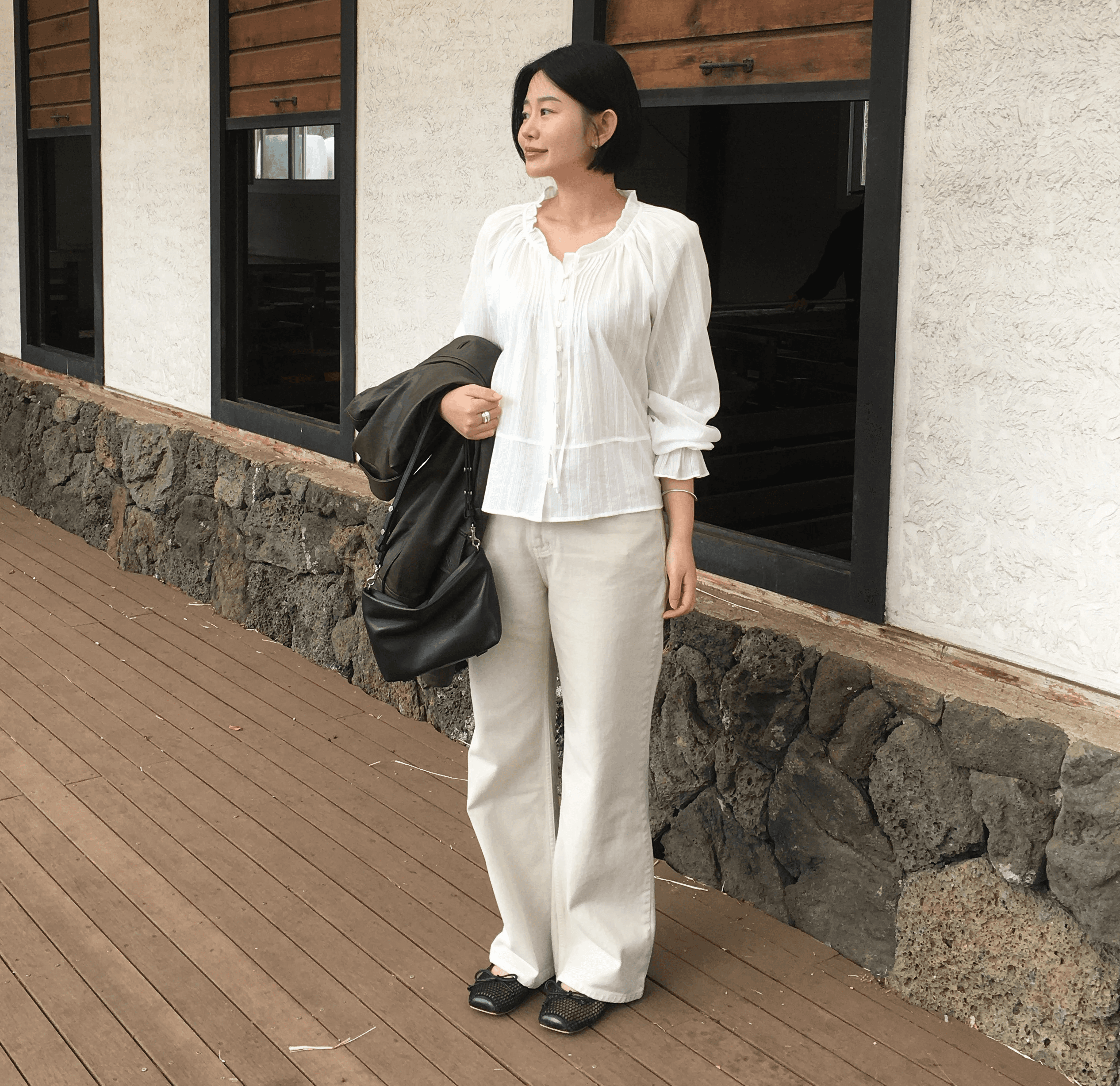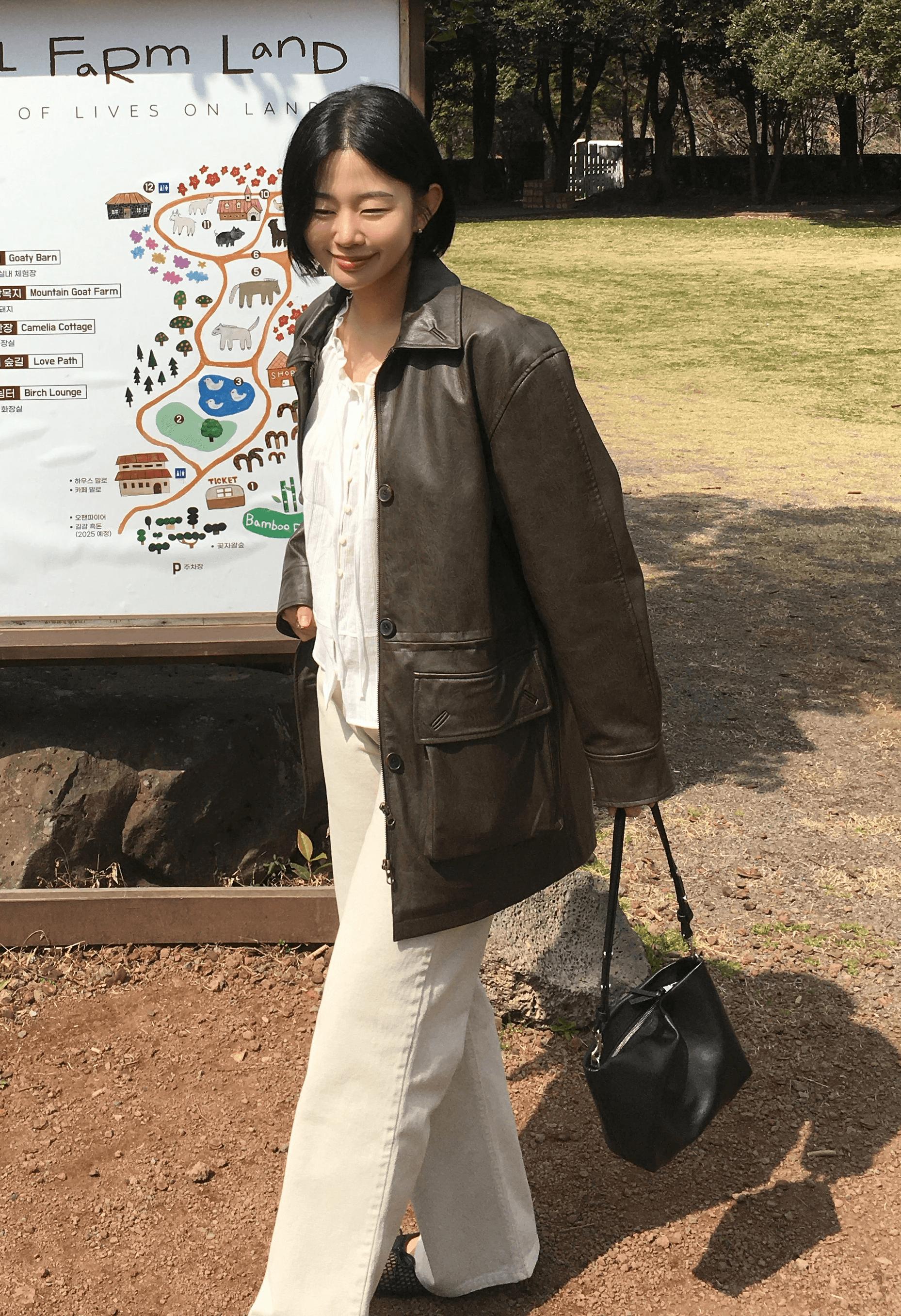 화이트 셔링 블라우스에 크림색 팬츠를 매치하여 청순한 톤온톤 매치에 내추럴한 무드를 완성했고, 브라운 레더 재킷의 세련되면서도 시크한 매력을 더했어요.