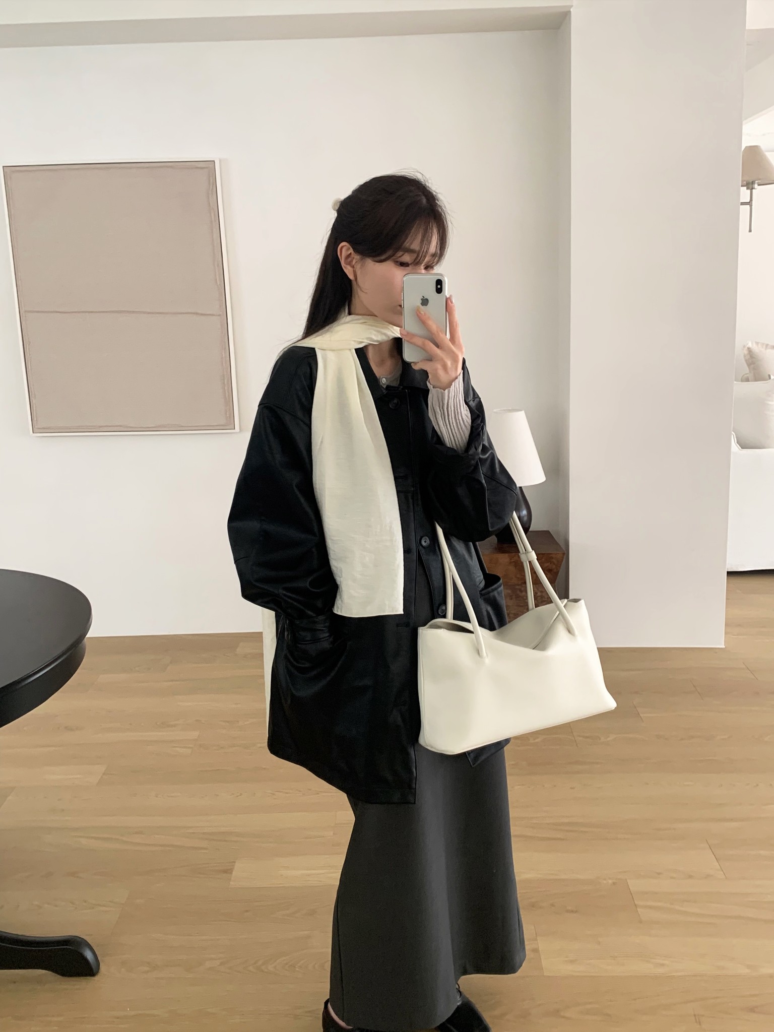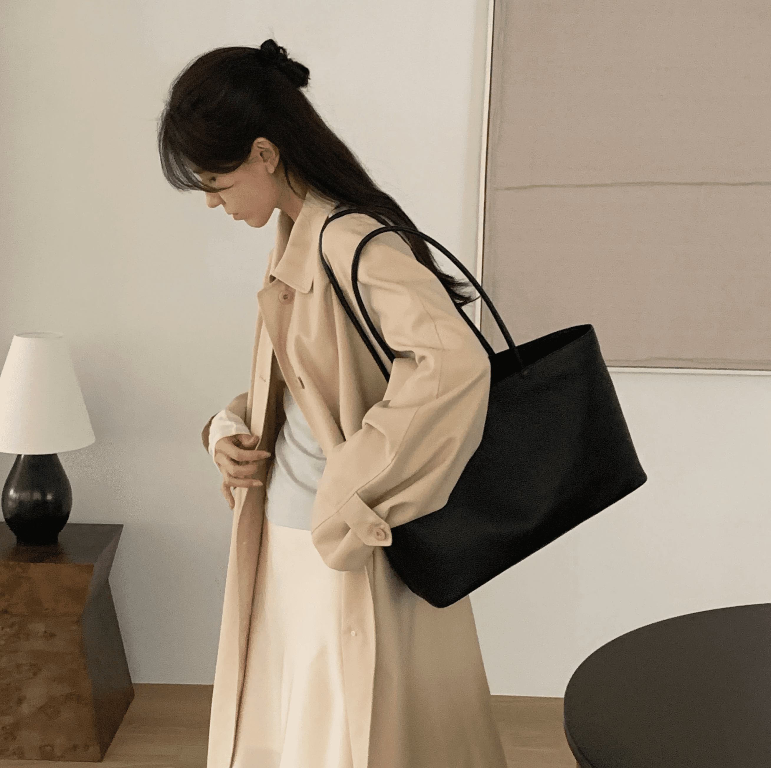 은은한 결감의 오플 소가죽을 사용해 수납력이 좋고 유행 없이 오래 들 수 있는 기본 쇼퍼 백이에요.