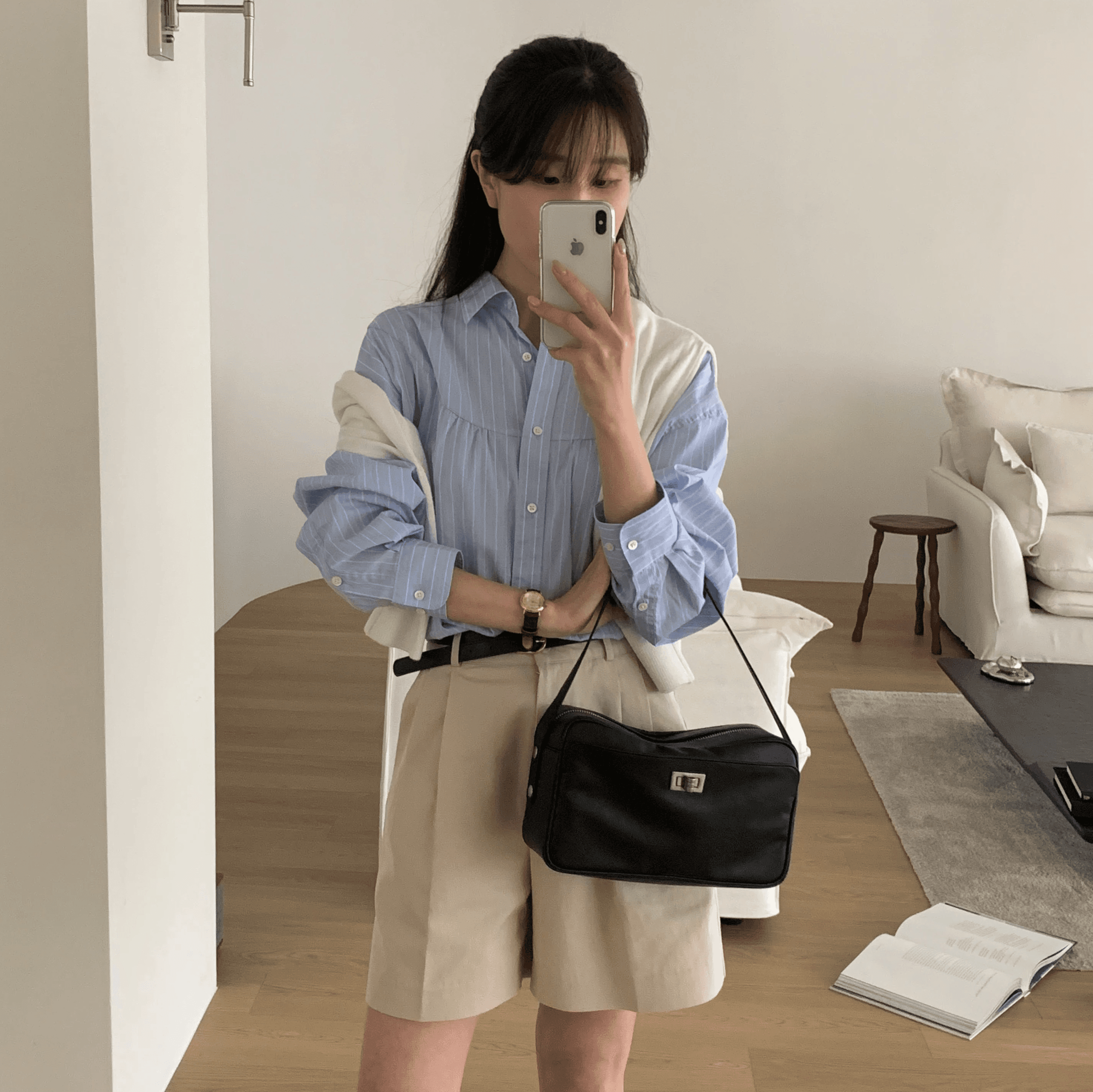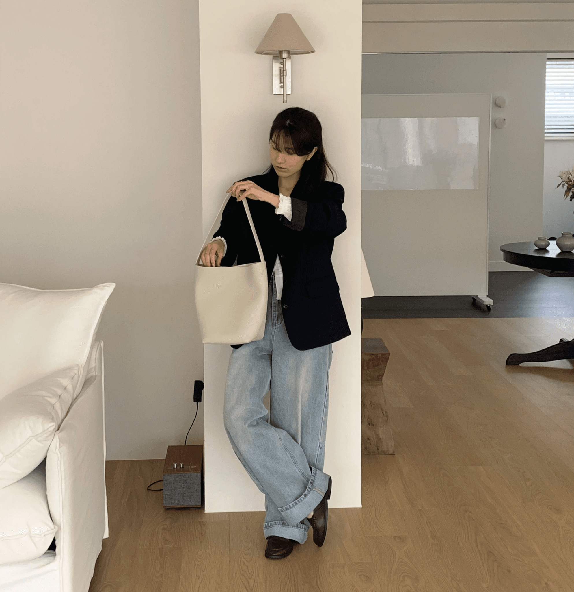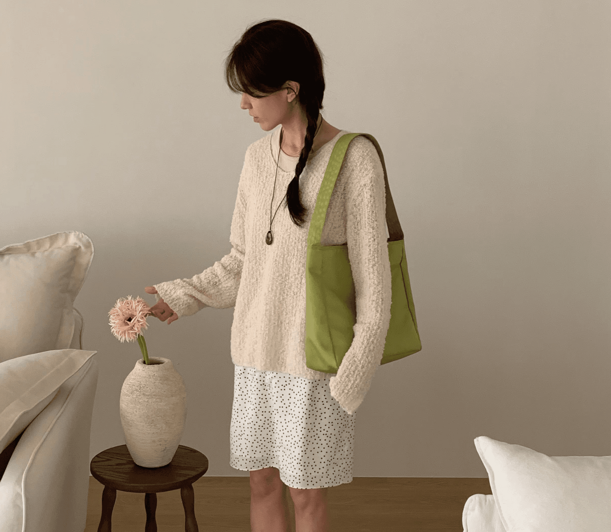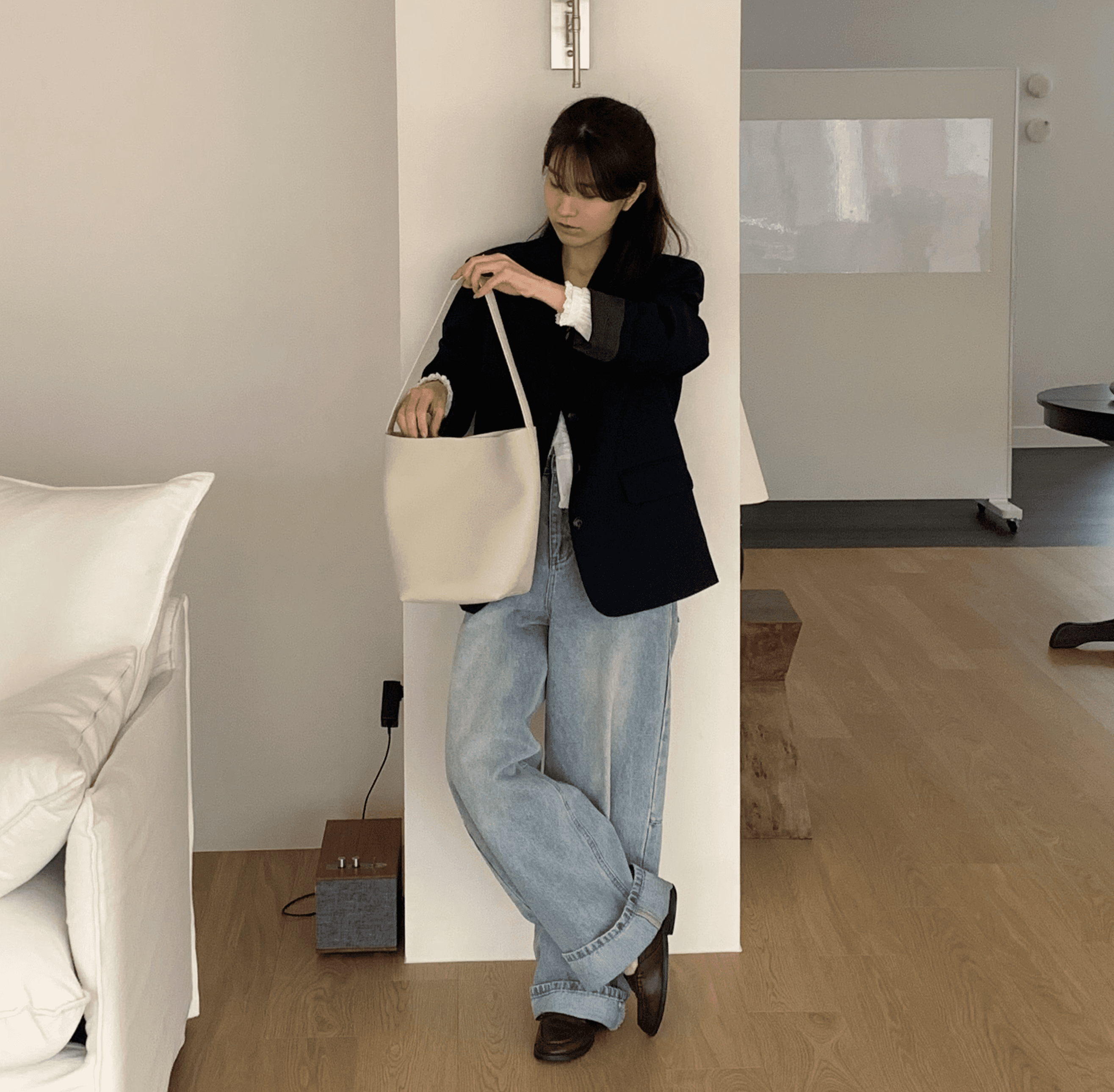 매일매일 사용하기 좋은 심플한 디자인과 수납력의 숄더백으로 일반 아이보리 컬러에 비해 그레이톤이 살짝 더해진 컬러감입니다.