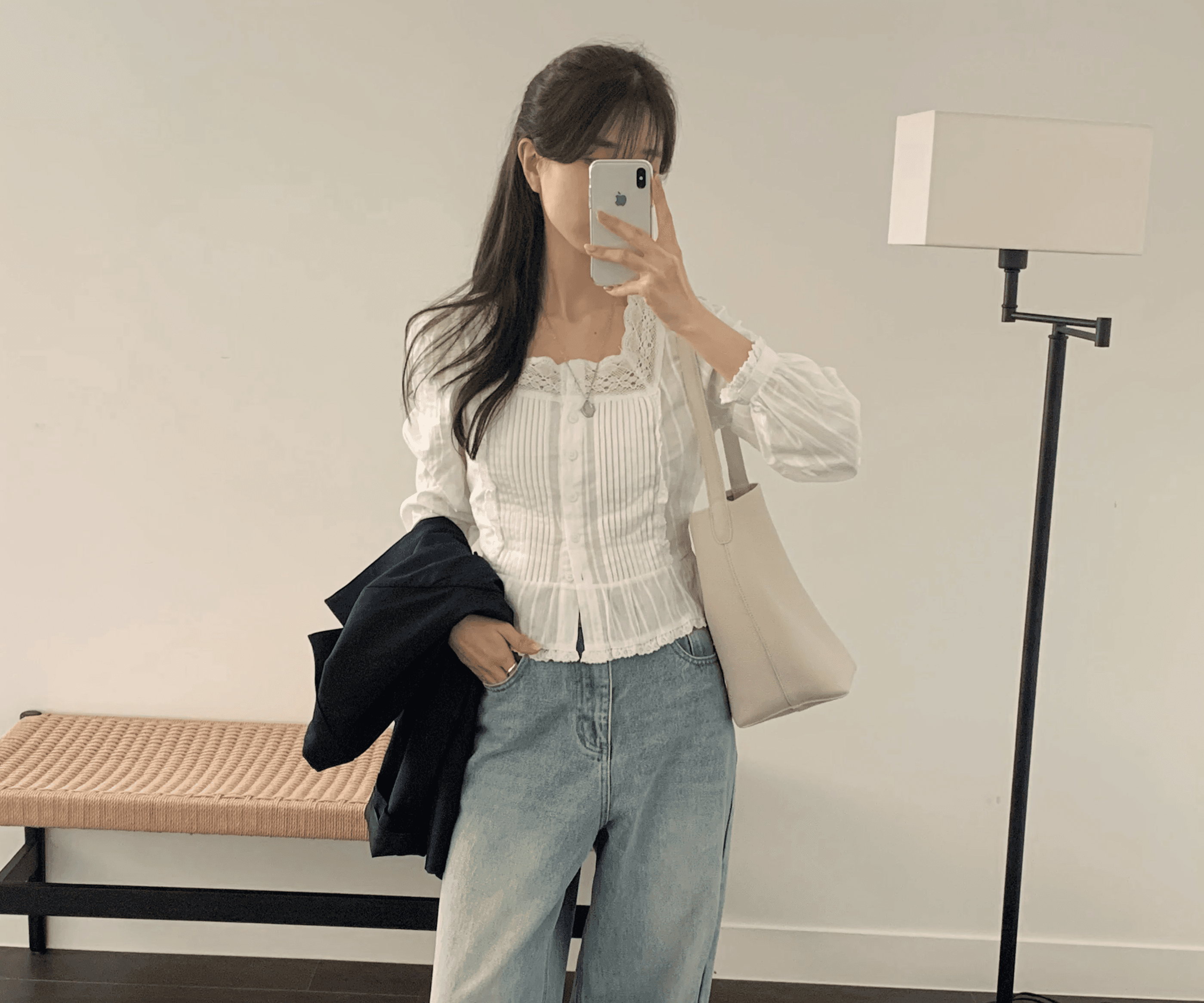 밑으로 떨어지는 곡선과 전면 와이드 포켓의 직선이 대조를 이루도록 디자인한 숄더백이에요.