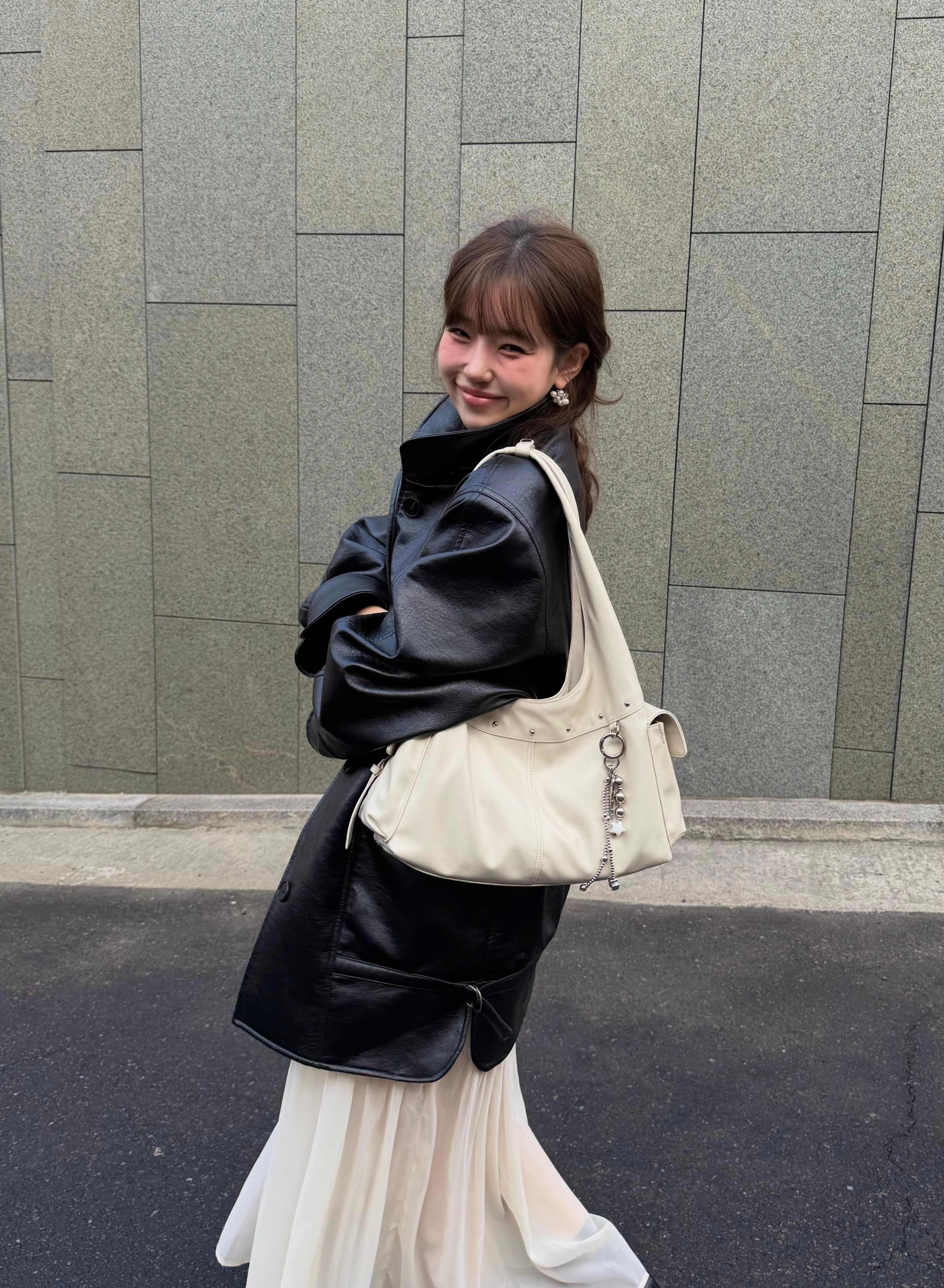 혜인이 선택한 아이보리 컬러의 삭클루를 만나보세요. 키링 고리가 더해져 취향에 맞게 다양한 키링 스타일링을 연출할 수 있어요. 스터드 디테일과 포켓 포인트를 더해 파퓸드로브만의 무드를 완성했어요.