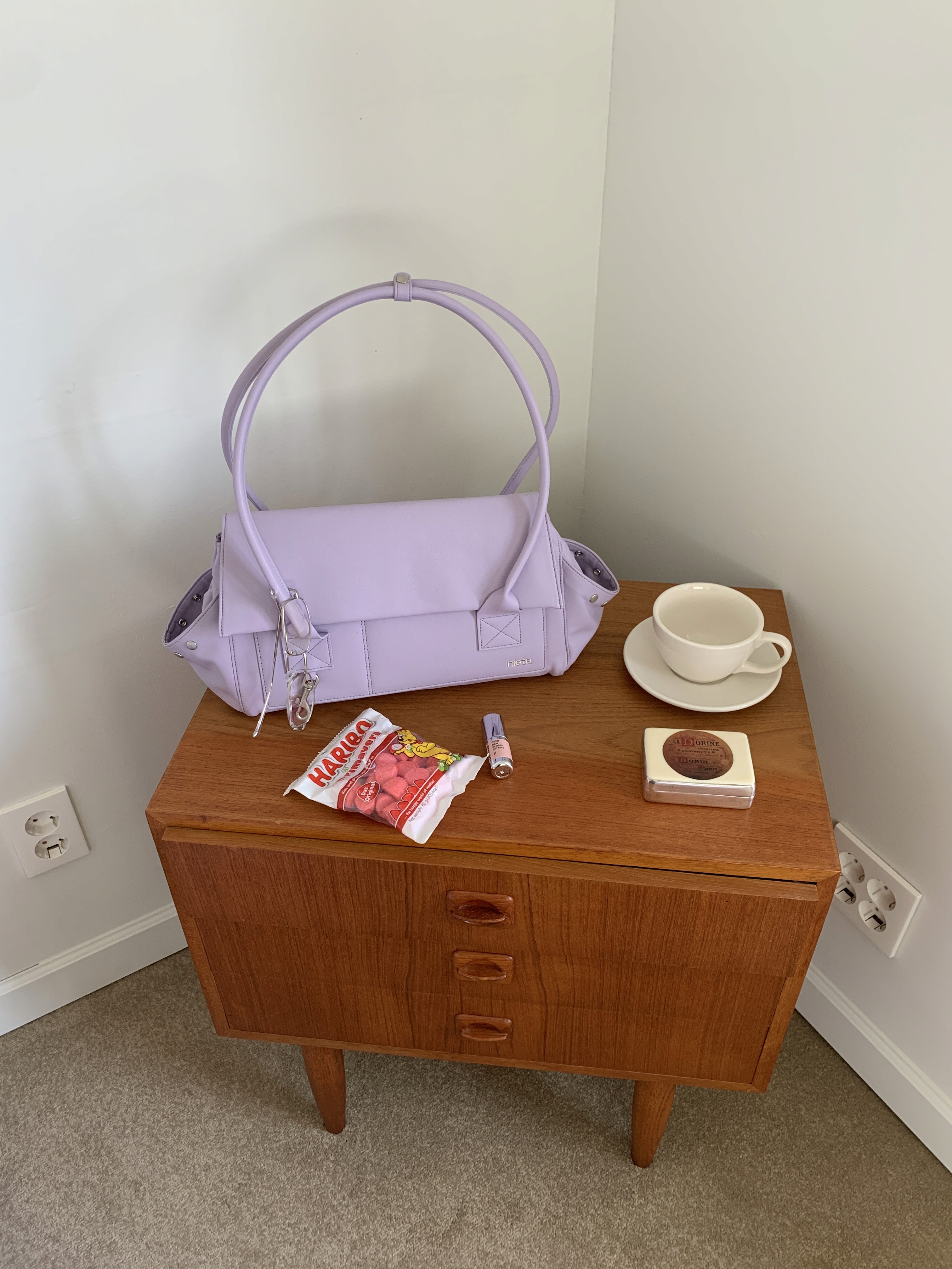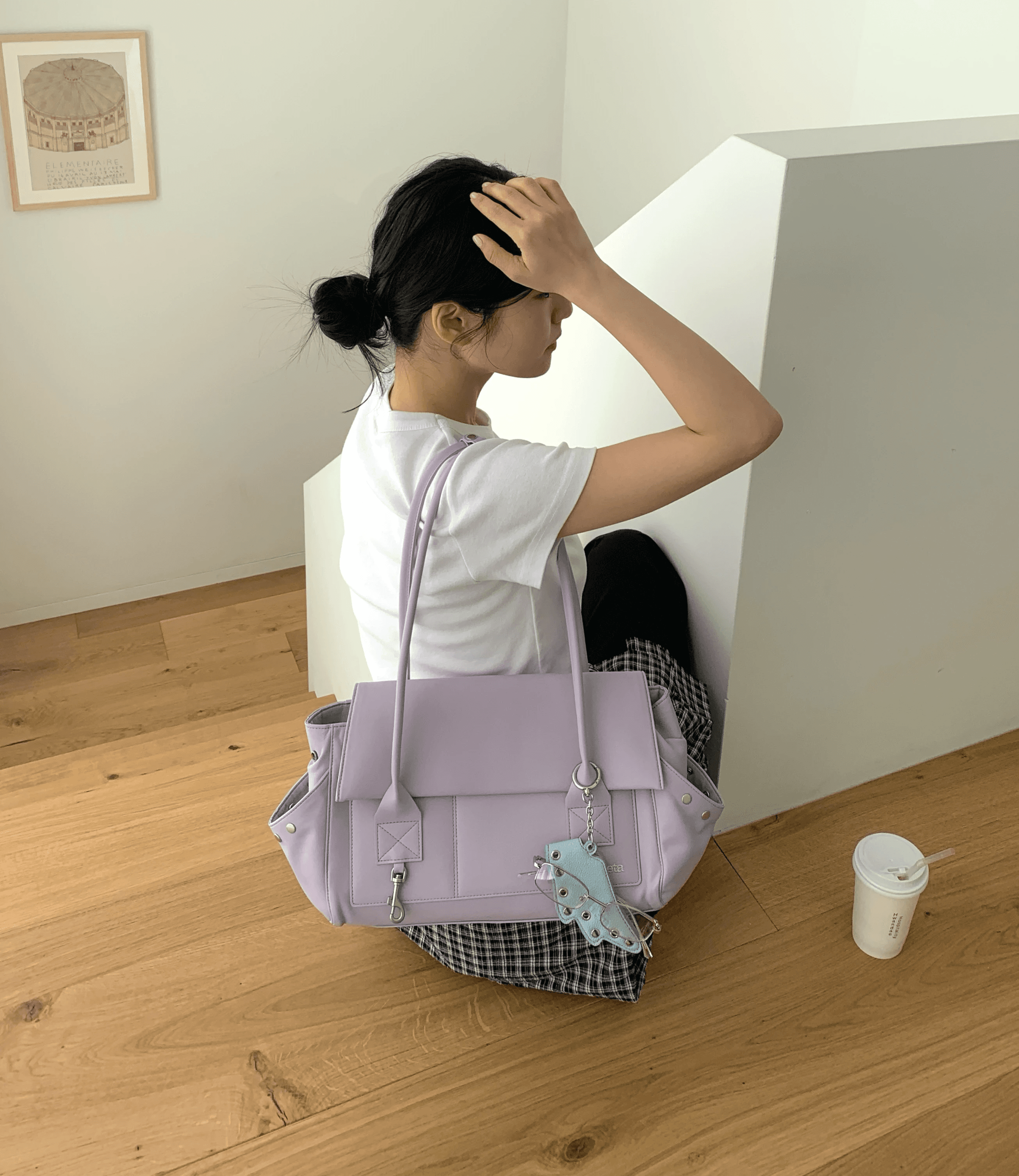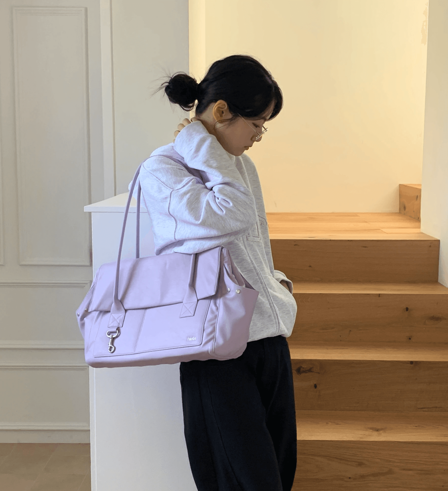 더블 핸들로 연결된 숄더백으로, 바디 전면에 분리형 오픈포켓 디자인으로, 라일락 컬러가 매력적인 숄더백입니다.