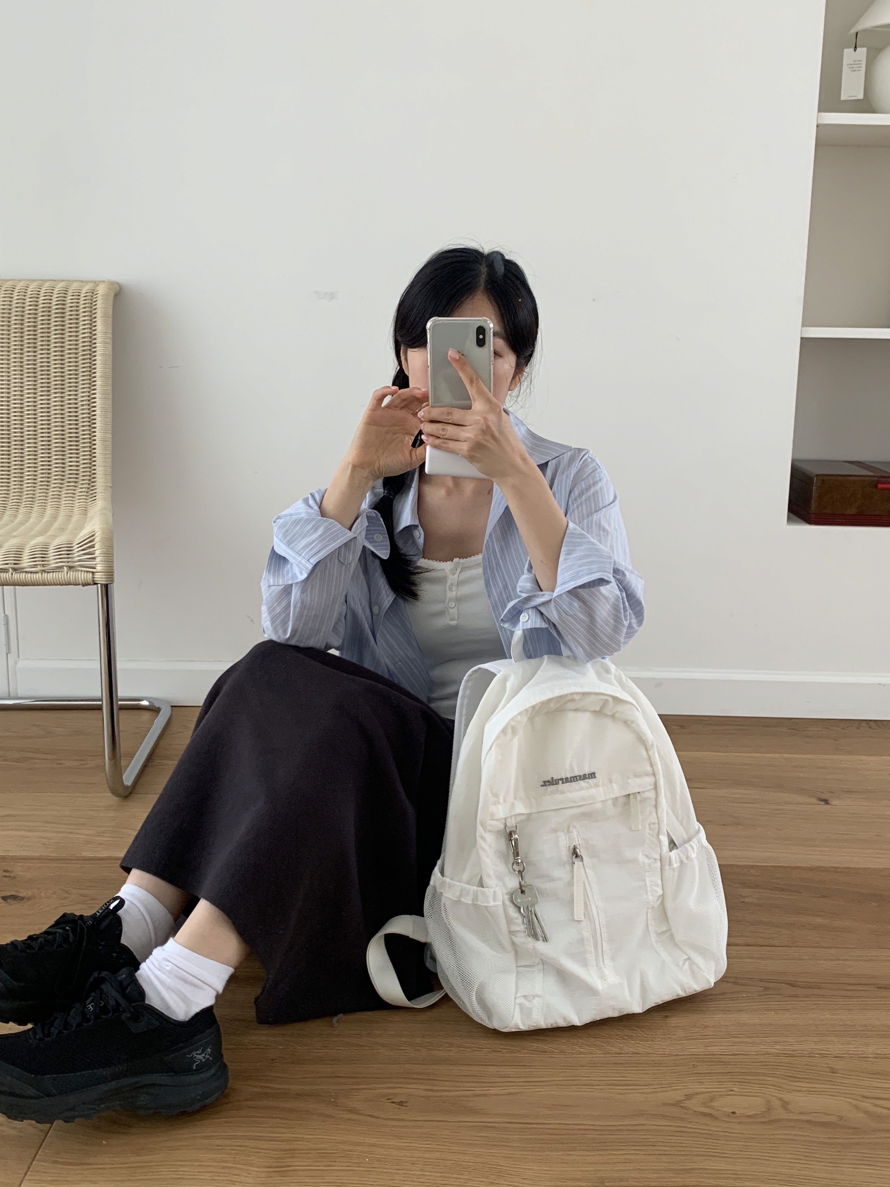 사이드 셔링 디테일로 자연스렁룬 볼륨감을 더하고 포켓과 키링 고리가 있어 스타일리쉬하게 연출이 가능한 백팩입니다.