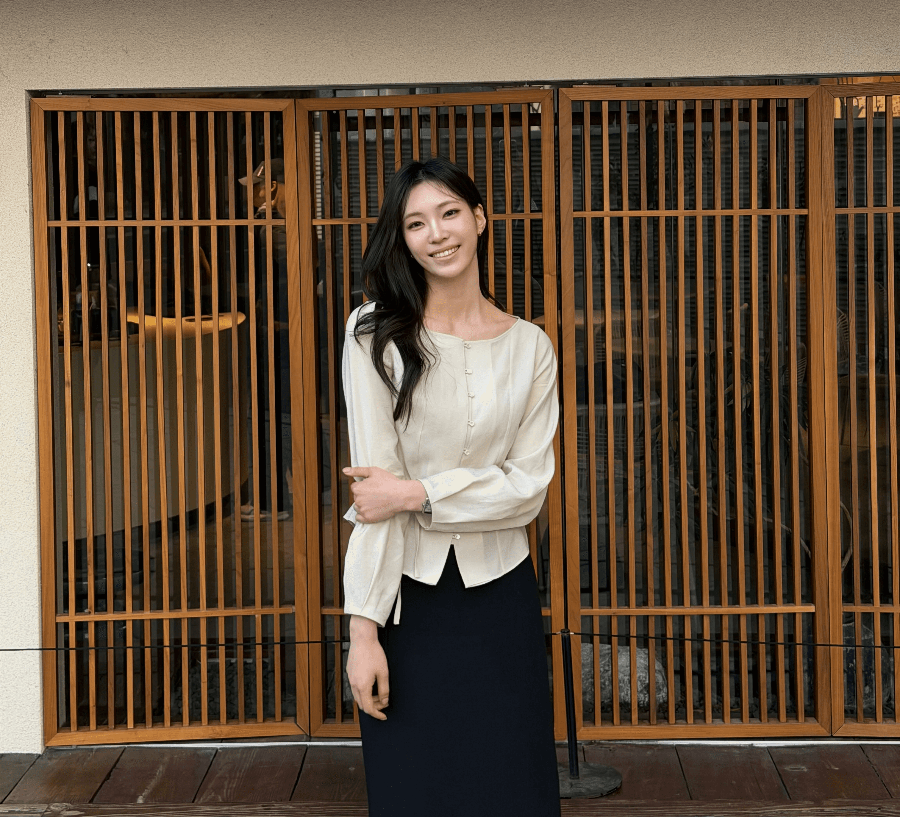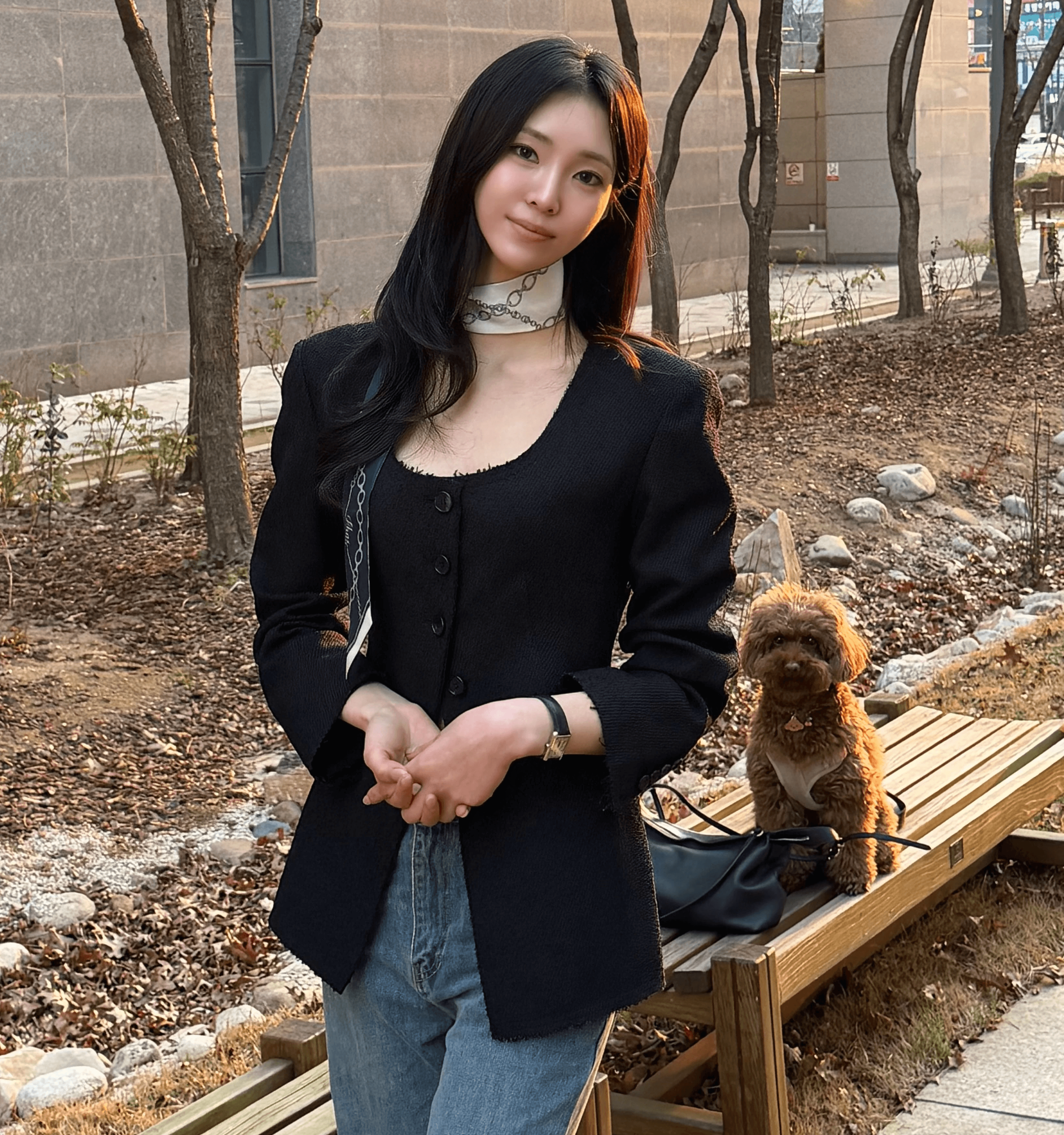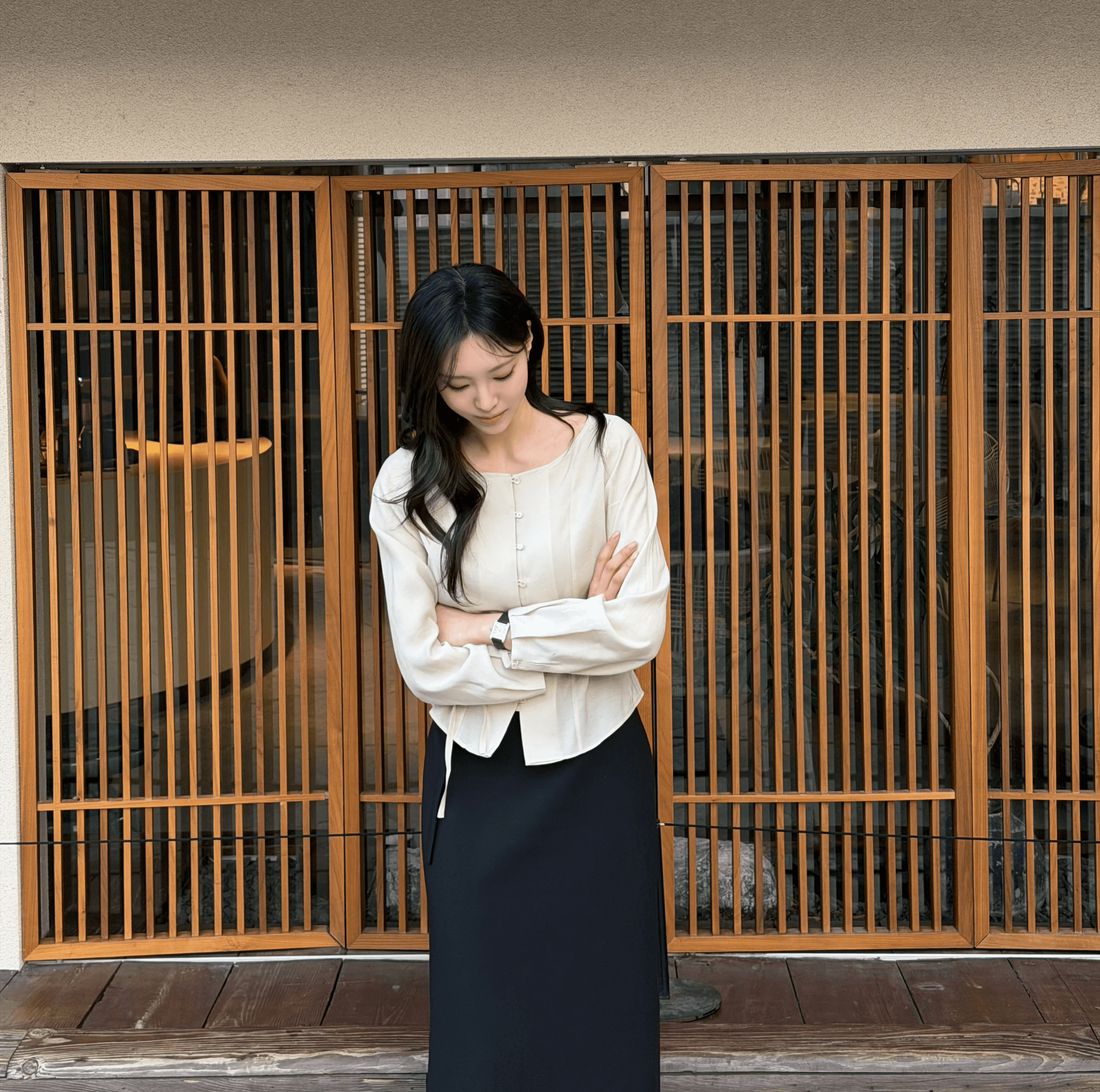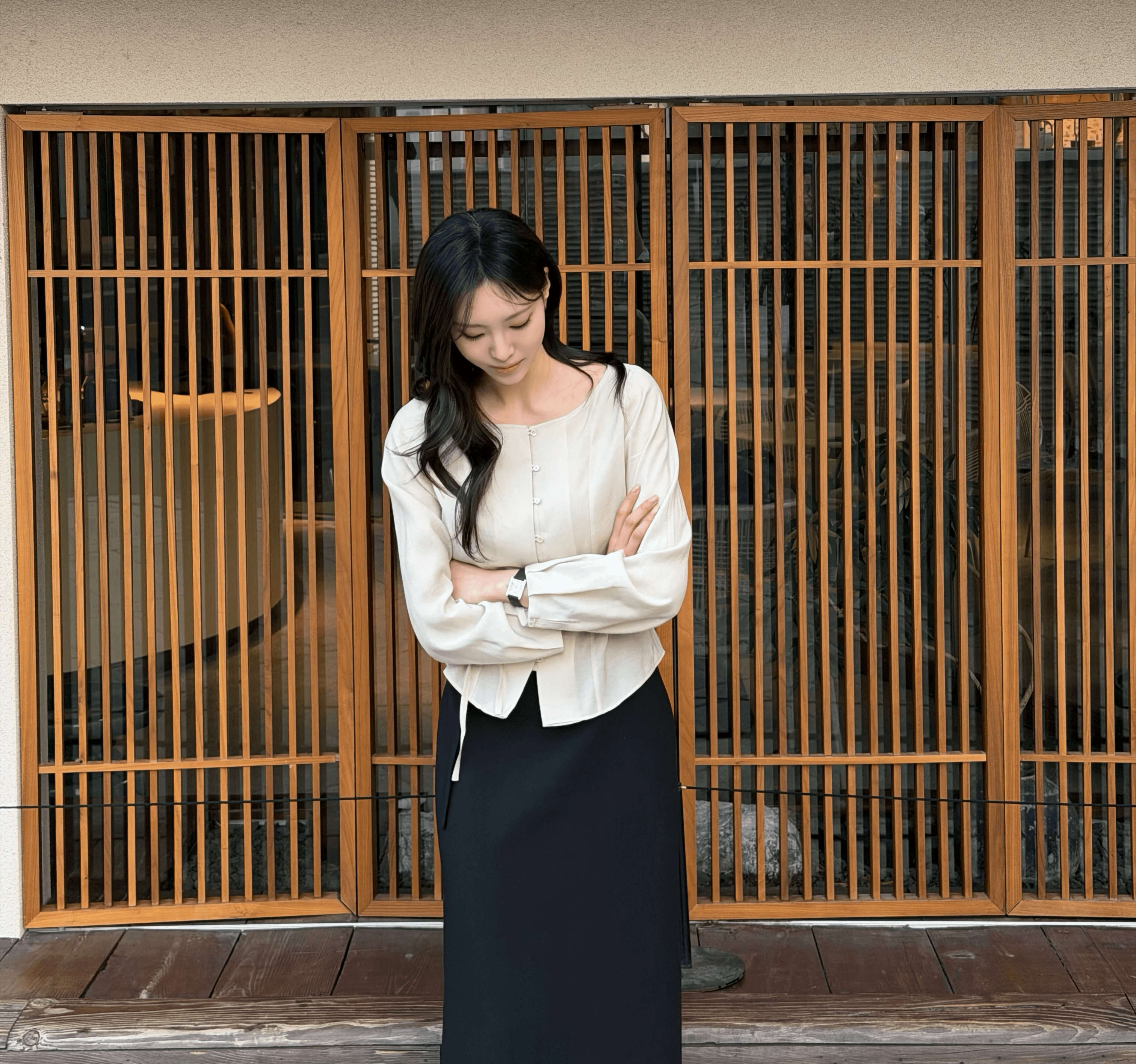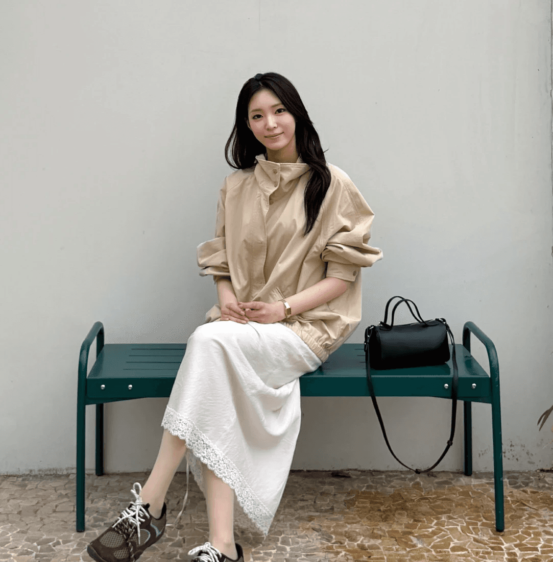 환절기 활용도 높은 시야쥬 코디입니다. 코튼 모달 아우터로 부드럽고 가벼워 간절기에 툭 걸치기 좋아요. 베이지 블루종은 29CM 단독이며 하이넥은 분위기, 내려 입으면 단정해 출근룩에도 딱. 이너는 슬림핏에 쫀득한 소재, 브이넥 포인트로 단독 착용도 OK. 스커트와 토트백 매치로 은근 꾸민 데일리룩 완성이에요.