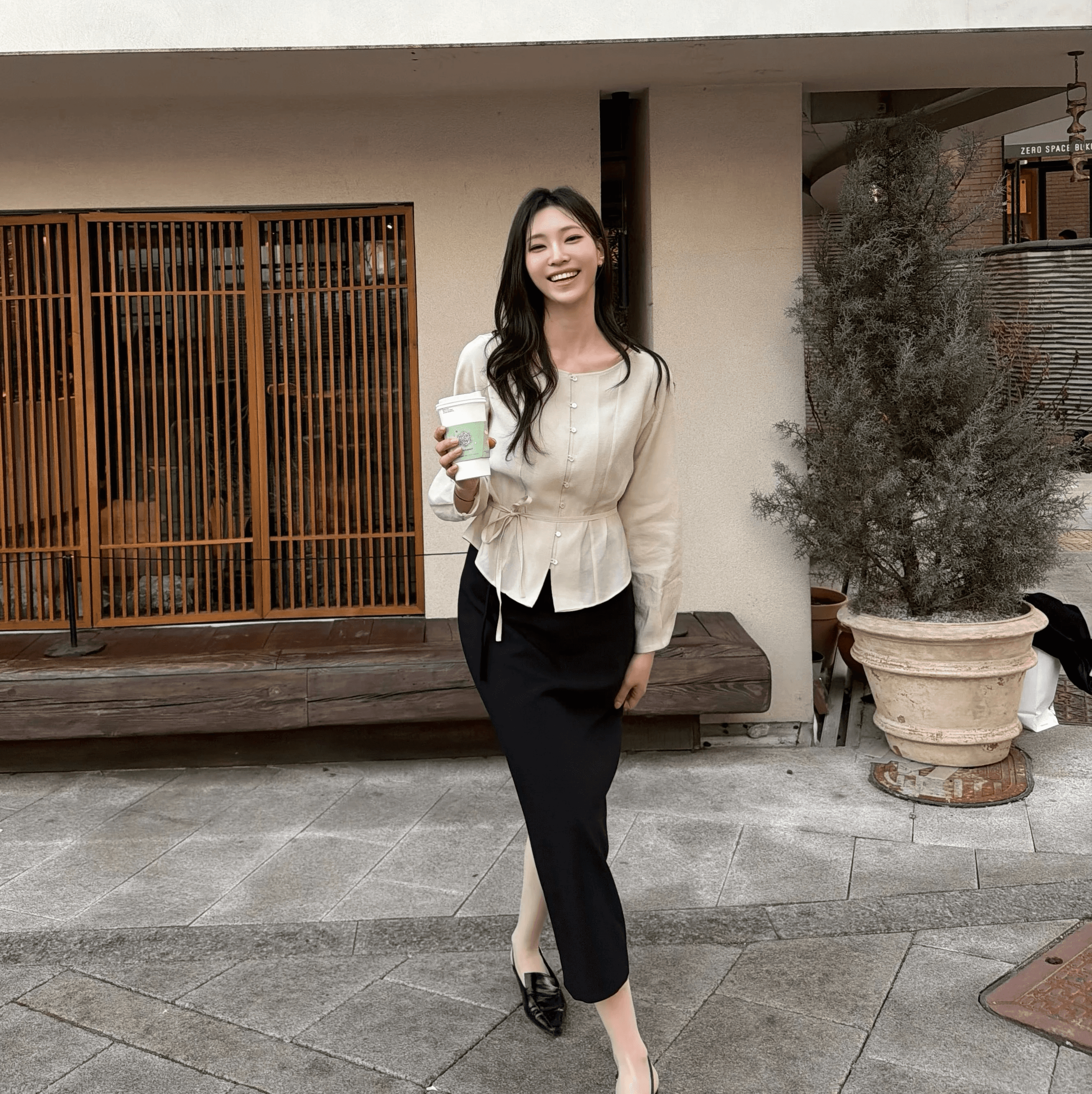 여성스러운 느낌의 엘로주 코디에요. 깔끔하게 떨어지는 핏에 보트넥 블라우스로 여리한 분위기 완성. 시어한 소재로 답답함 없고, 허리 스트링으로 실루엣을 살릴 수 있어요. 세미 H라인 스커트는 체형 커버와 편안함까지, 벨트로 라인 정리하면 데일리부터 꾸안꾸까지 활용도 높은 코디입니다.