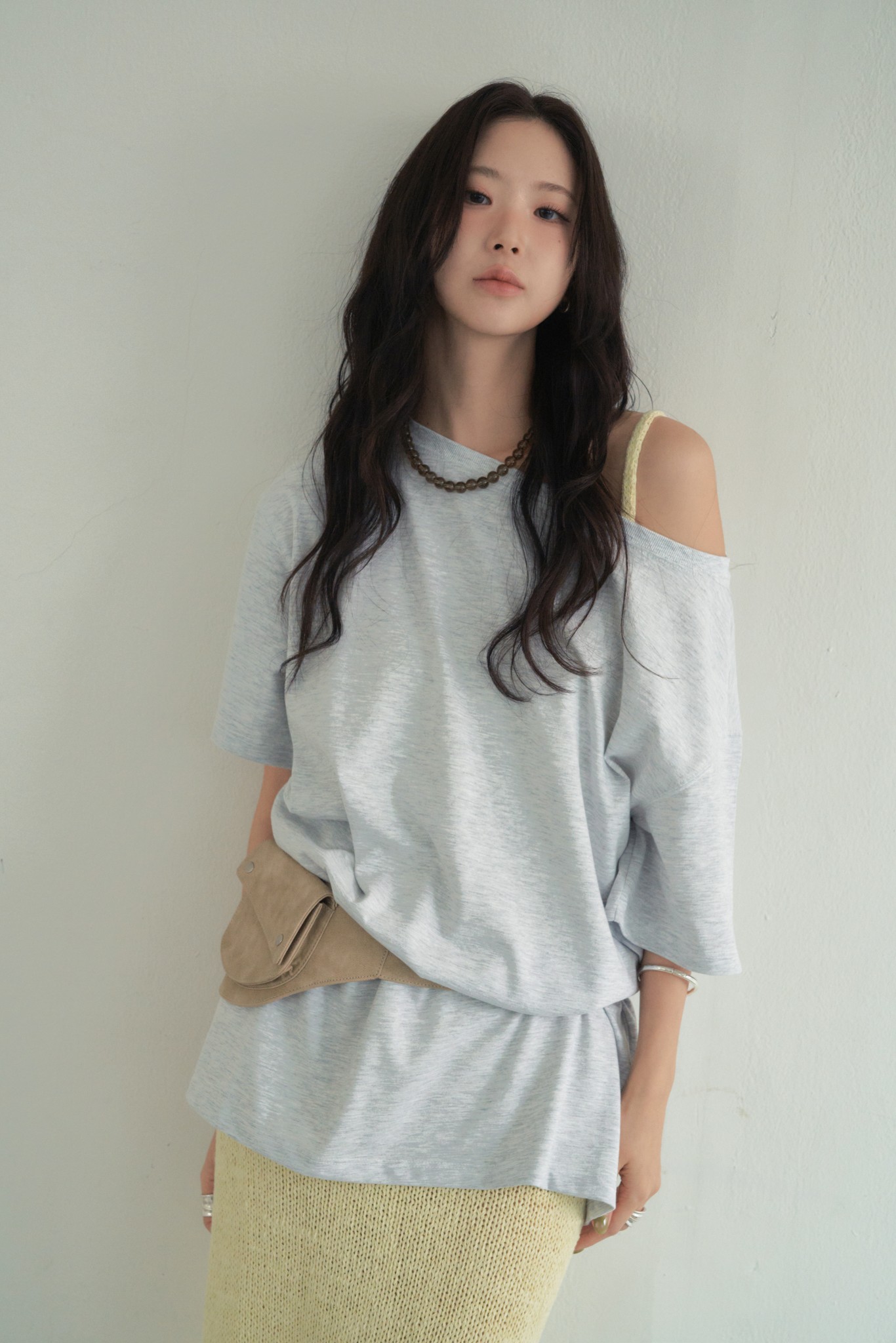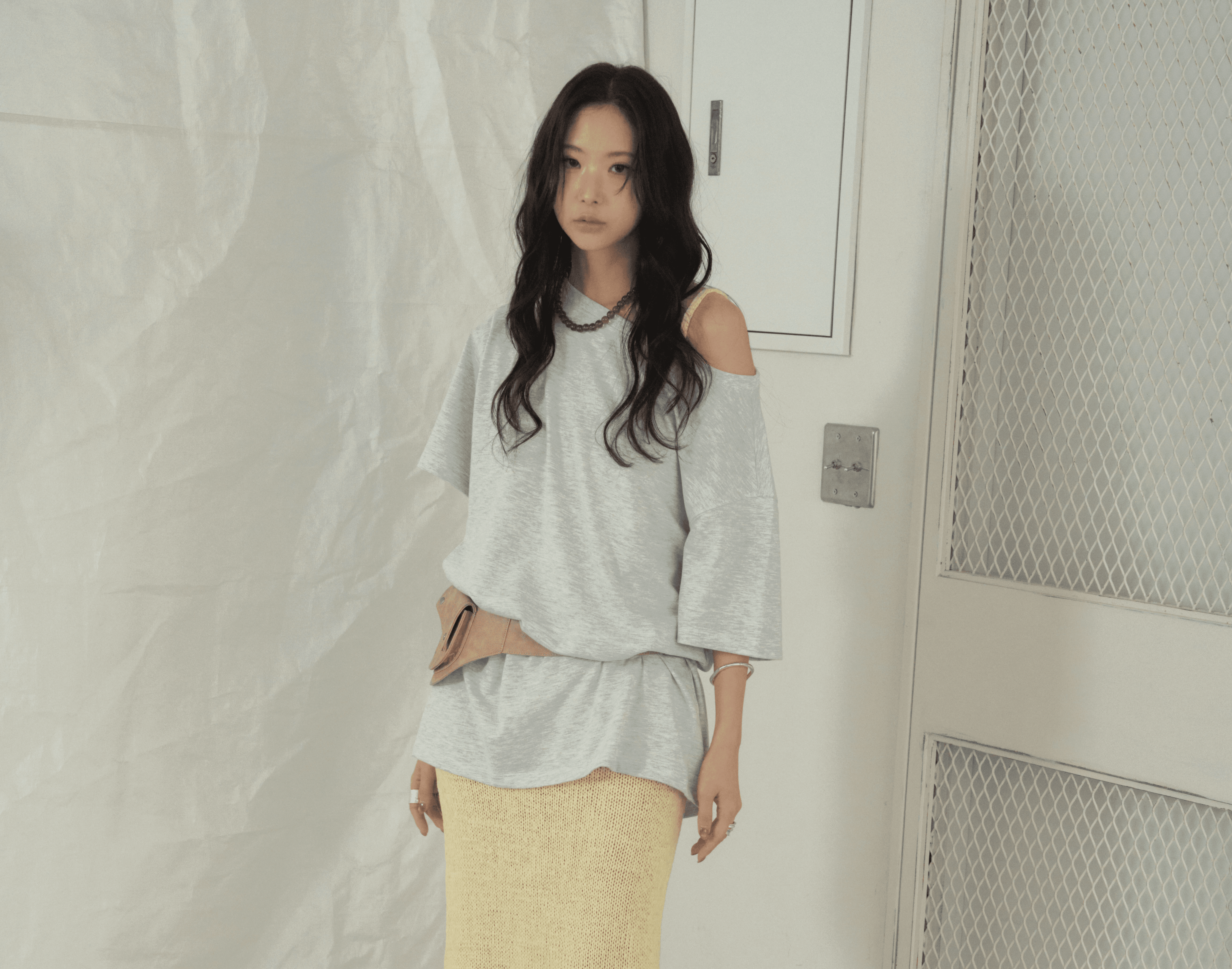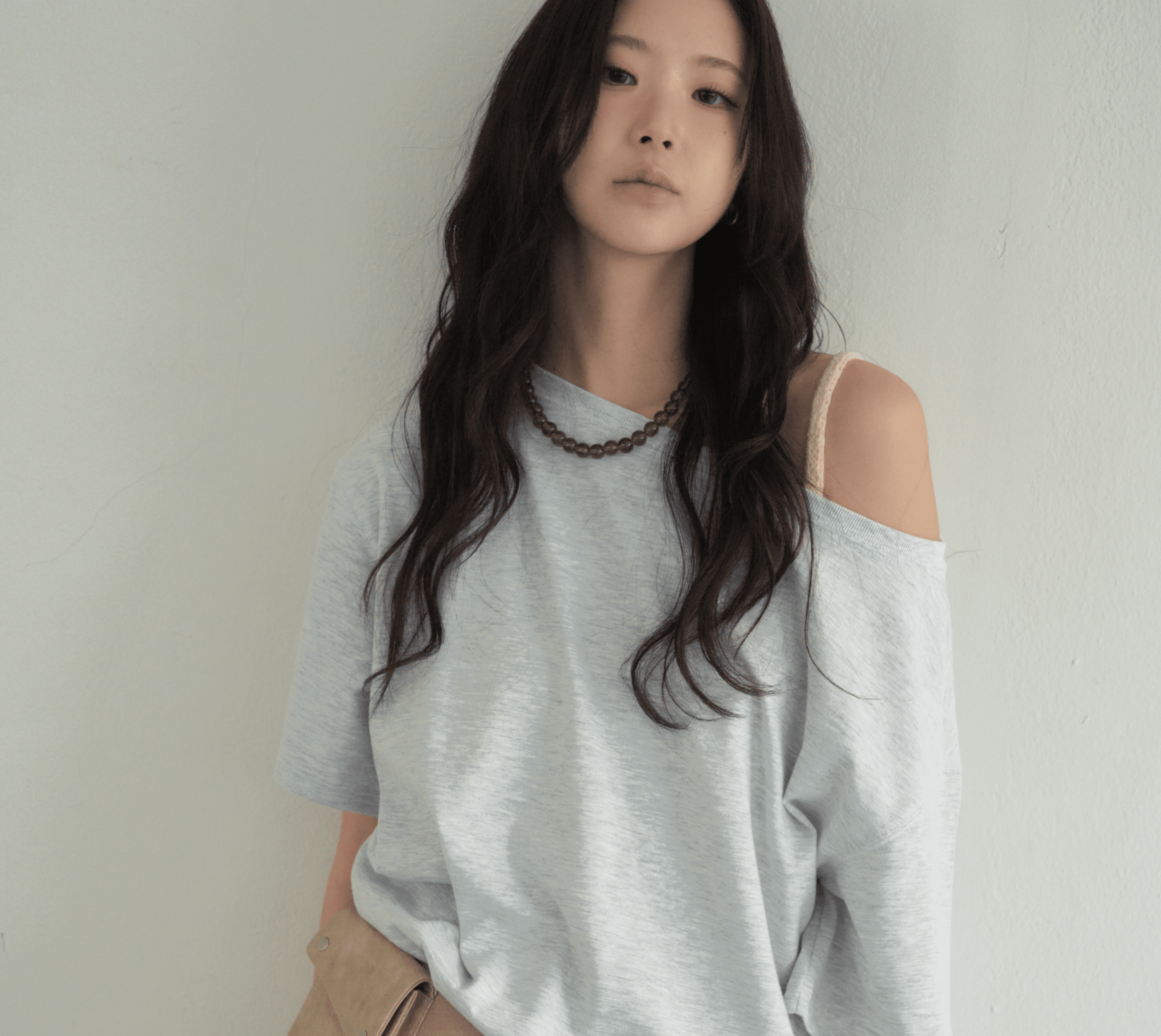 여유로운 오버핏과 어깨라인이 부드럽게 드러나는 오프숄더 넥 라인이 조화를 이루어 여리여리한 무드를 완성합니다.