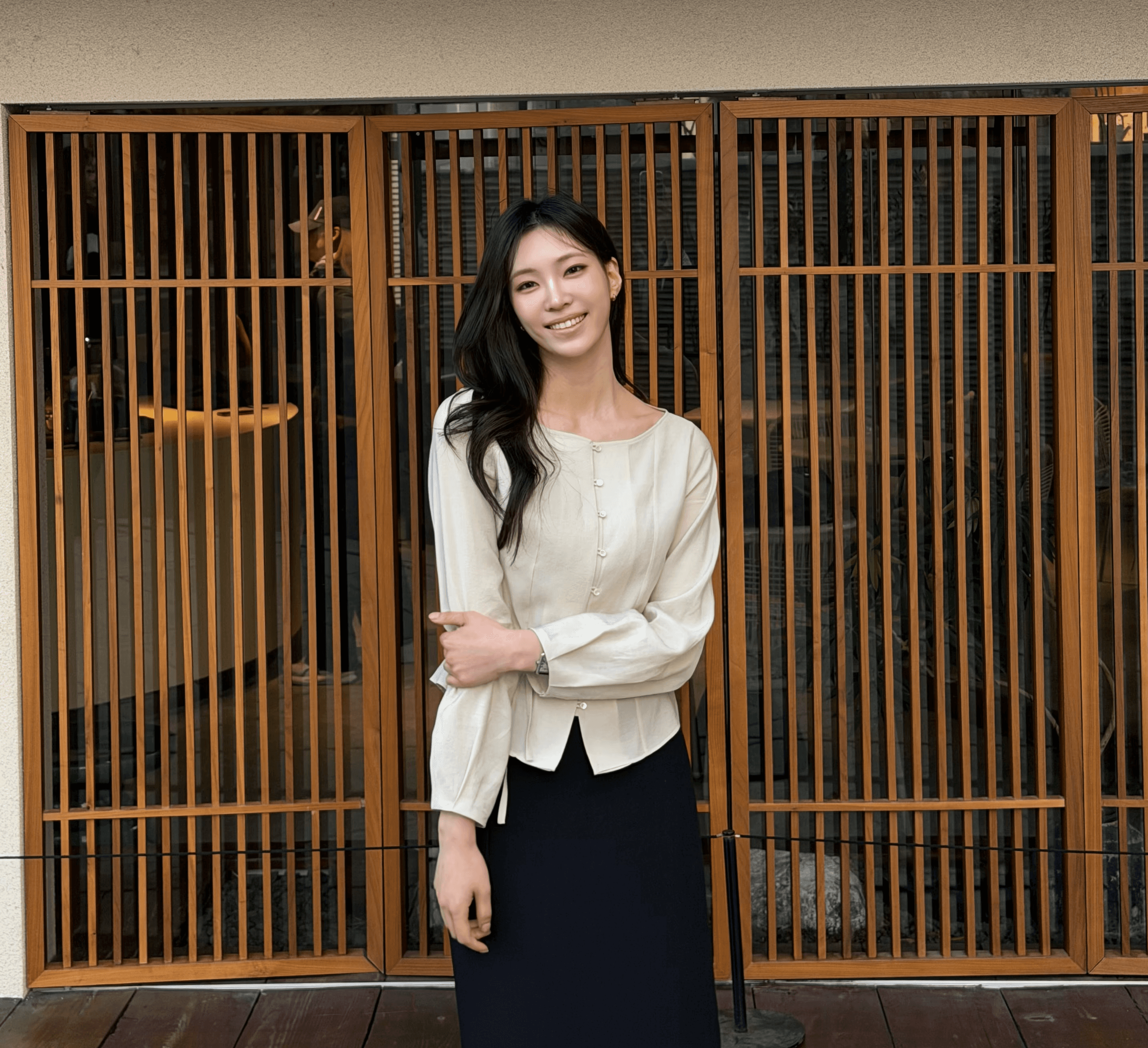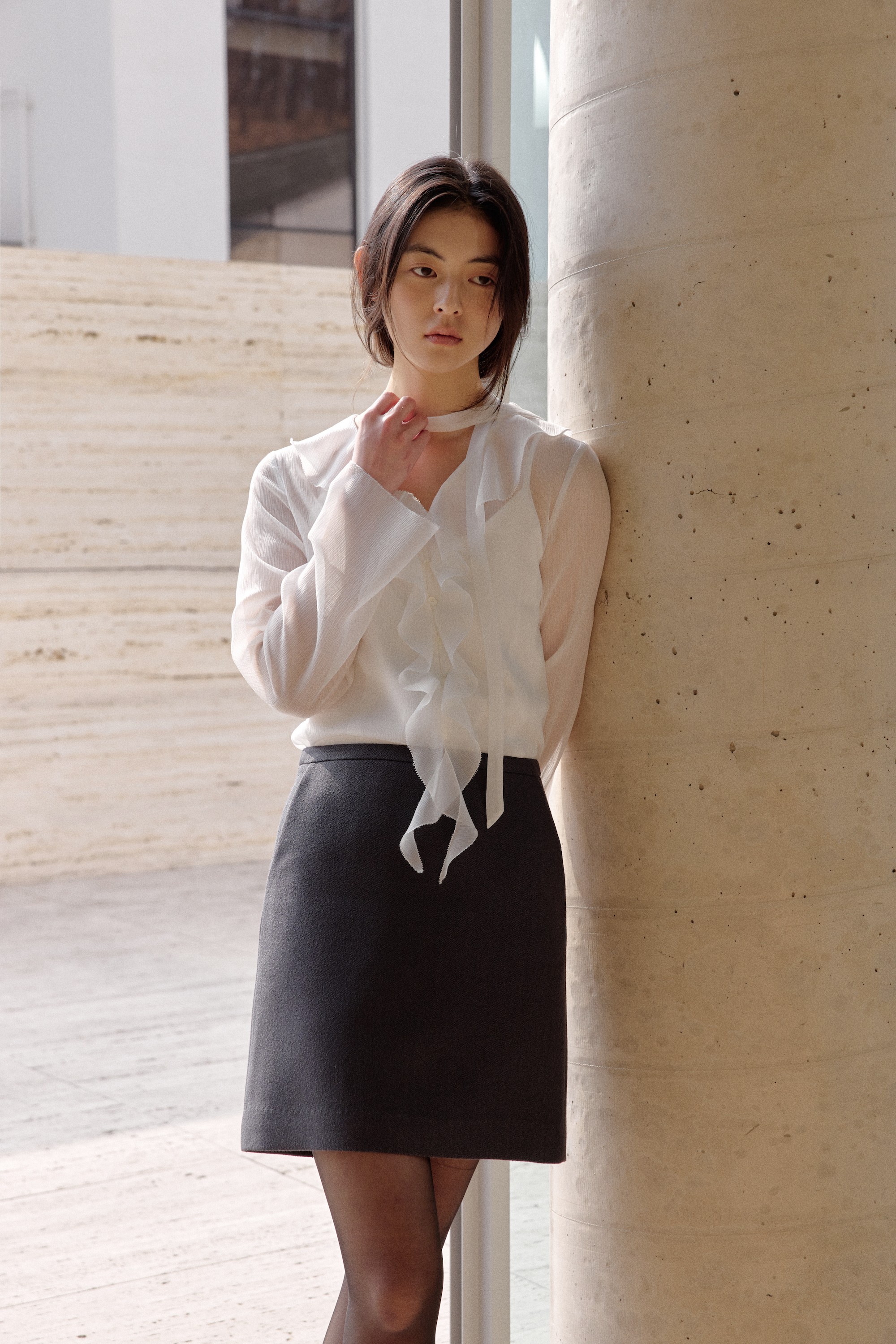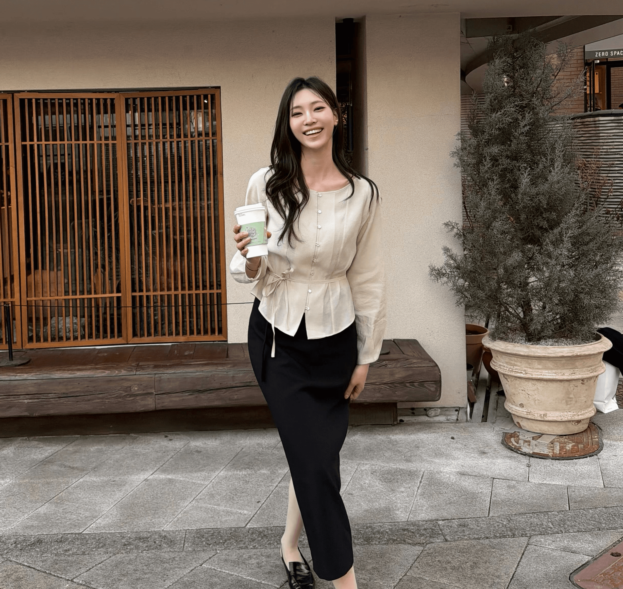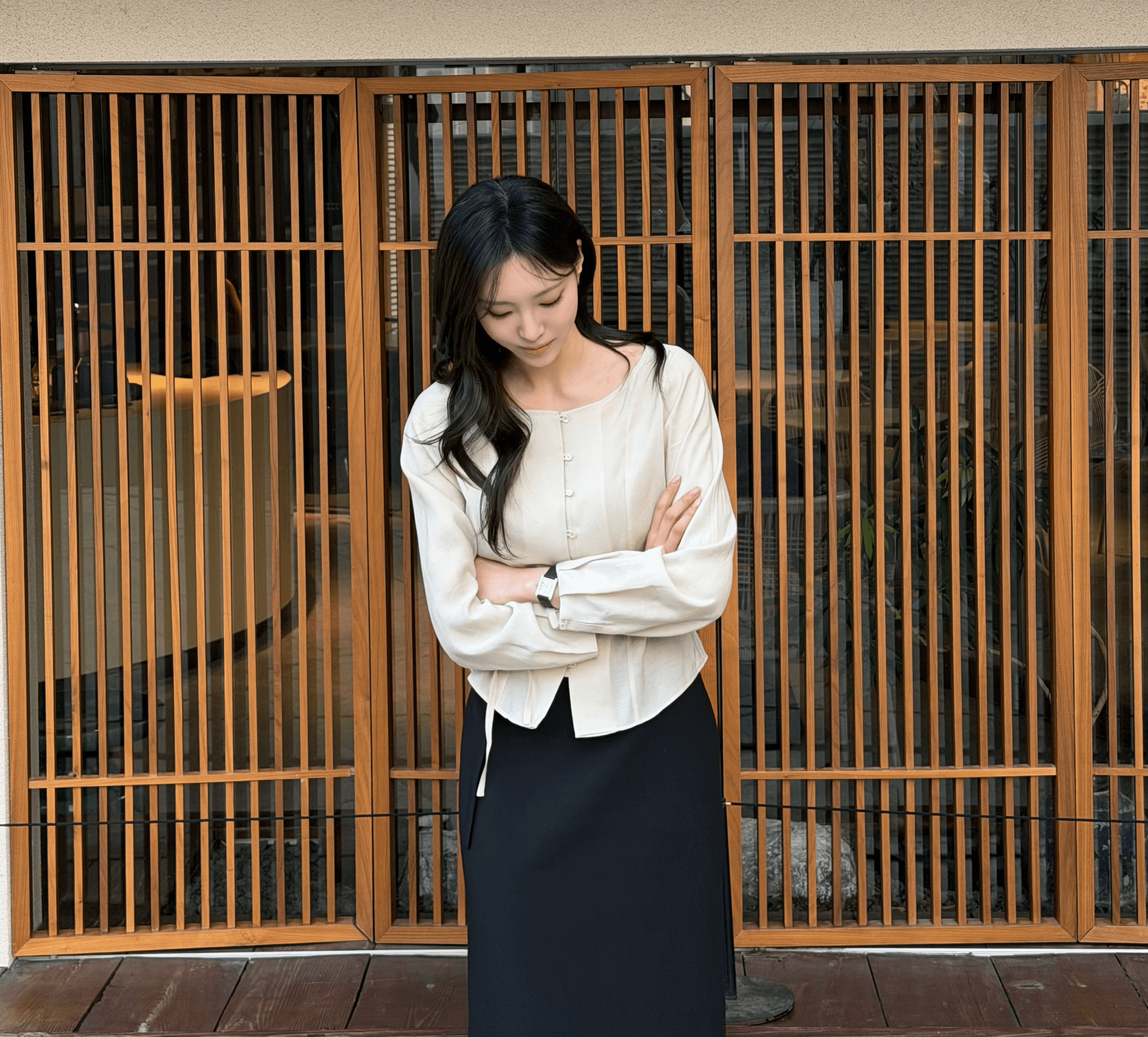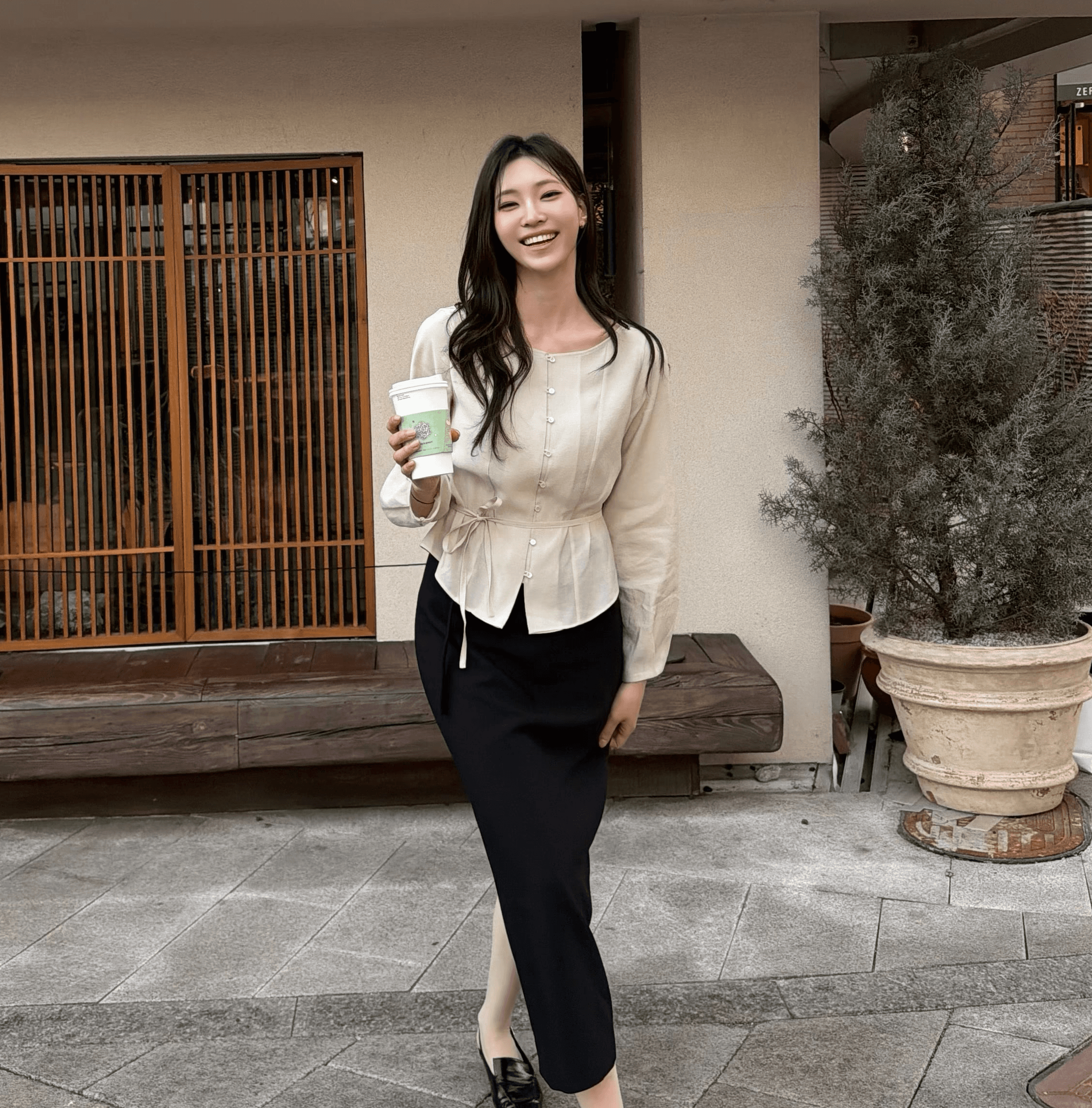 현지의 단정하면서 클래식한 블라우스와 스커트로 완성한 데이트룩을 만나보세요.