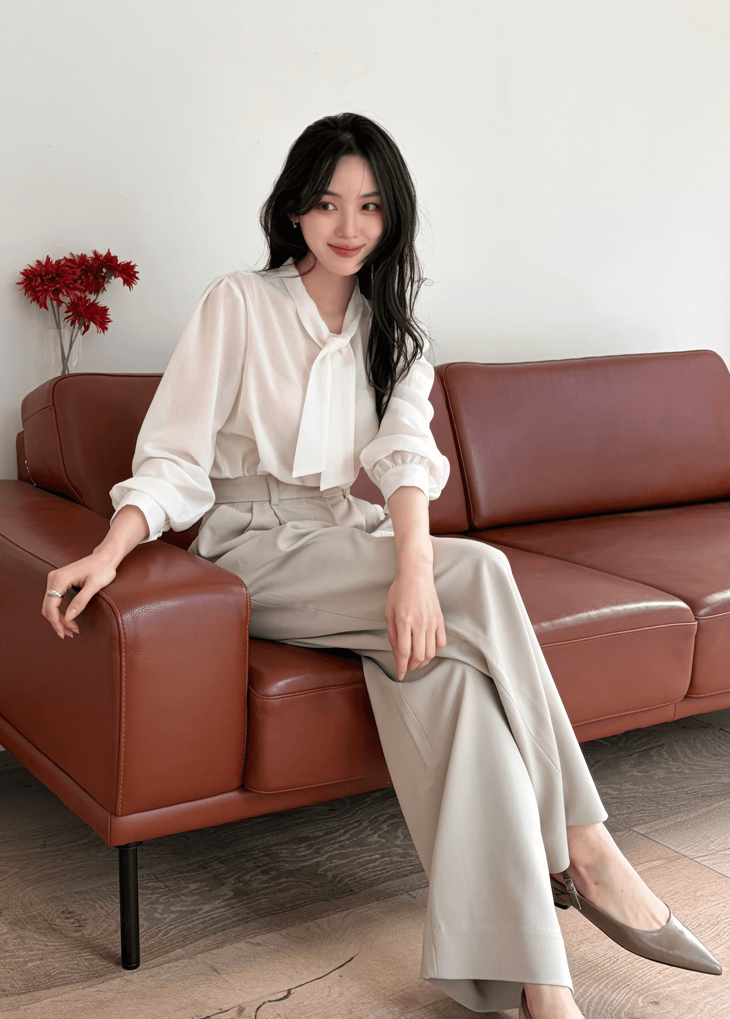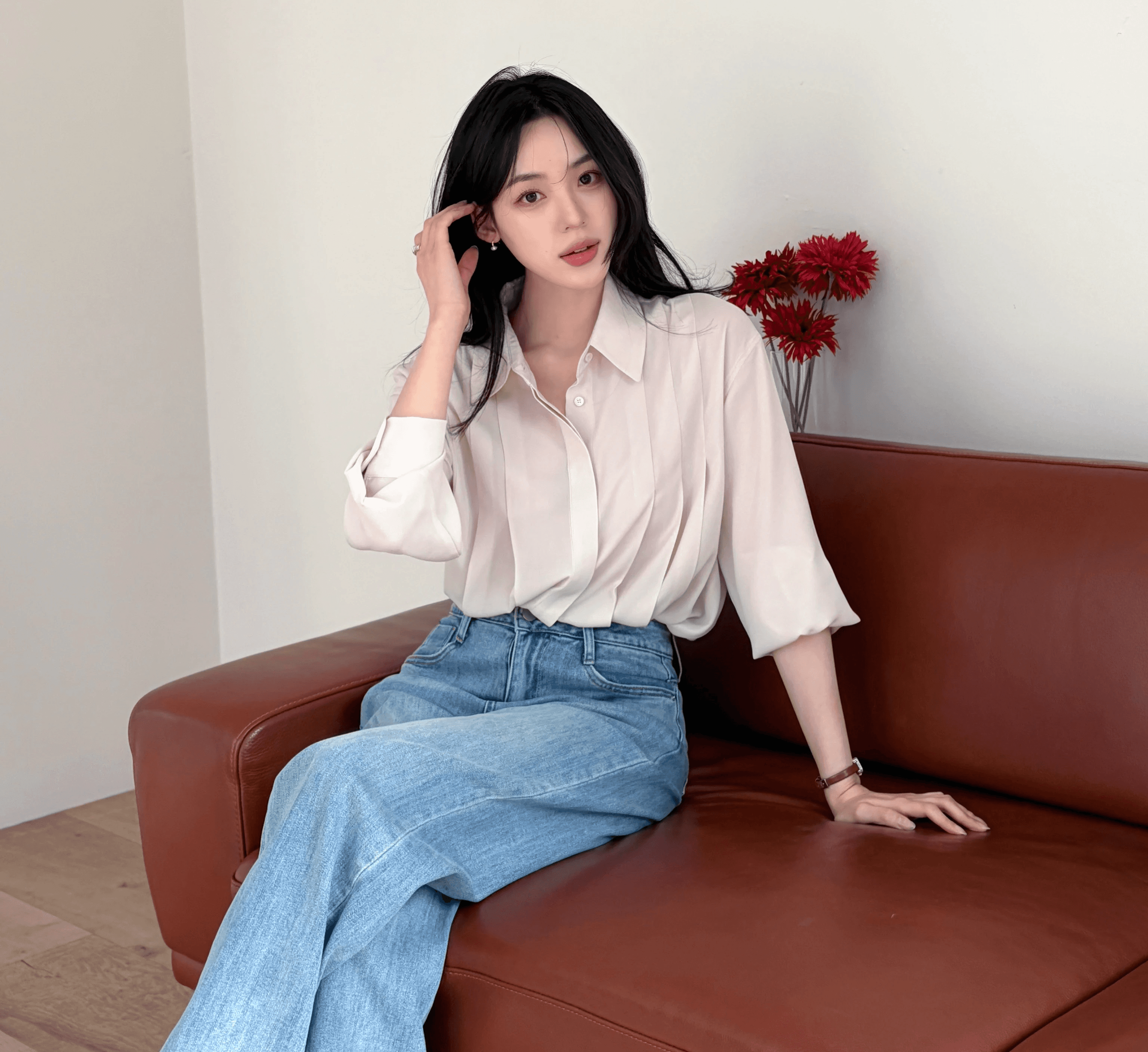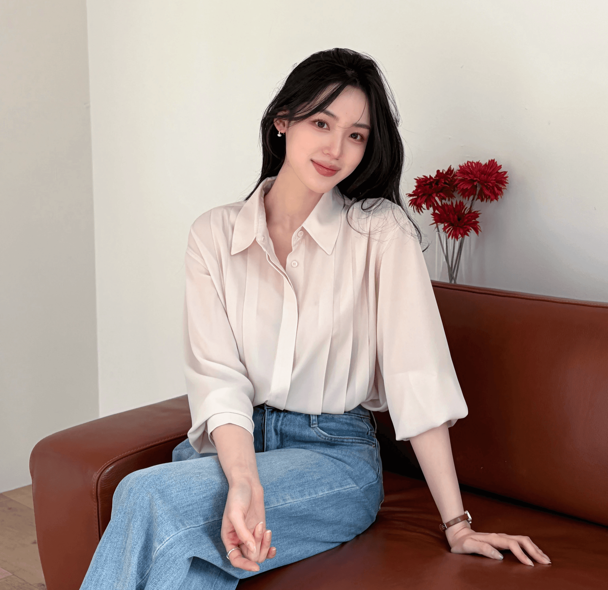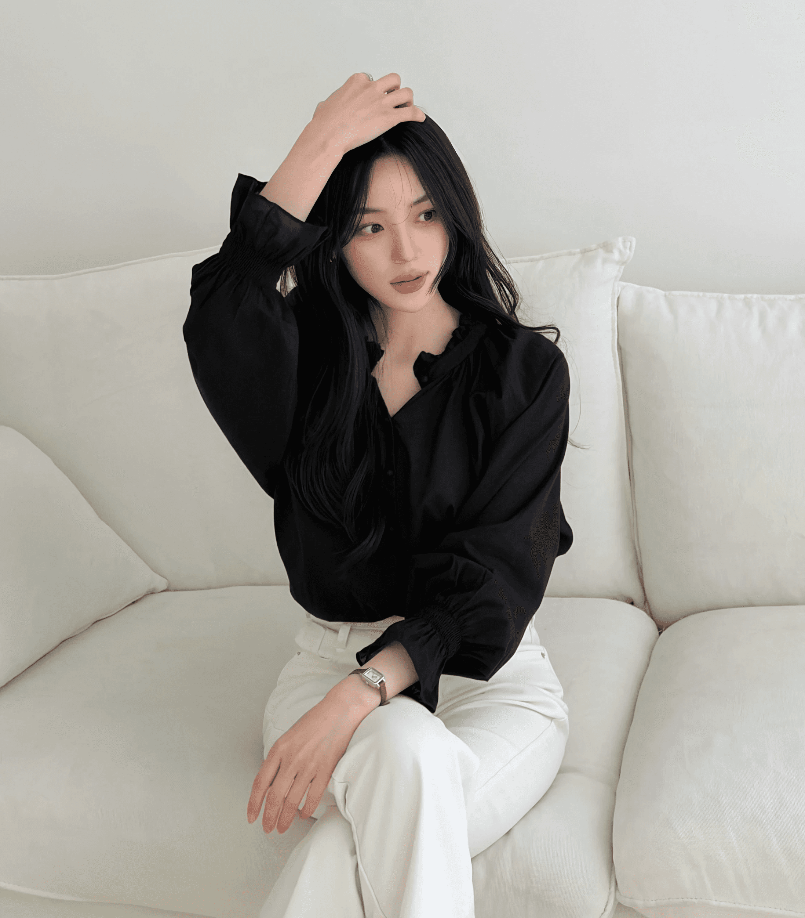 움직일 때마다 흐르듯 퍼지는 실루엣으로 가볍고 우아한 분위기를 완성하는 블라우스입니다. 전면의 세로 핀턱 디테일로 입체적인 구조감을 형성하며 세련된 라인을 완성합니다.