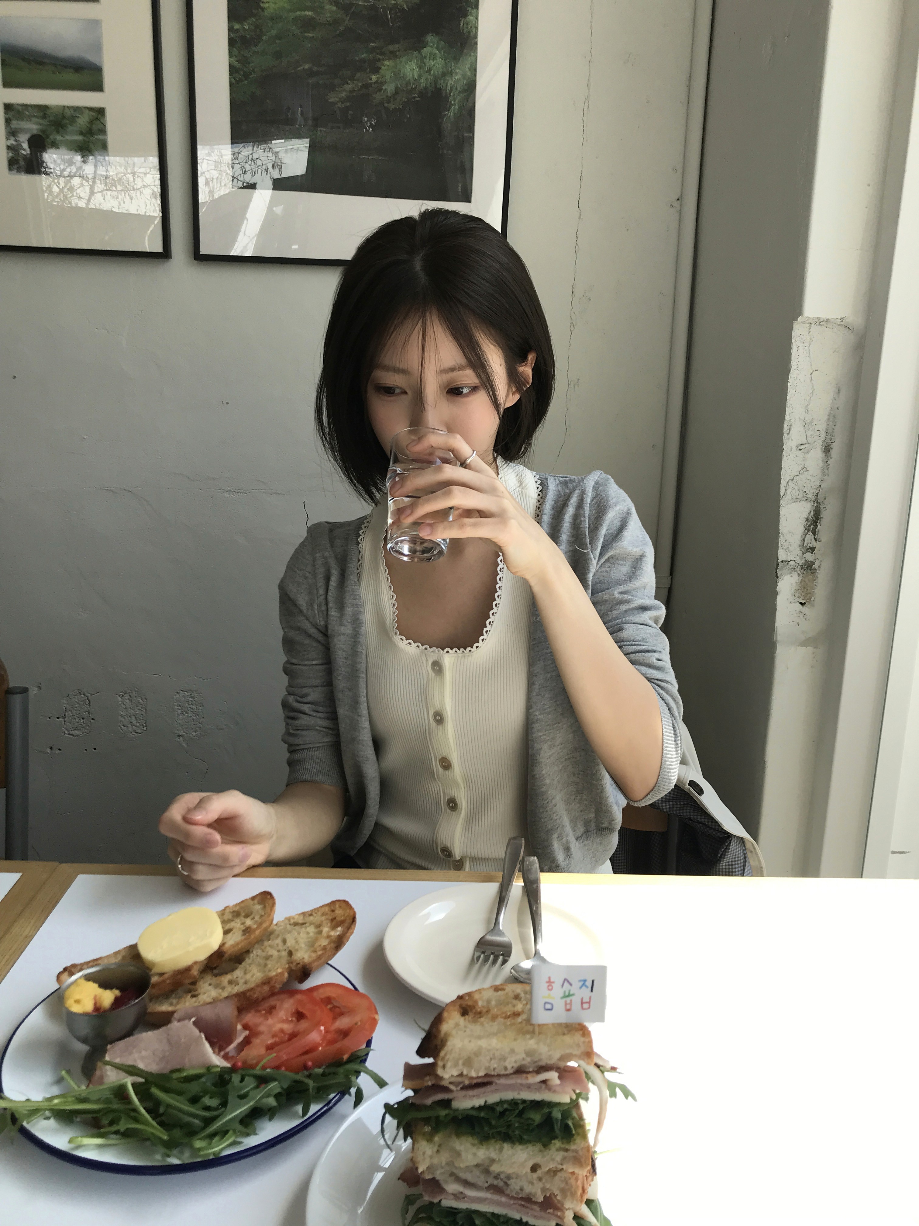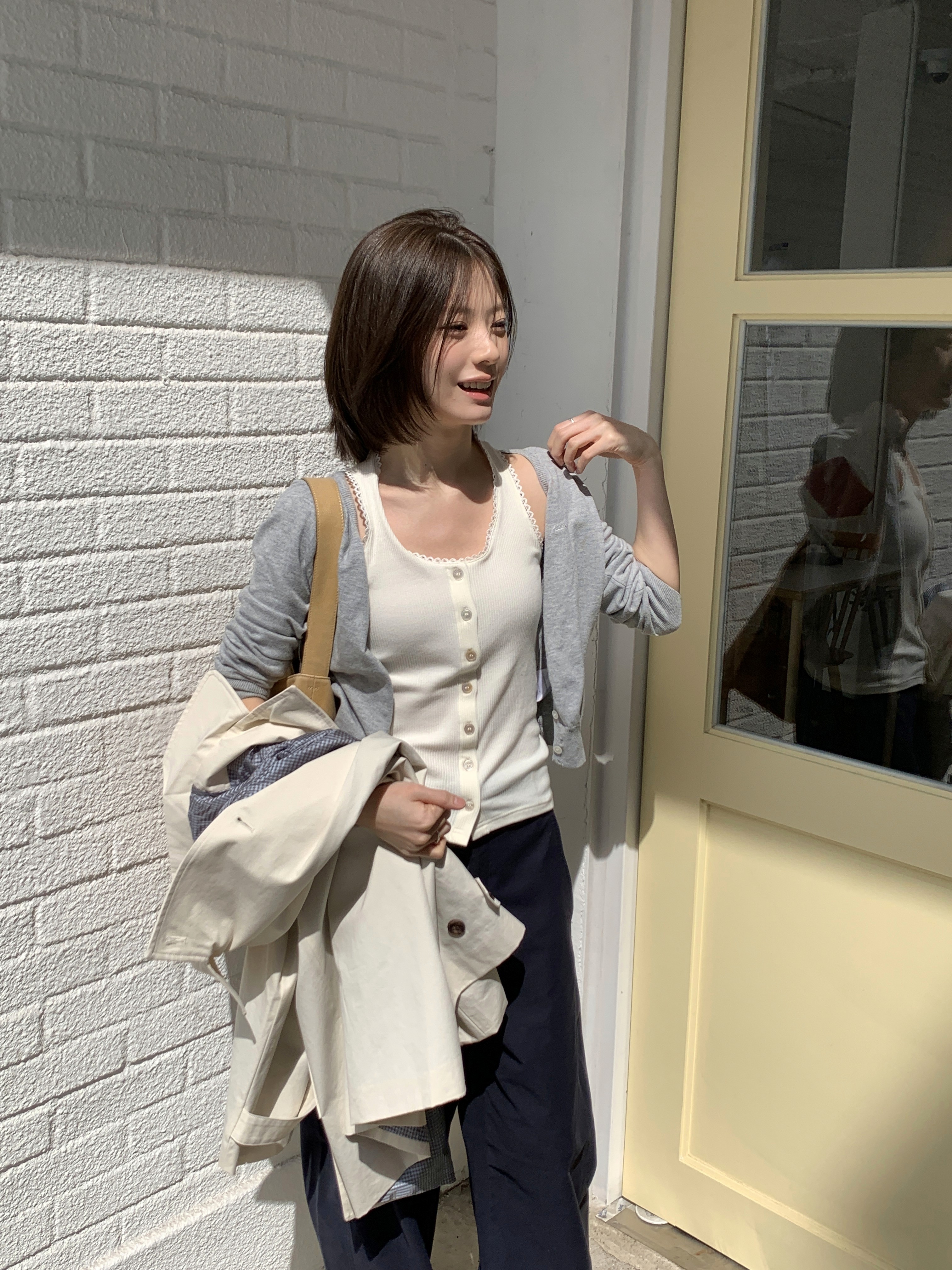 코튼,모달,스판 혼방 골지 원단으로 부드럽고 신축성이 뛰어난 탑입니다. 레이스 디테일과 자개 단추, 레터즈 라벨 포인트로 여성스러운 무드를 더해 단독 또는 레이어드 모두 활용도 높은 아이템입니다.