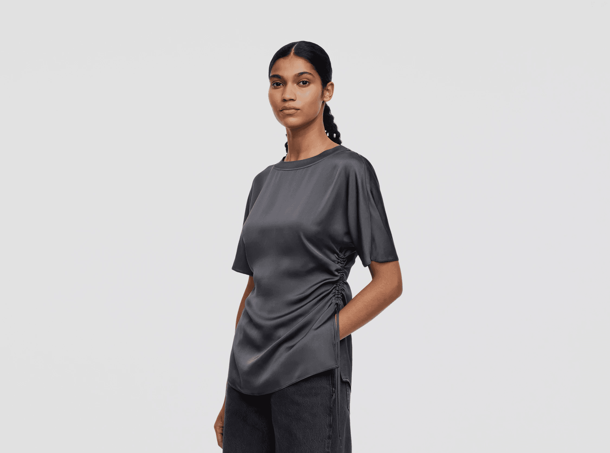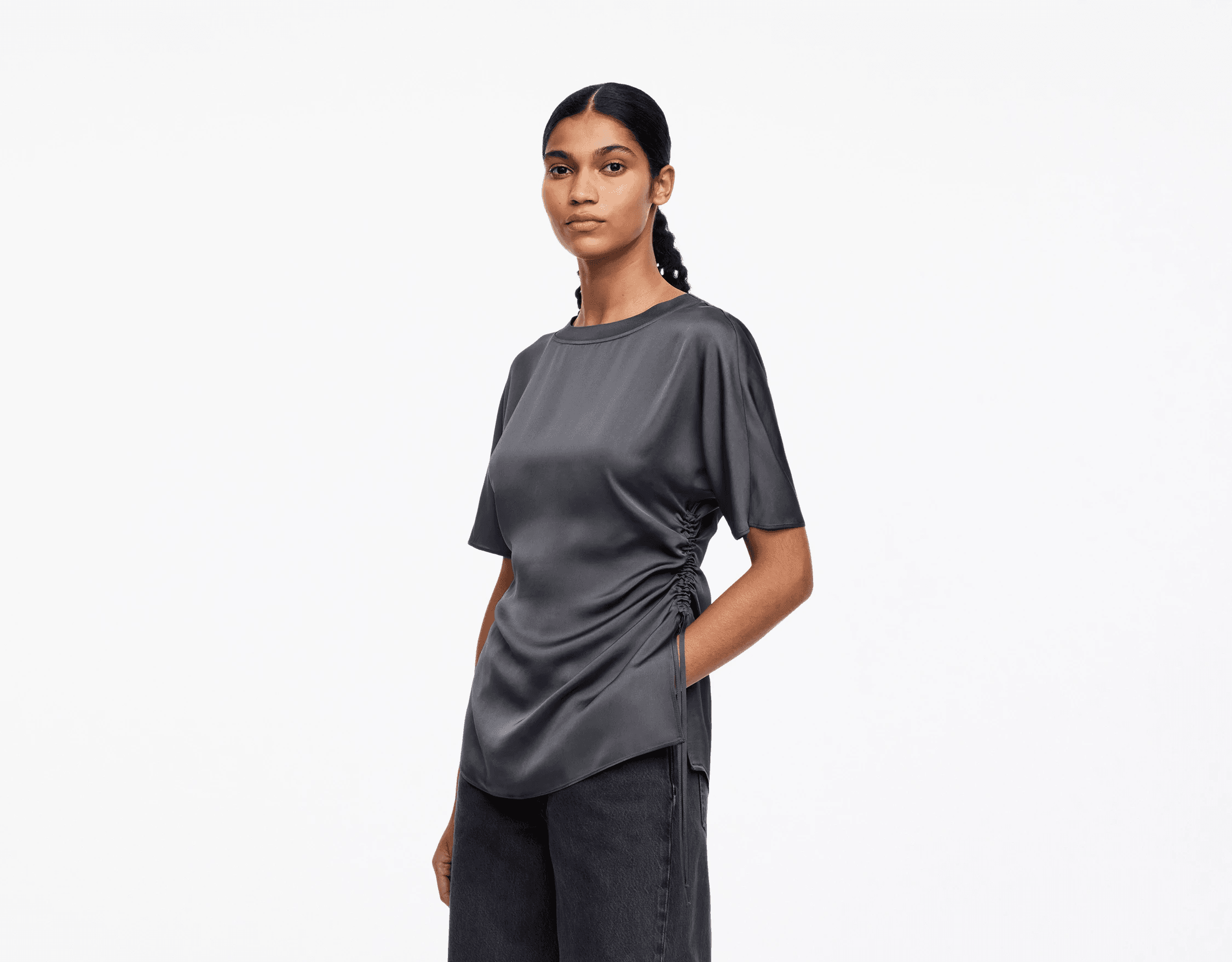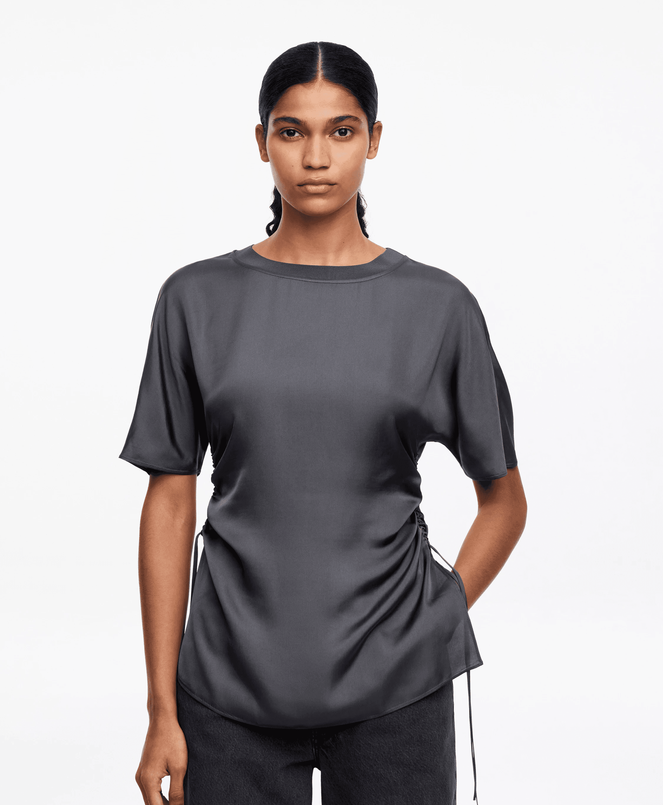 자연스러운 드레이프감이 매력적인 숏슬리브 탑. 사이드 드로스트링으로 허리를 조이면 또 다른 분위기가 완성되는, 아르켓의 신중한 디자인