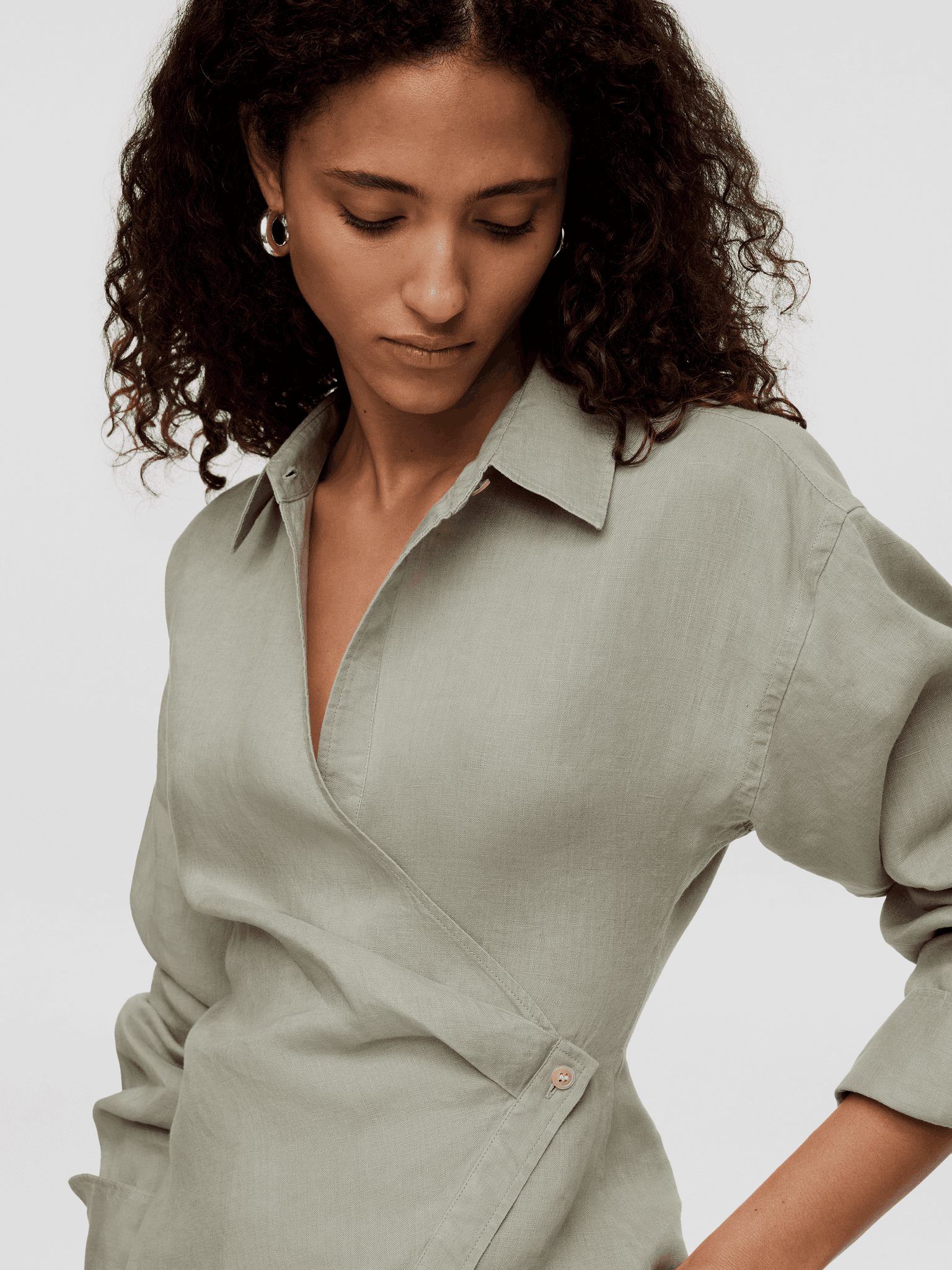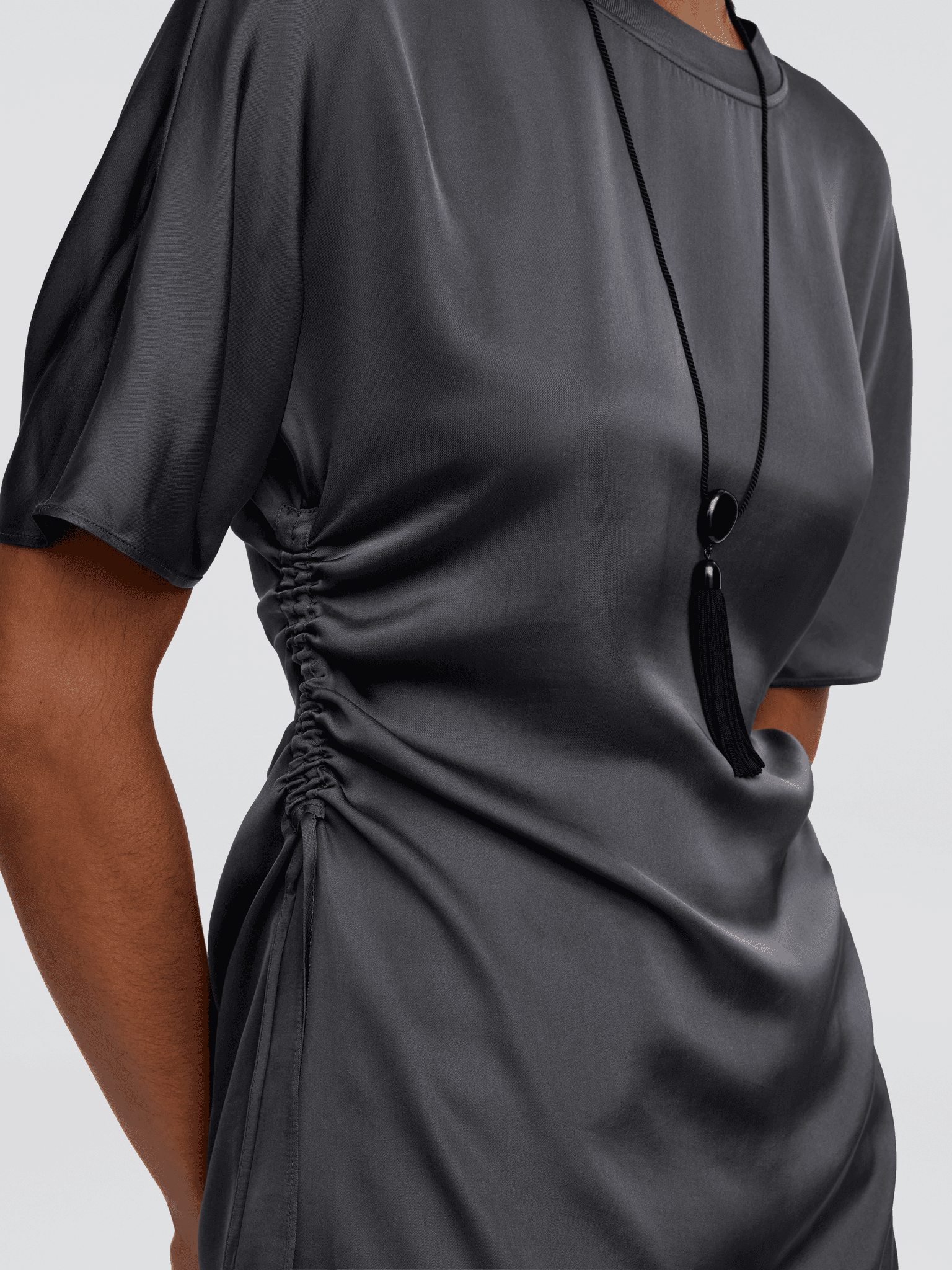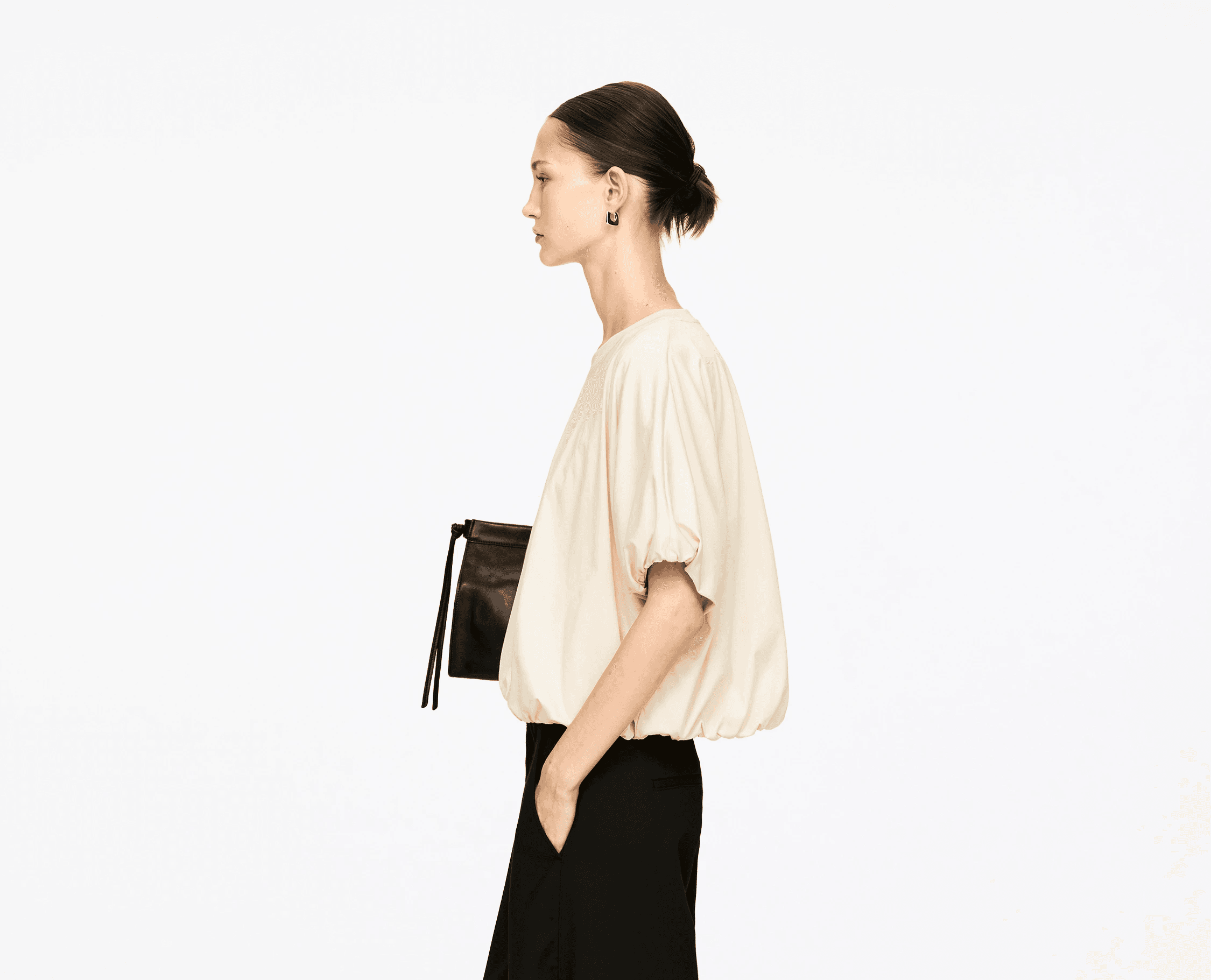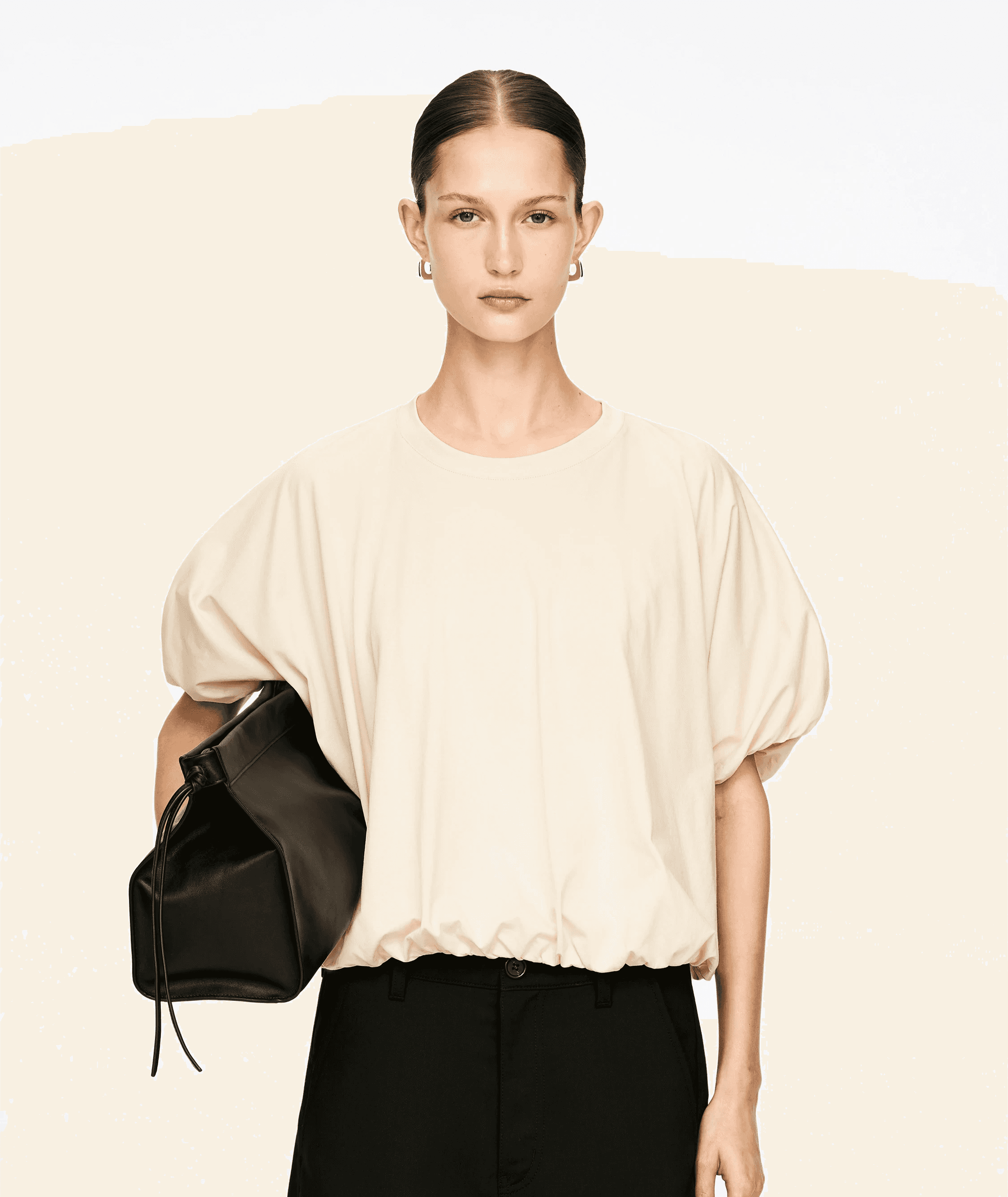 자연스러운 드레이프감이 매력적인 숏슬리브 탑. 사이드 드로스트링으로 허리를 조이면 또 다른 분위기가 완성되는, 아르켓의 신중한 디자인