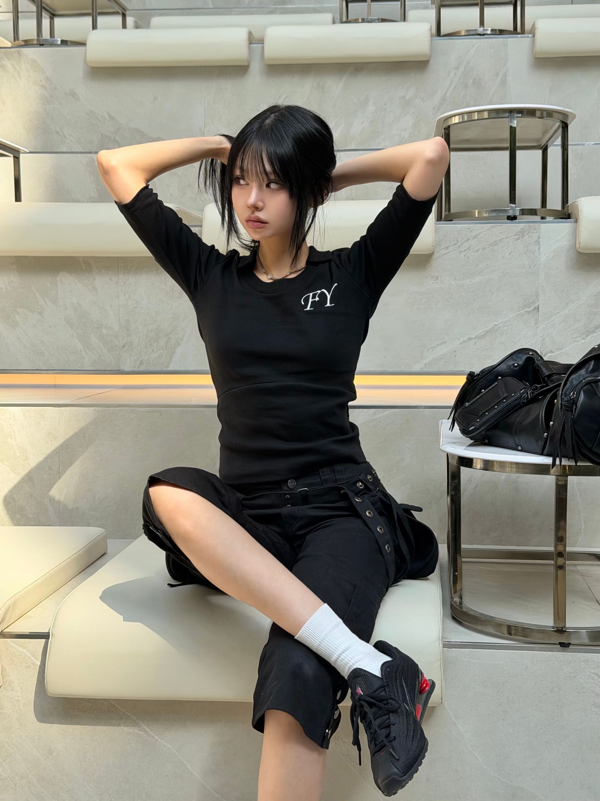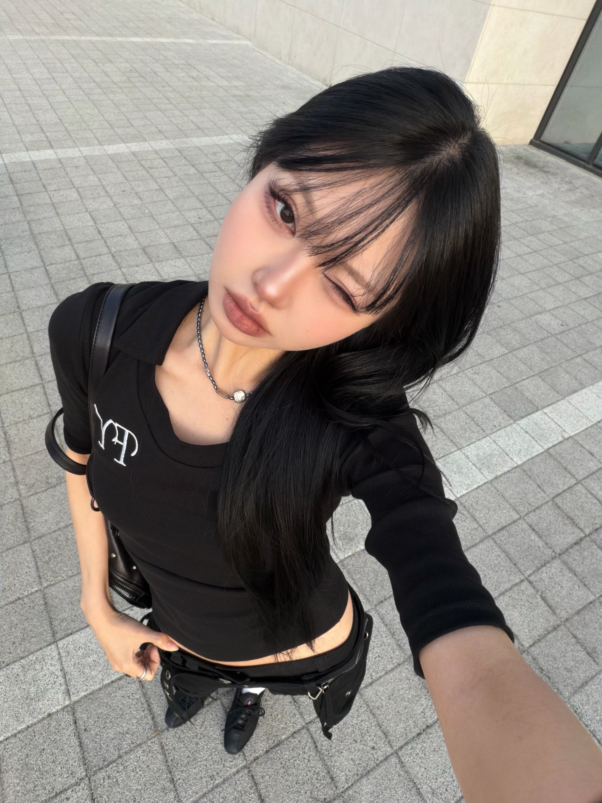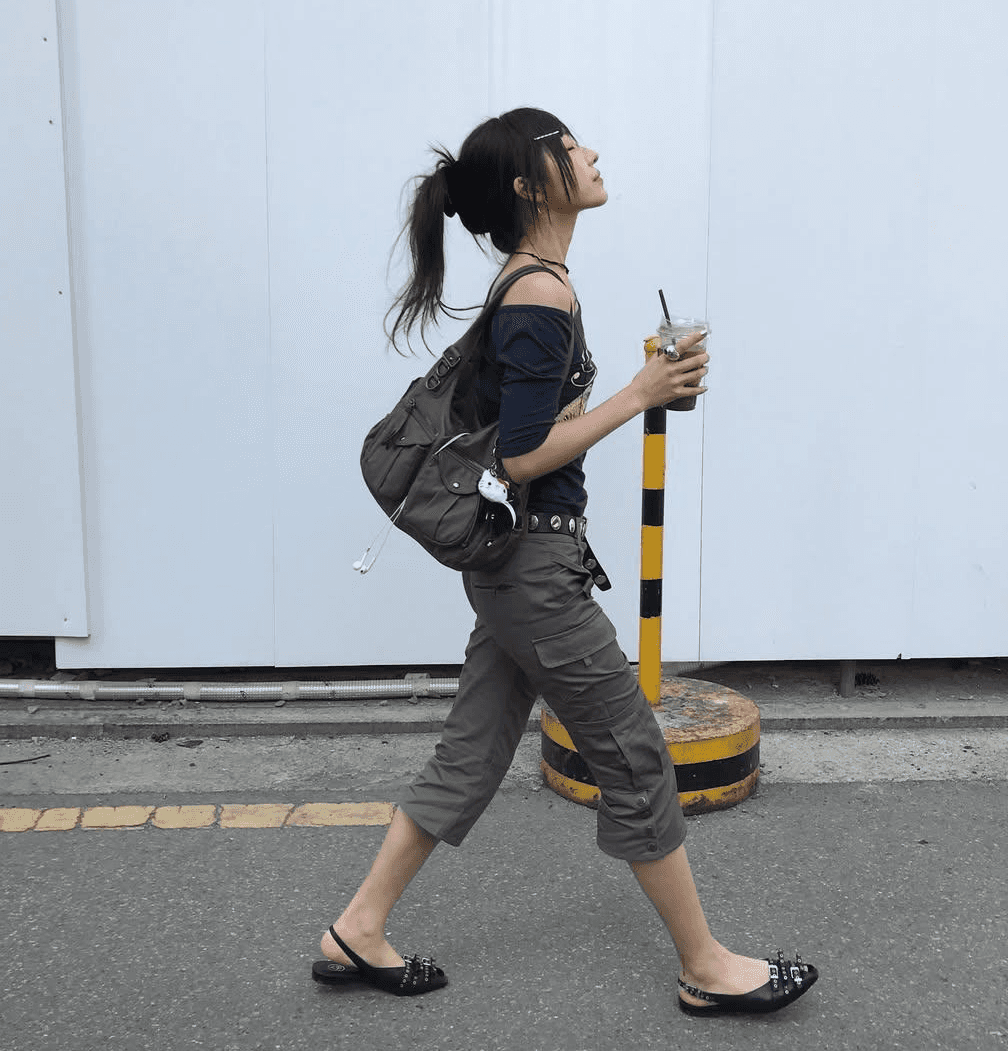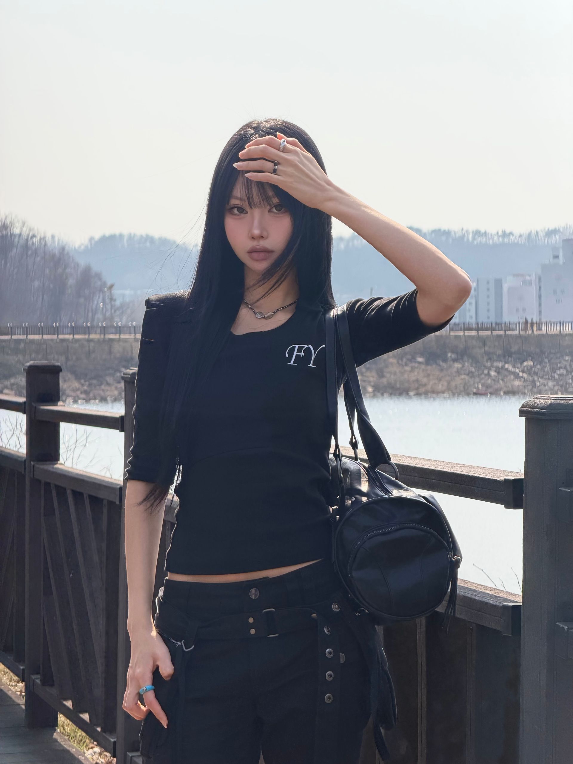 올 블랙으로 완성한 시크한 무드. U넥 7부 탑과 슬림핏 카프리 팬츠로 구조적인 실루엣을 살렸어요. 카고 벨트백을 레이어드해 스커트처럼 연출하고, 스터드 포인트의 보스턴백과 미니 월렛으로 스타일과 실용성을 모두 담았습니다.