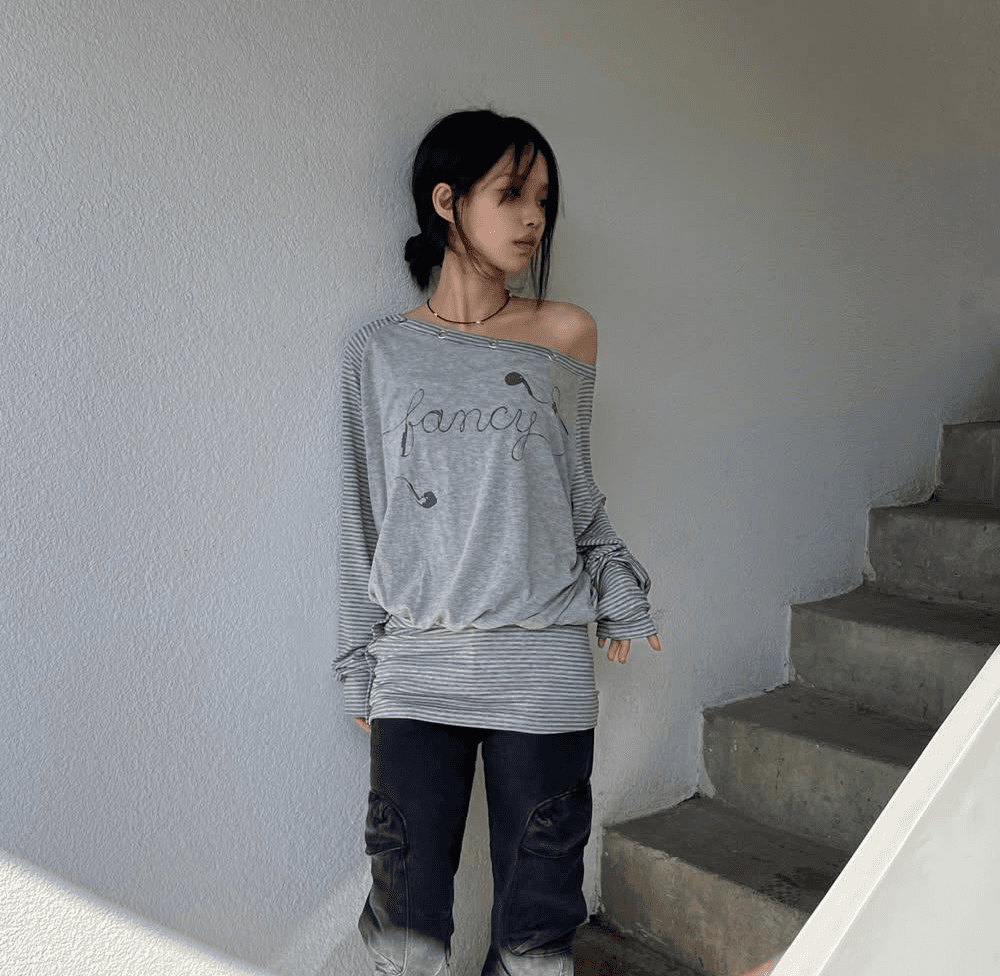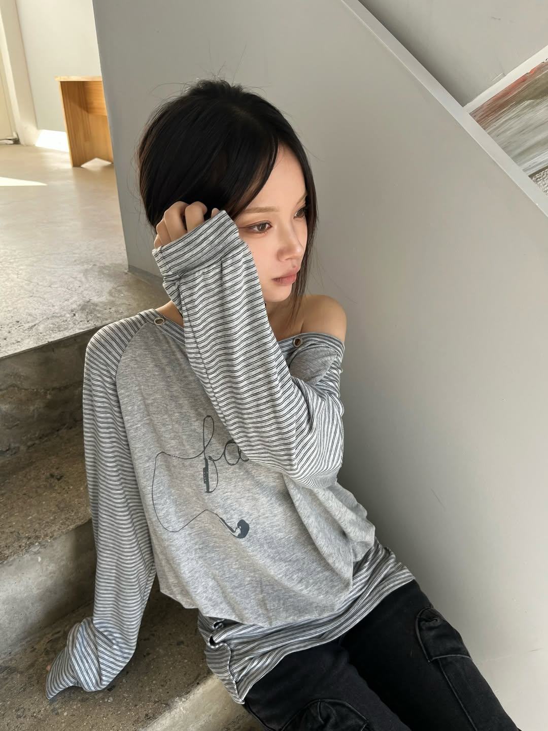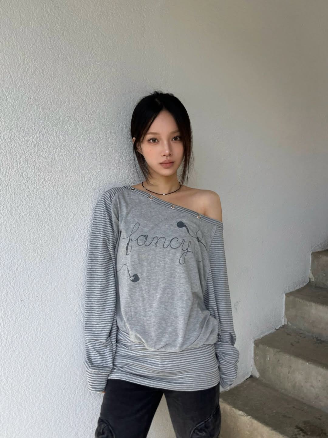 부드러운 톤온톤 스트라이프와 솔리드 배색이 만드는 빈티지 무드 티셔츠 스타일링. 넥라인 아일렛과 숄더 스냅 단추로 디테일을 더했어요. 밑단 스냅으로 길이 조절이 가능해 미니 원피스로도 연출할 수 있는 투웨이 아이템입니다.