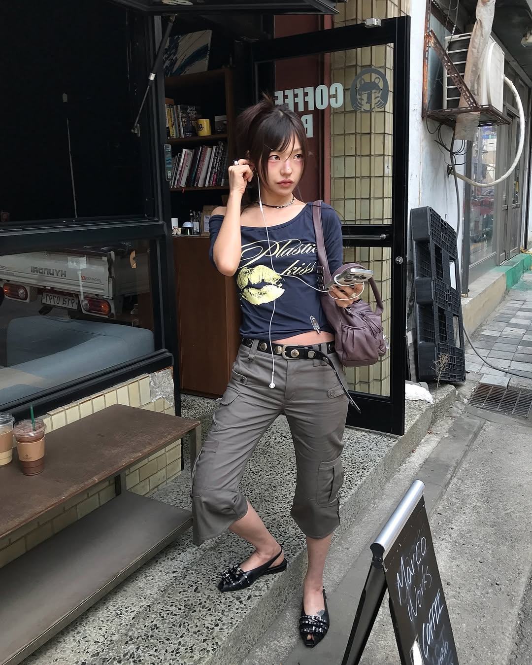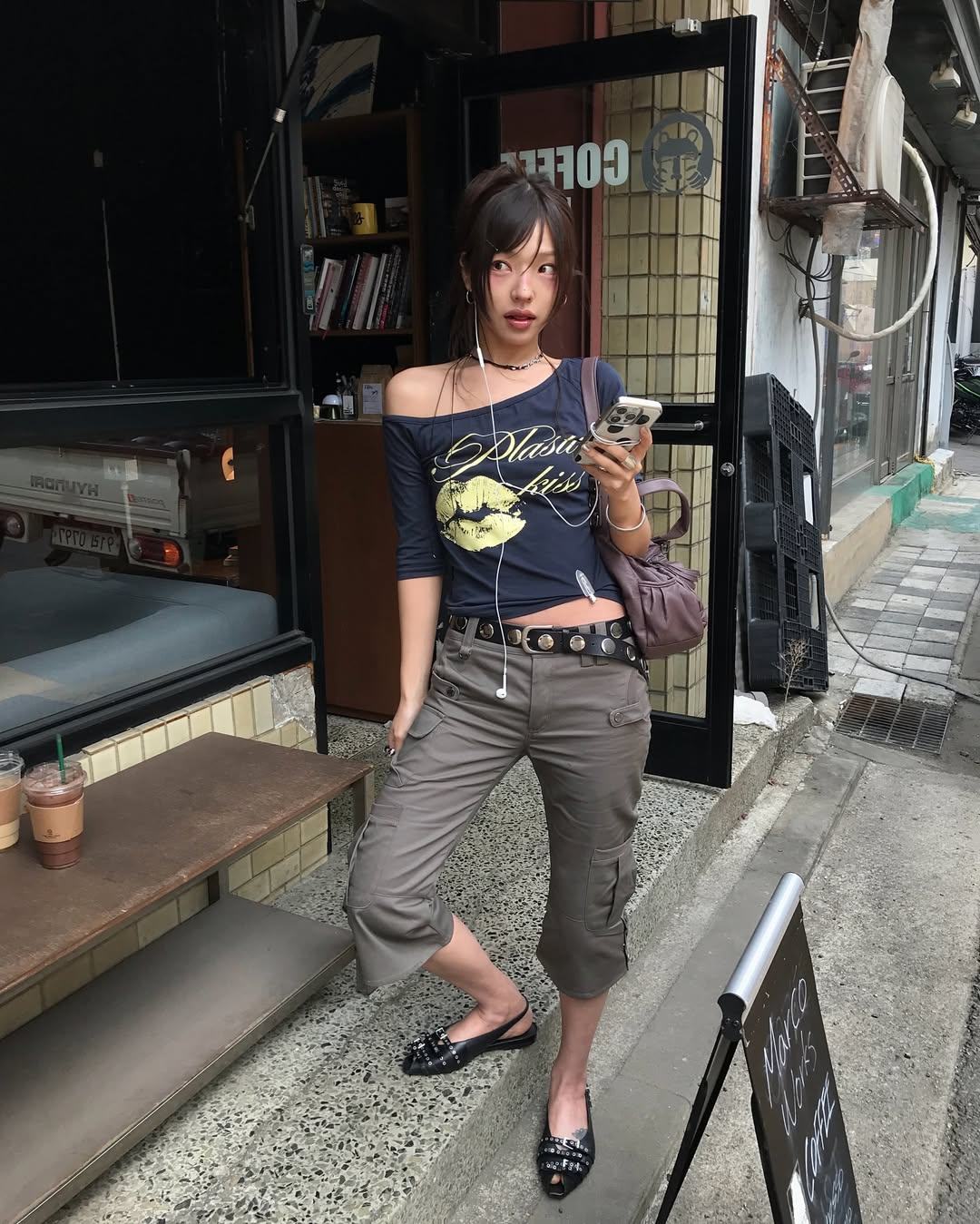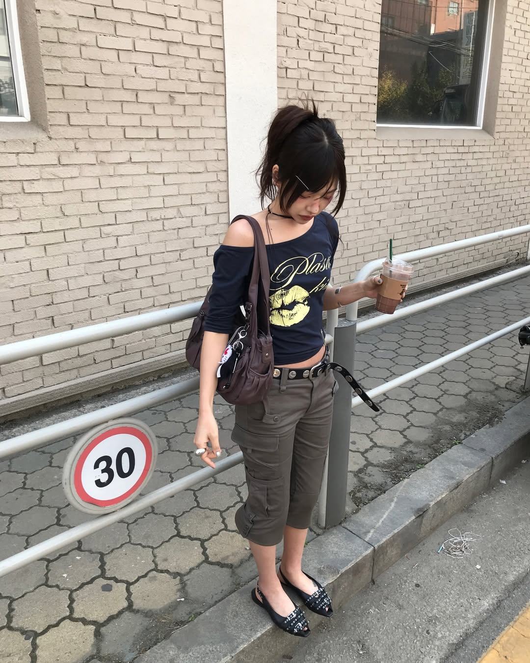 레몬색 그래픽이 돋보이는 네이비 원숄더 탑, 깔끔한 다크 베이지 카프리 팬츠, 플랩 포켓이 매력적인 호보백으로 완성한 빈티지 Y2K 무드 스타일링 입니다.