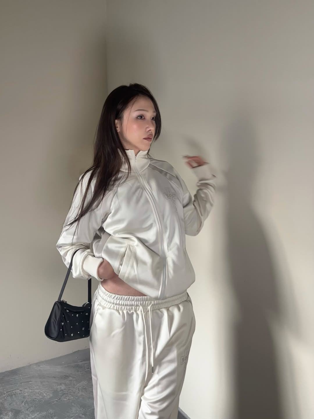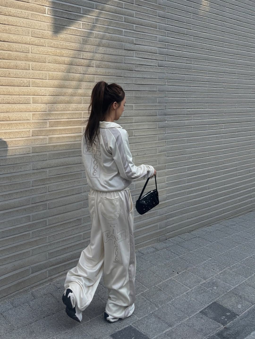 글로시한 원단의 트랙 셋업으로 완성하는 스포티 무드. 아이보리 컬러에 톤온톤 배색 디테일을 더해 세련된 분위기를 살리고, 등판의 시즌 그래픽이 포인트를 더합니다.