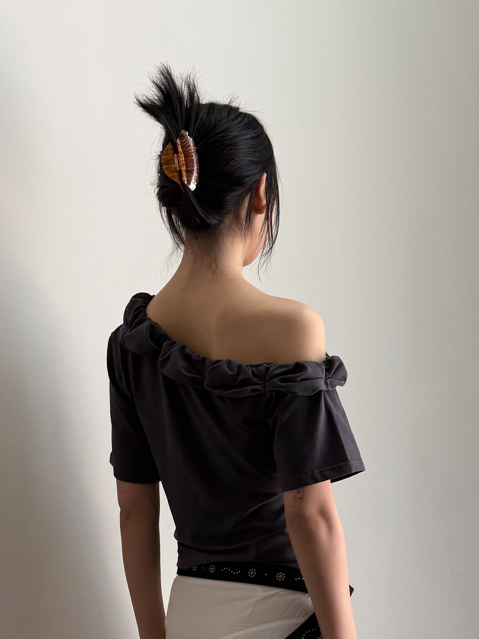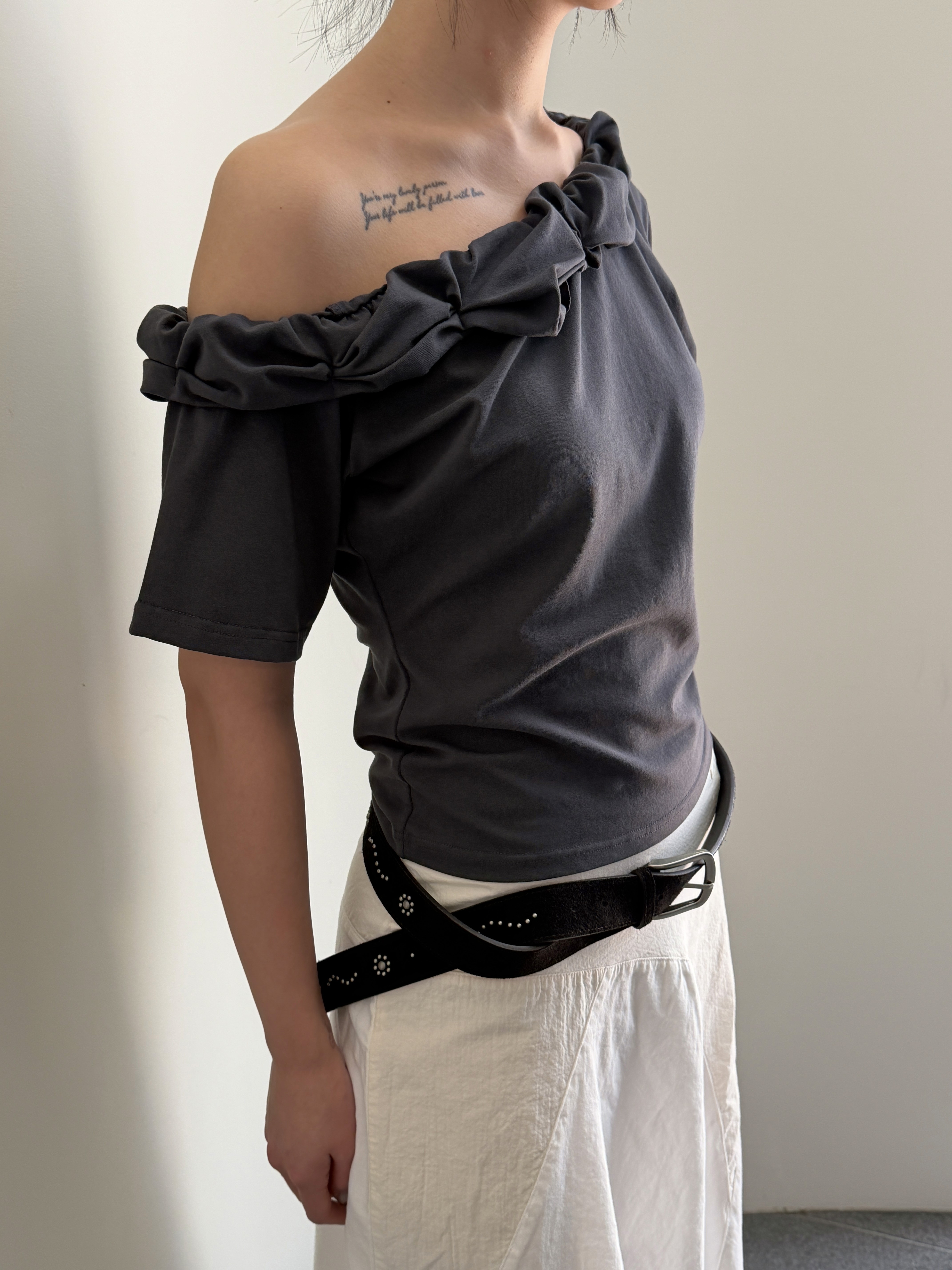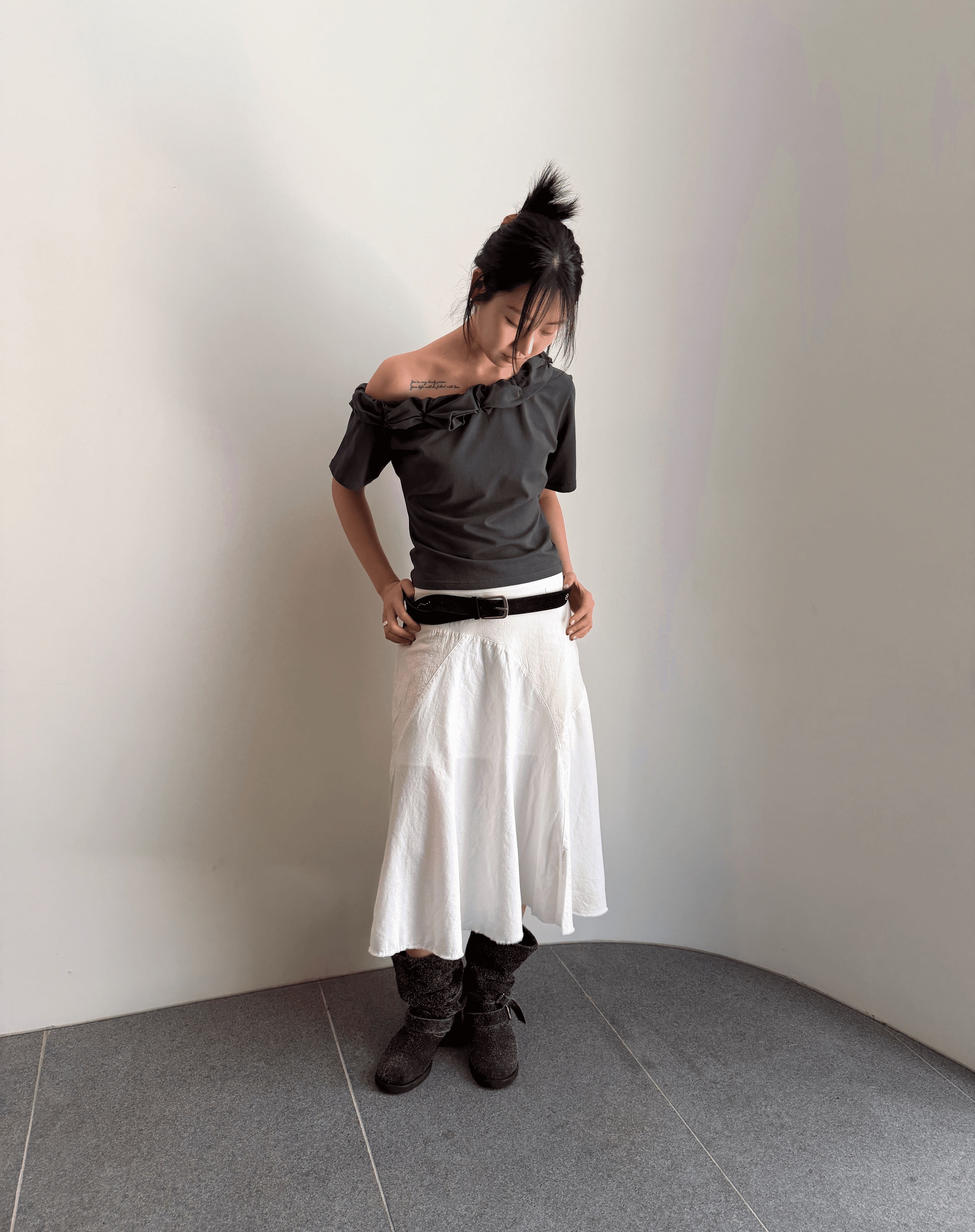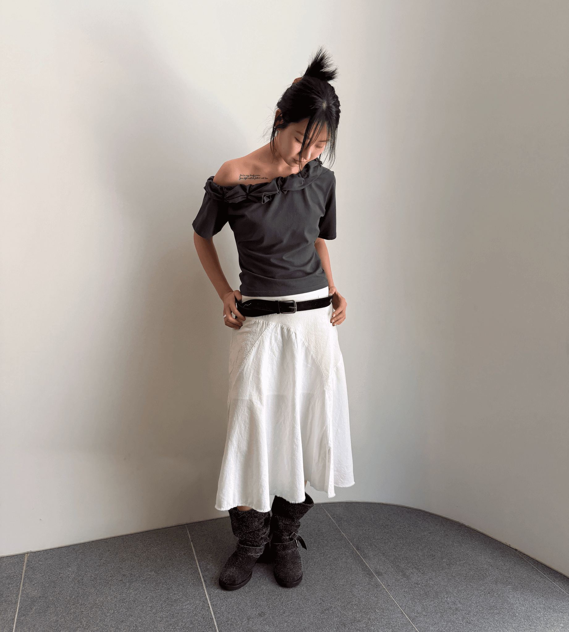 꼬인 디테일의 원숄더 탑과 시어한 미디스커트
