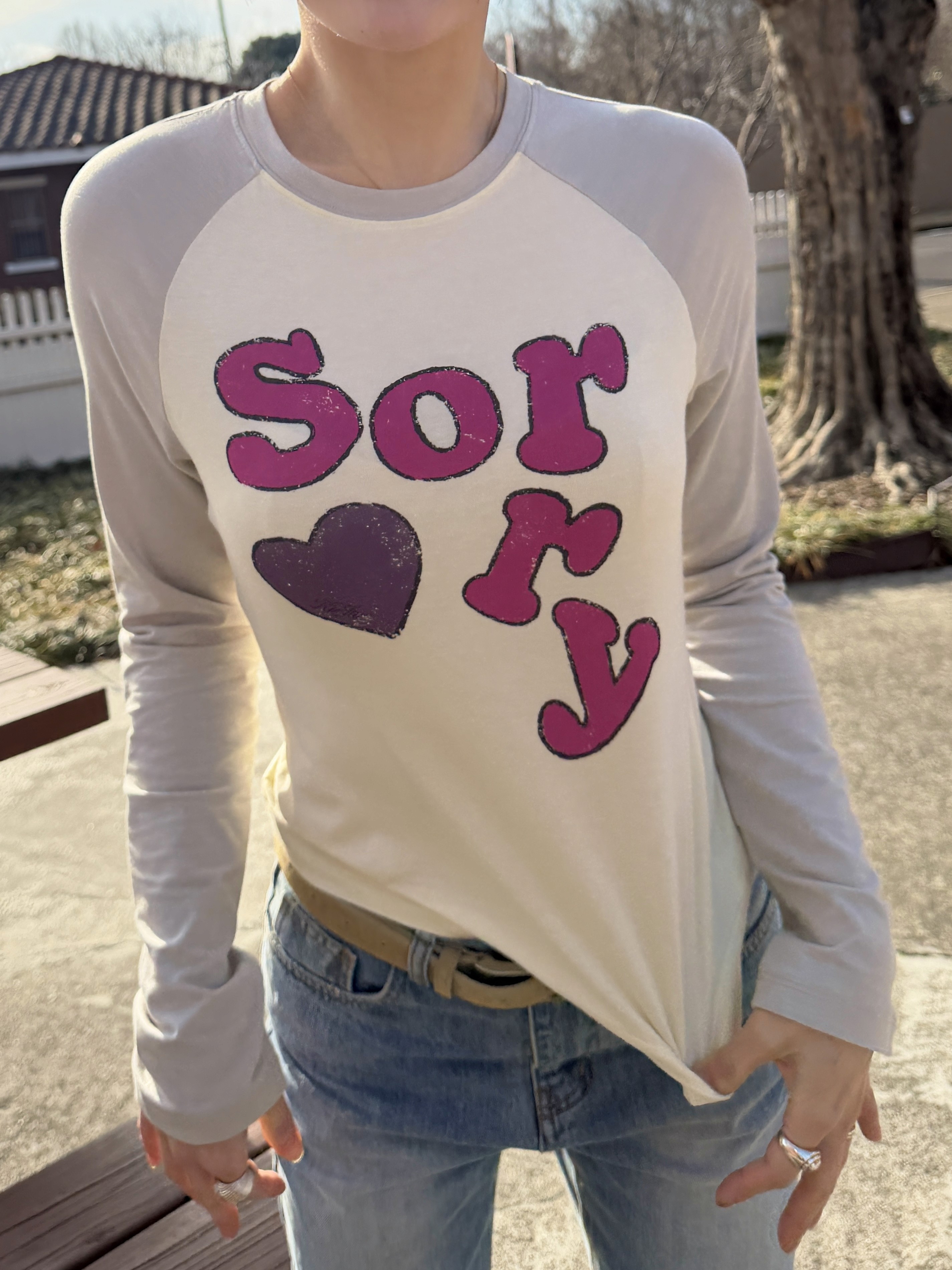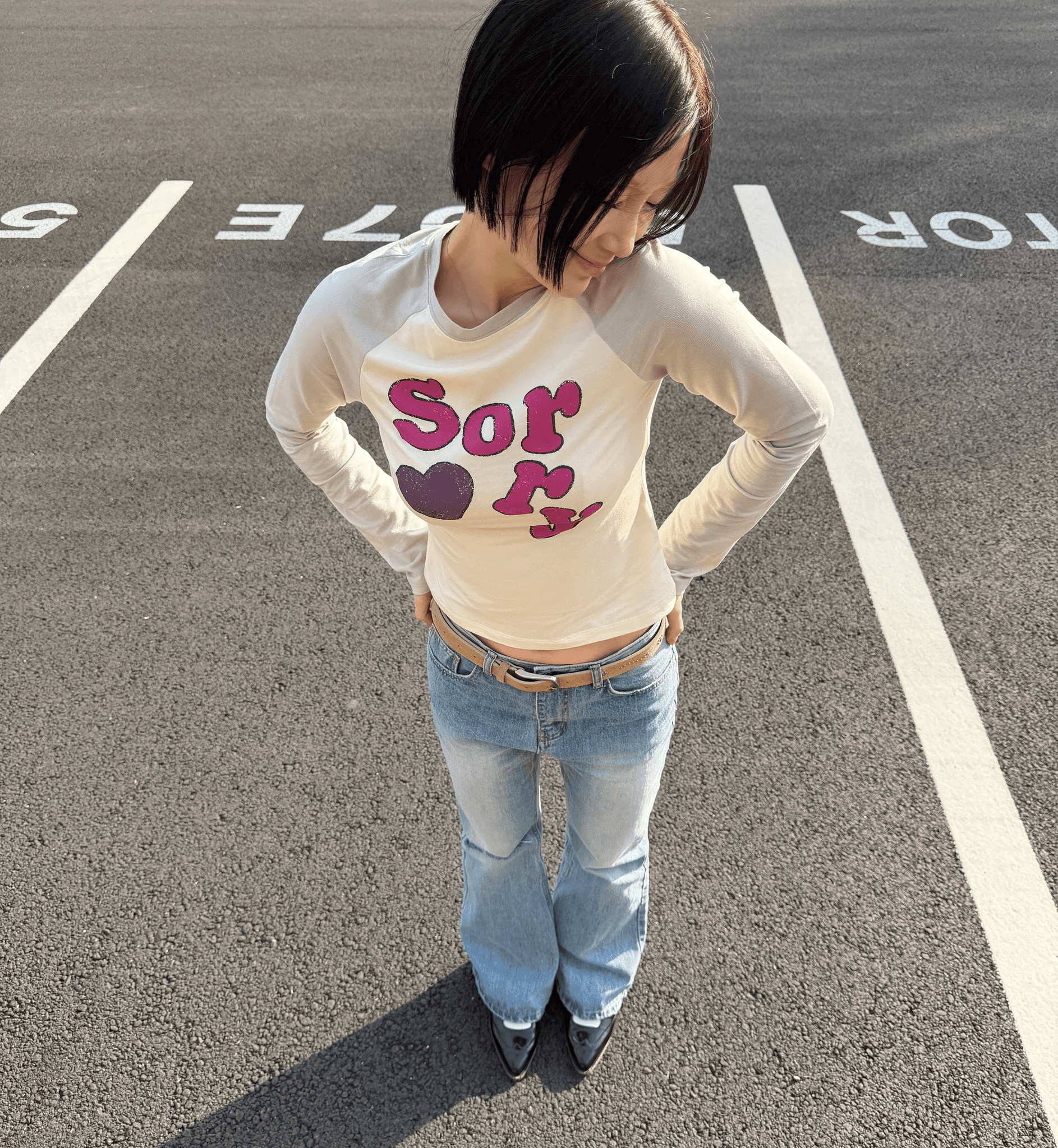 볼드한 그래픽 포인트의 티셔츠와 커팅이 매력적인 데님 팬츠
