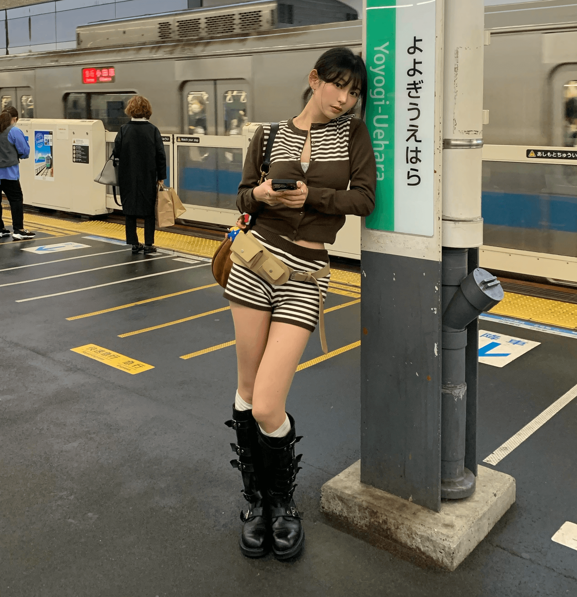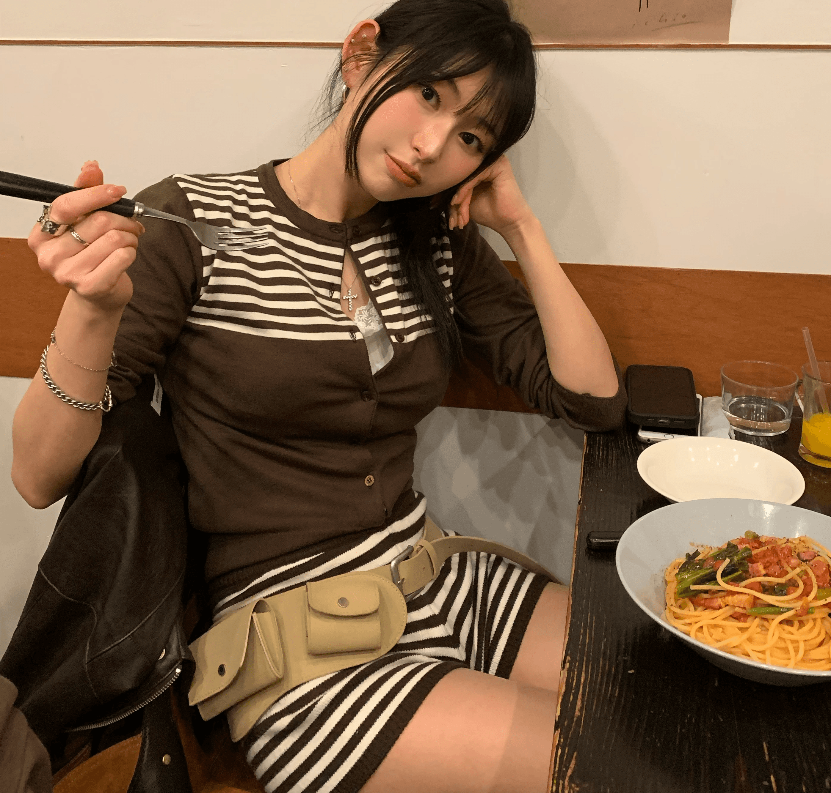 날씬해보이는 스트라이프 배색의 포인트 셋업