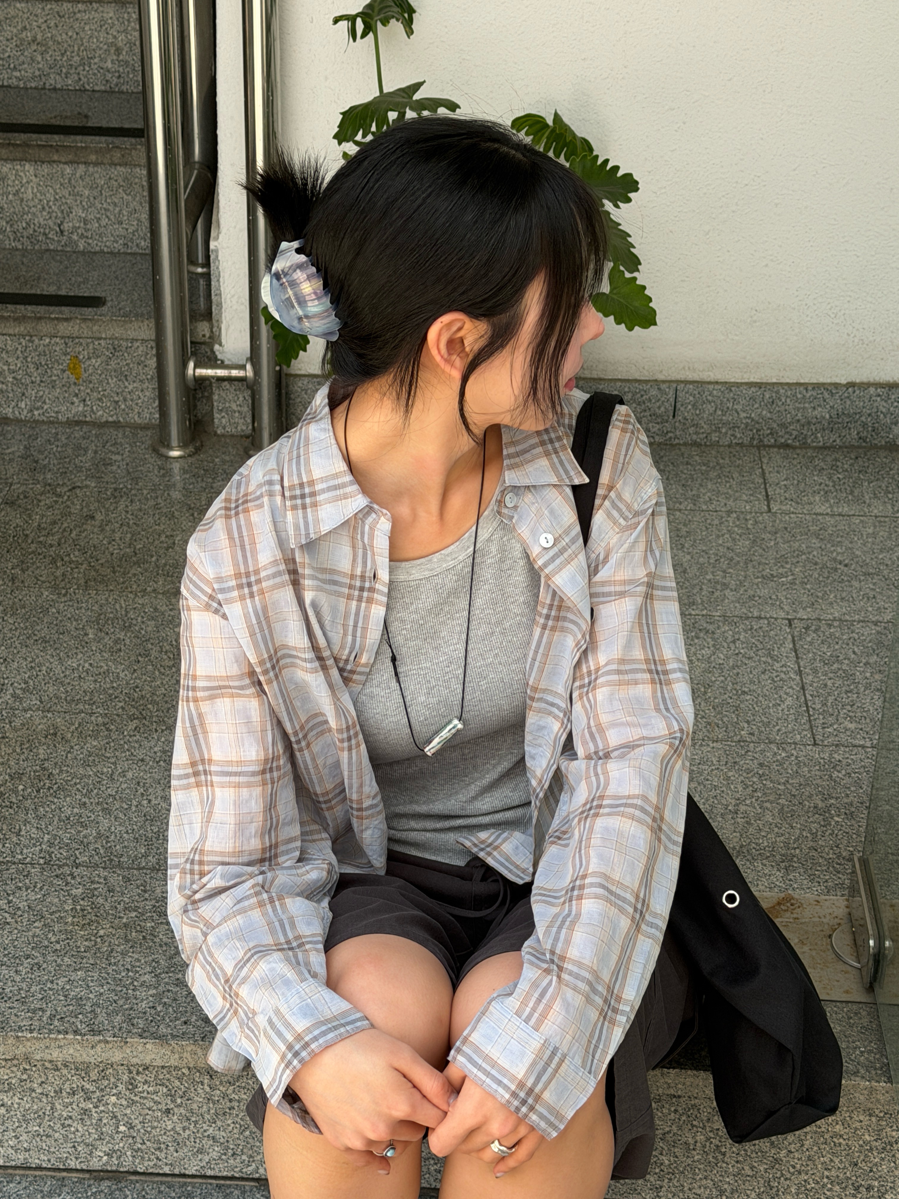 시어한 체크 패턴의 셔츠와 빈티지한 무드의 워싱 버뮤다쇼츠