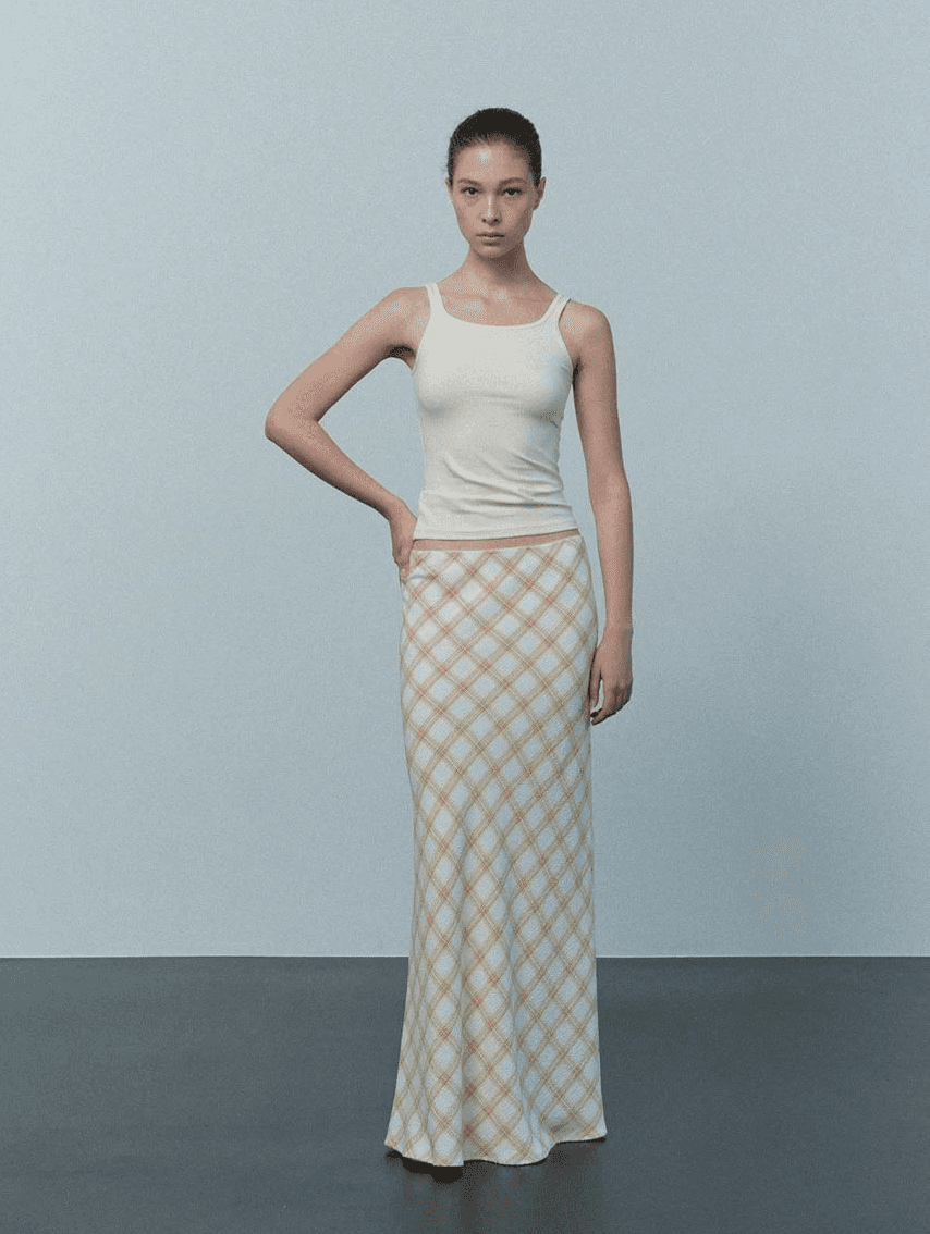 맥시한 기장감과 바이어스 컷팅이 어우러져 우아하게 흐르는 실루엣을 완성하는 체크 스커트입니다. 체형에 맞게 자연스럽게 떨어지는 라인과 경쾌한 컬러감의 체크 패턴이 조화를 이루며 스타일에 생기를 더해줍니다.