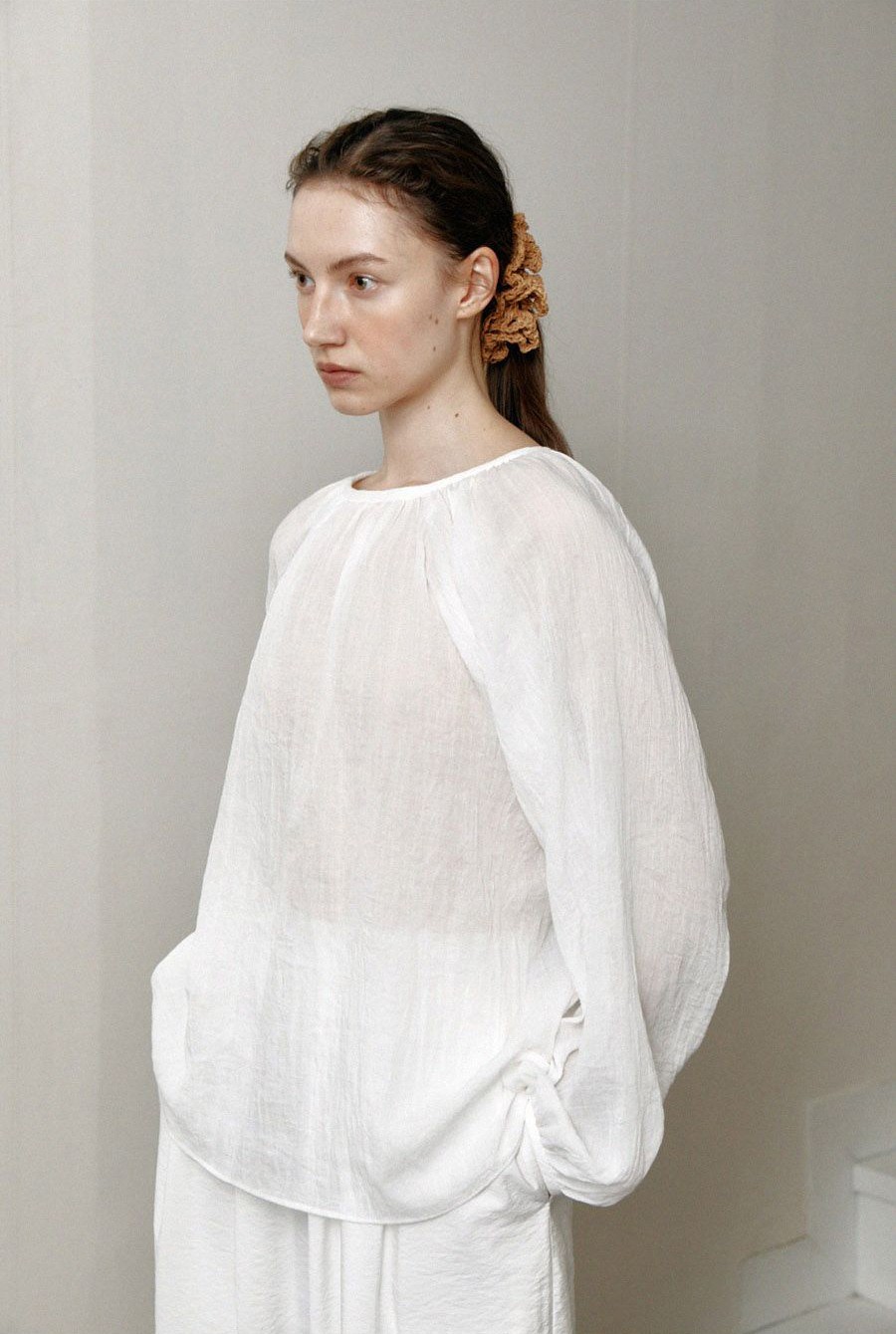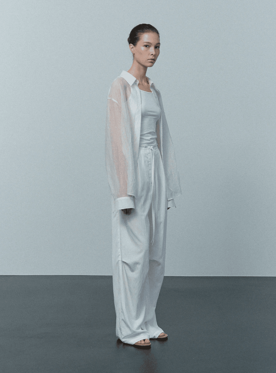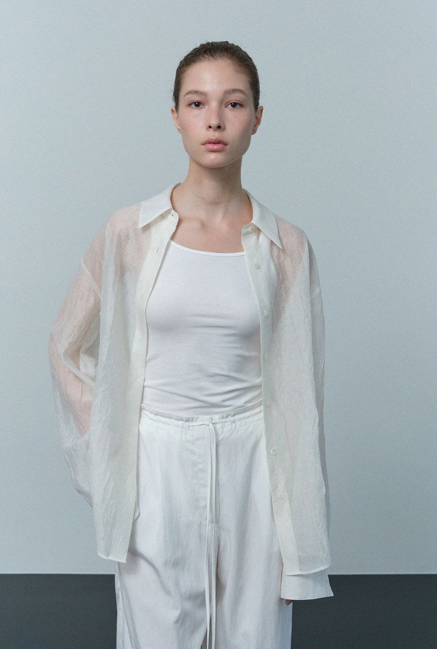 은은하게 비치는 시어한 소재감과 자연스럽게 잡힌 크링클 주름이 어우러진 셔츠입니다. 부드럽고 유연하게 흐르는 실루엣으로 가볍게 걸치기만 해도 세련된 무드를 연출할 수 있습니다.